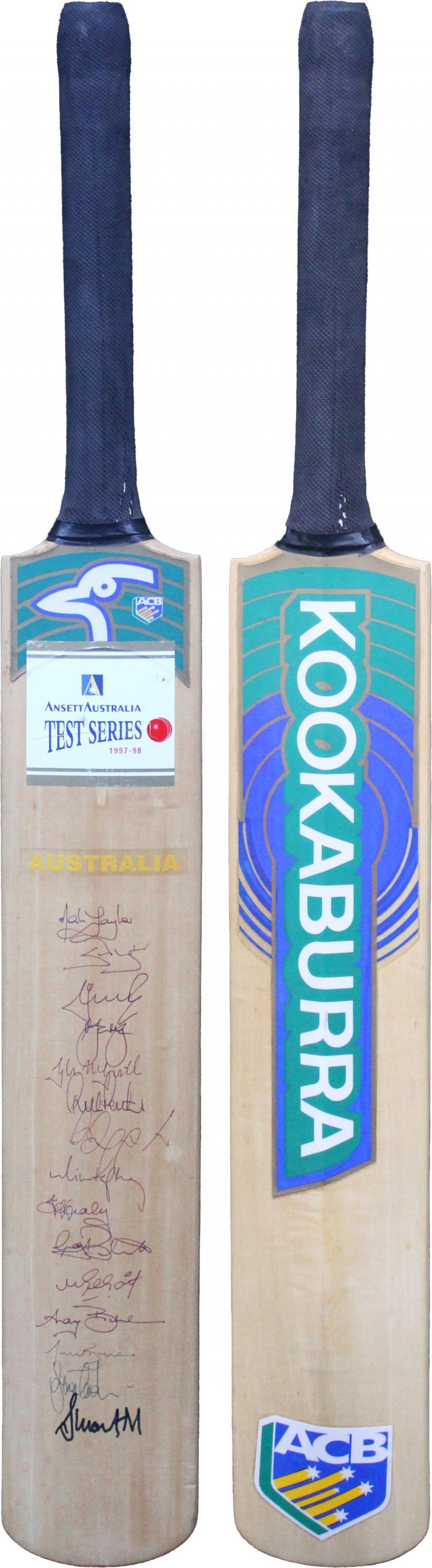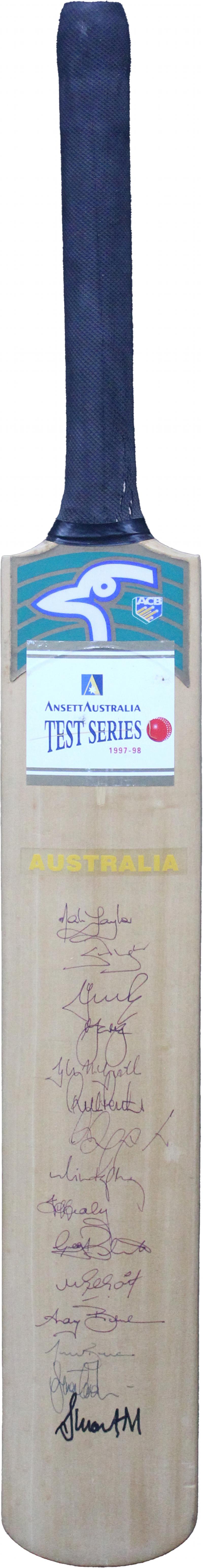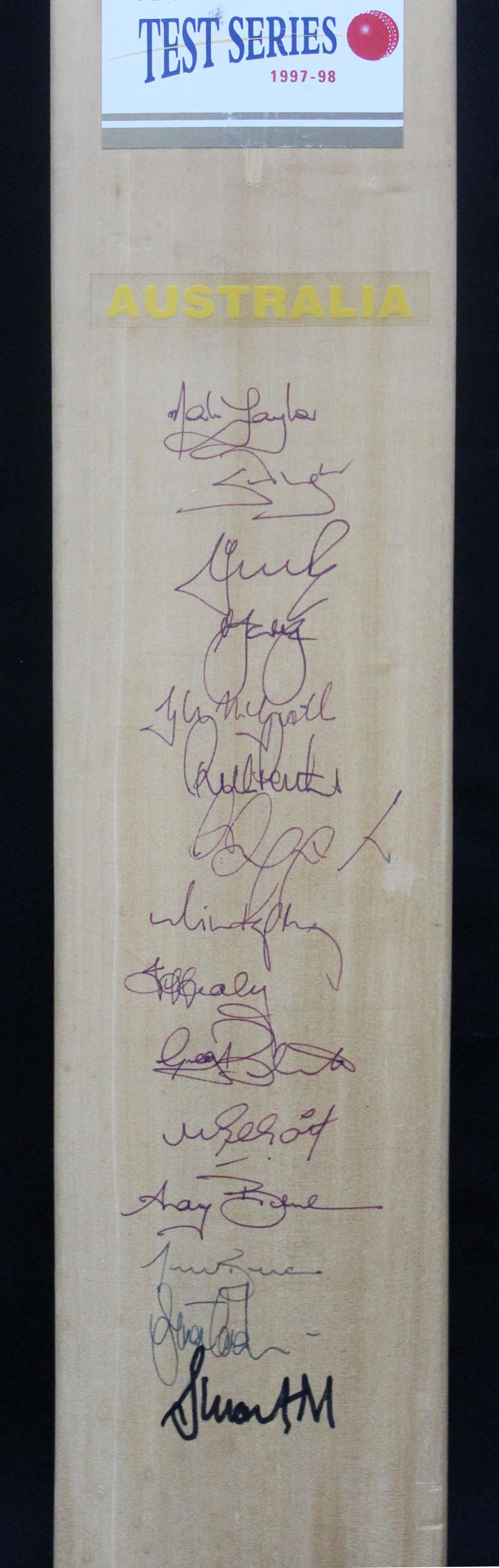 1997 Australian Team 'Kookaburra' cricket bat with 15 signatures including Mark Taylor (captain), Greg Blewett, Shane Warne & Andy