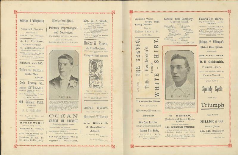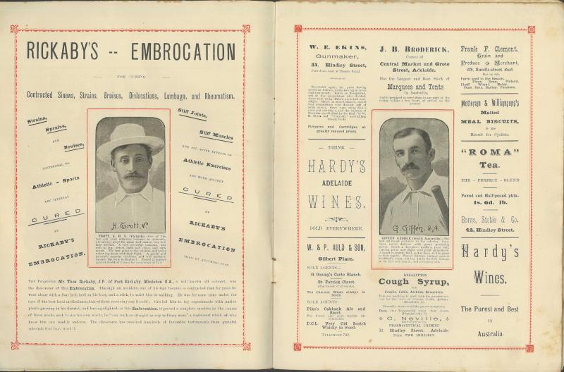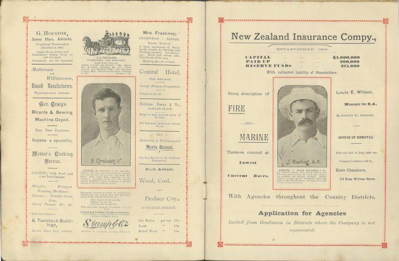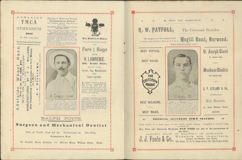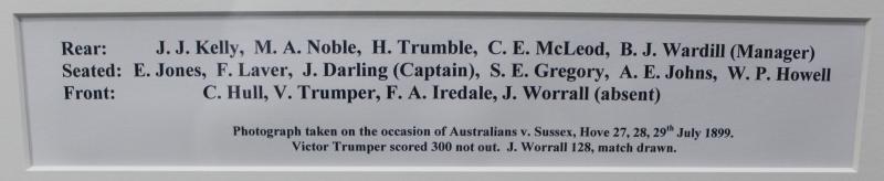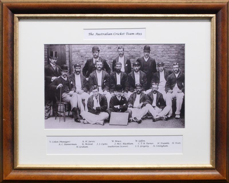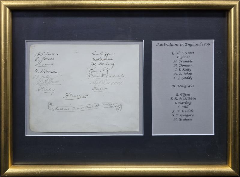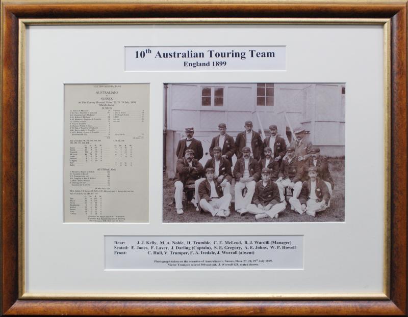 Harry Trott, Ernie Jones, Hugh Trumble, Harry Donnan, James Kelly, Alfred Johns, Charles Eady, George Giffen, Tom McKibbin, Joe Darling, Clem Hill, Frank Iredale, Syd Gregory, Harry Graham & Harry Musgrove (manager), window mounted with list of