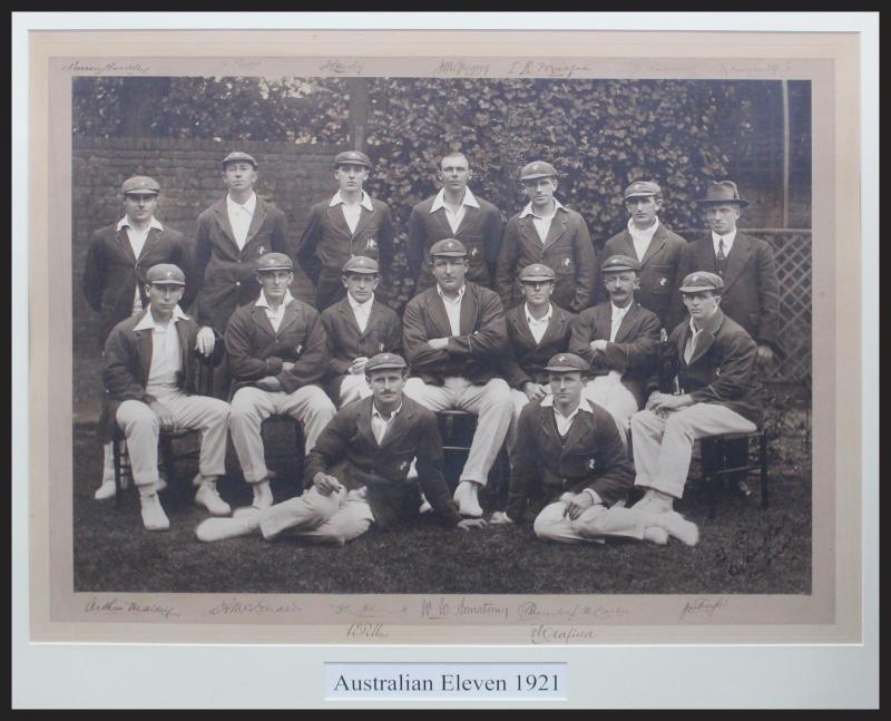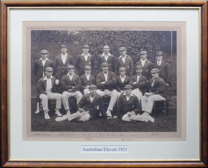 Arthur Richardson, Sam Everett, Arthur Mailey, Warren Bardsley, Herbie Collins (captain), Tommy Andrews, Johnny Taylor, Clarrie Grimmett, Charlie Macartney, Bill Woodfull, Bill Ponsford, Bert Oldfield & photographer T Bolland, window mounted, framed
