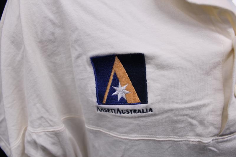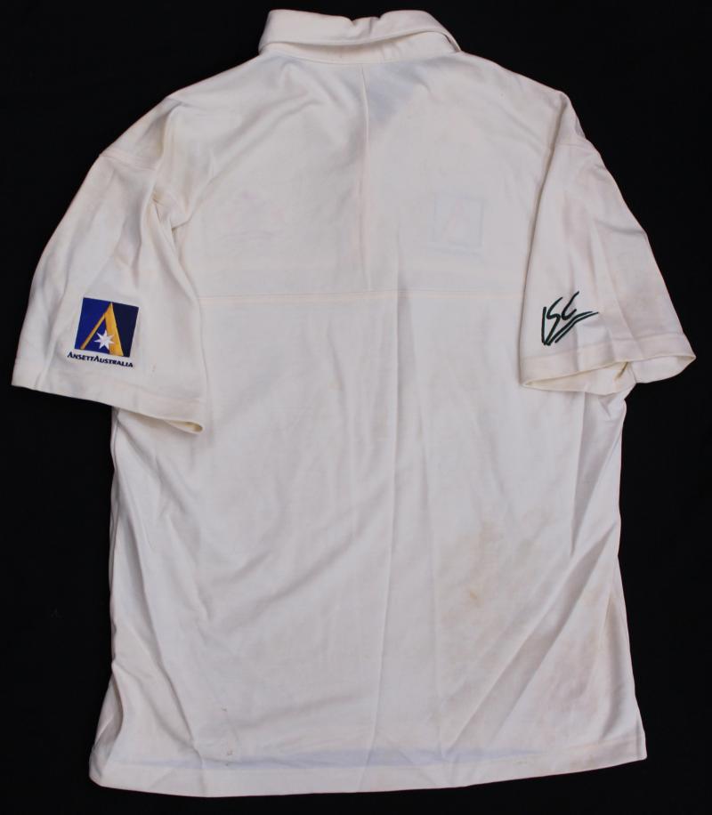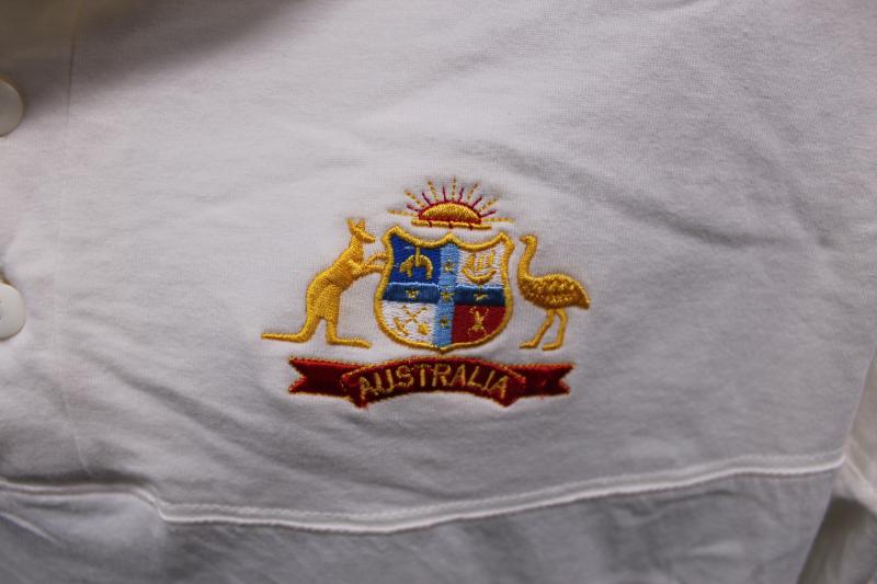 Australian Test Shirt with embroidered Australian Coat-of-Arms and Ansett logo, match worn with 'test debut' written on tag. [2nd