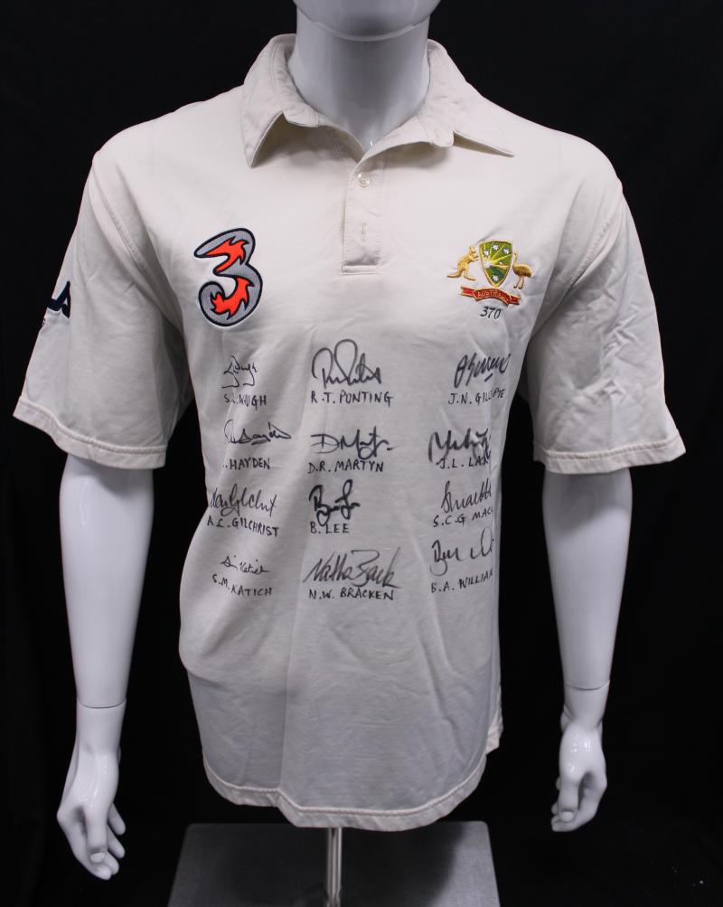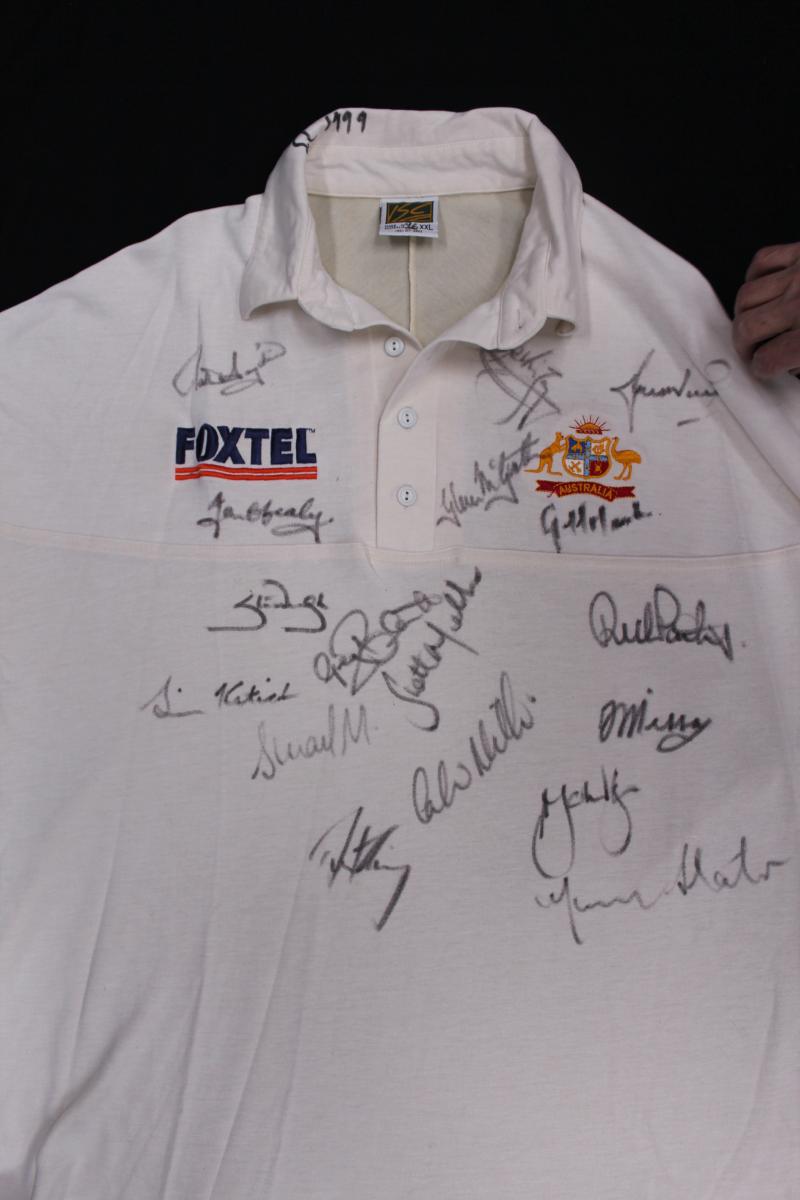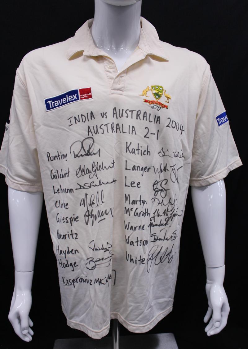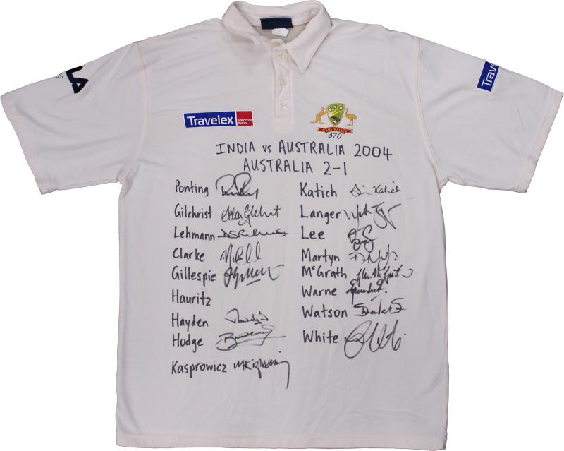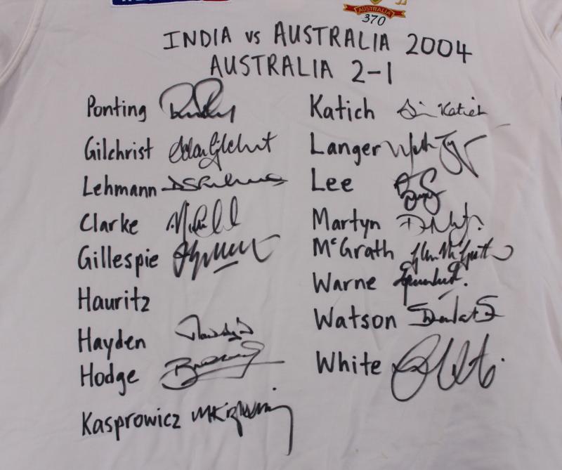 front 'INDIA vs AUSTRALIA 2004. AUSTRALIA 2-1' with 16 signatures including Ricky Ponting, Adam Gilchrist, Michael Clarke & Simon Katich. Small black ribbon pinned to sleeve [the team wore black armbands during this series to honour the passing of