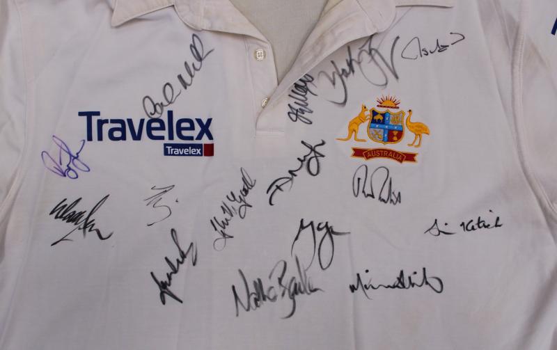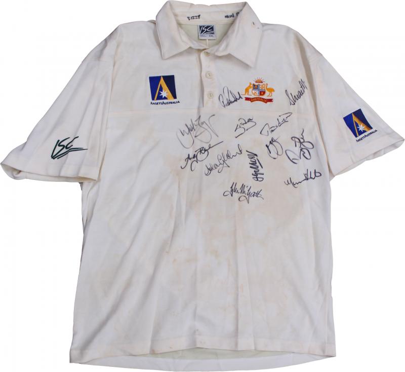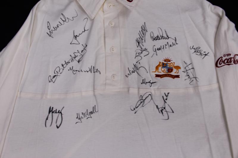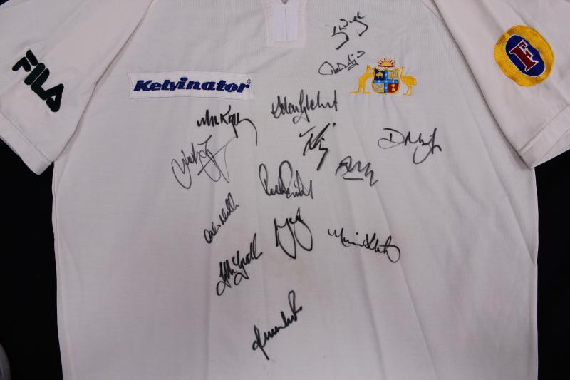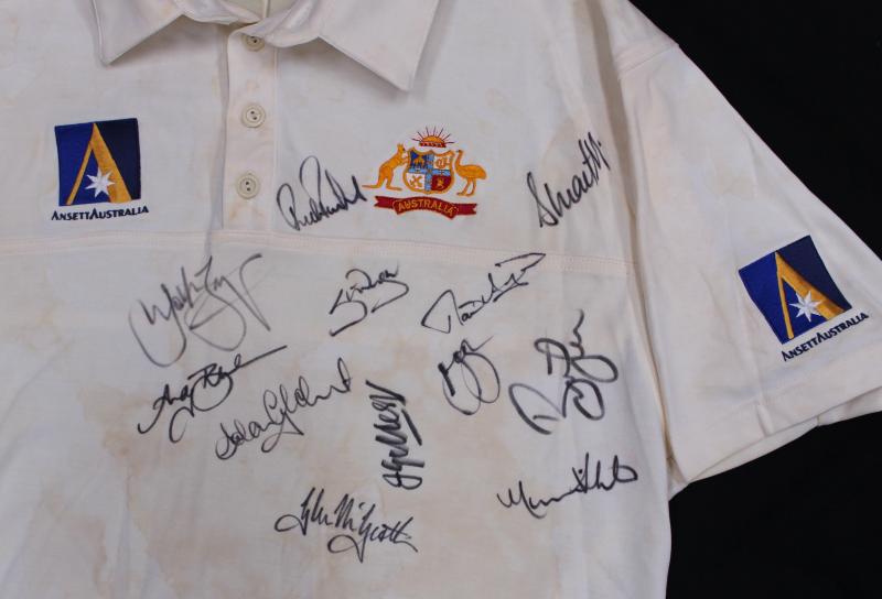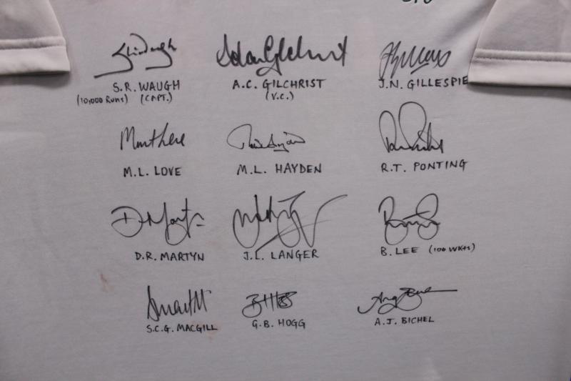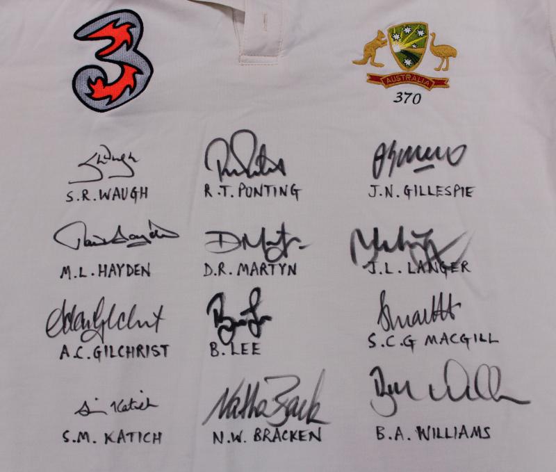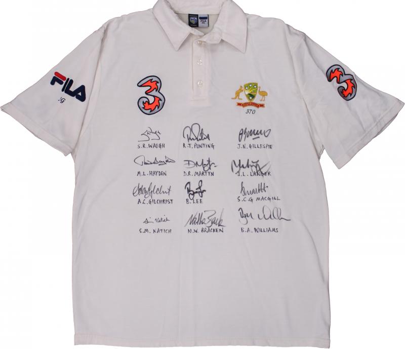 front 'INDIA vs AUSTRALIA 2004. AUSTRALIA 2-1' with 16 signatures including Ricky Ponting, Adam Gilchrist, Michael Clarke & Simon Katich. Small black ribbon pinned to sleeve [the team wore black armbands during this series to honour the passing of