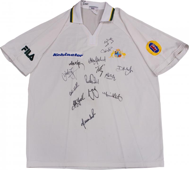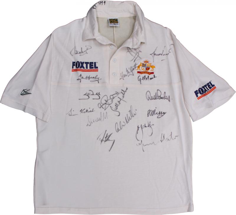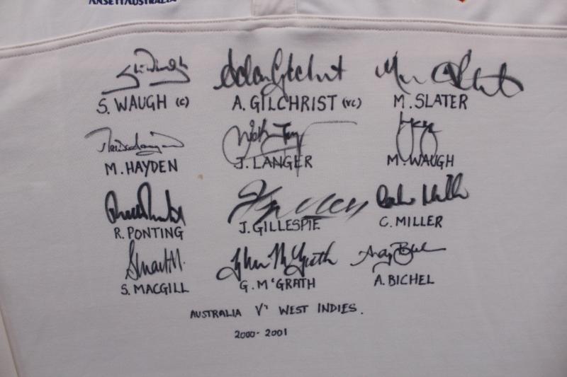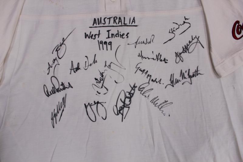 vs WI 2000' inside collar, with 12 signatures of the Australian Team including Steve Waugh, Ricky Ponting, Ian Healy & Colin Miller. [Between 14th October 1999 & 3rd December 2000, the Australian cricket team led by Stephen Waugh played and won 12