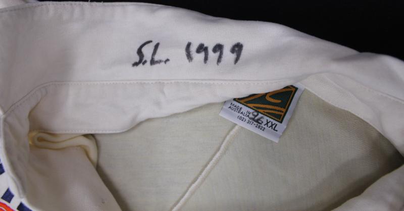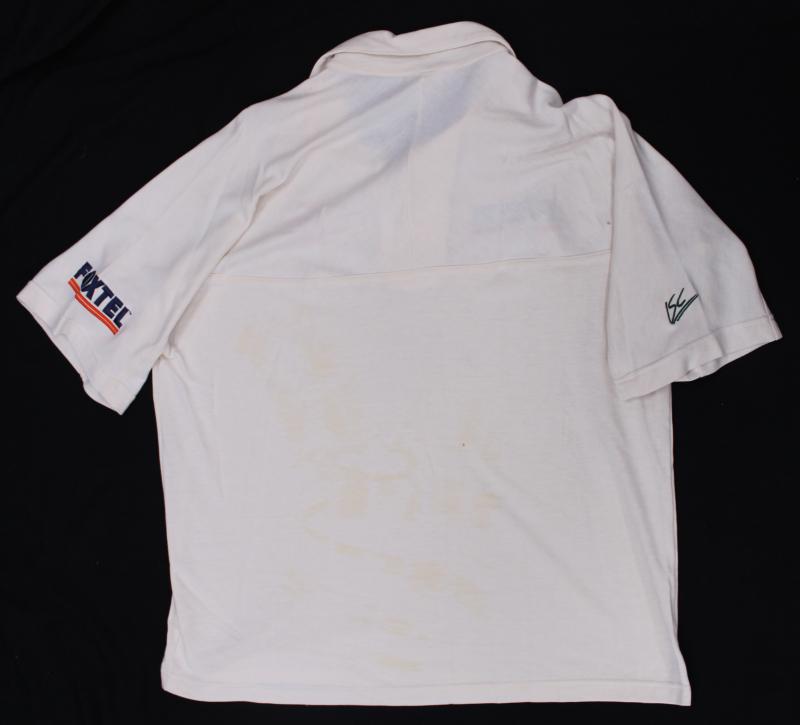 Australian Test Shirt with embroidered Australian Coat-of-Arms and Foxtel logo, match worn with 'SL 1999' inside collar, with 17