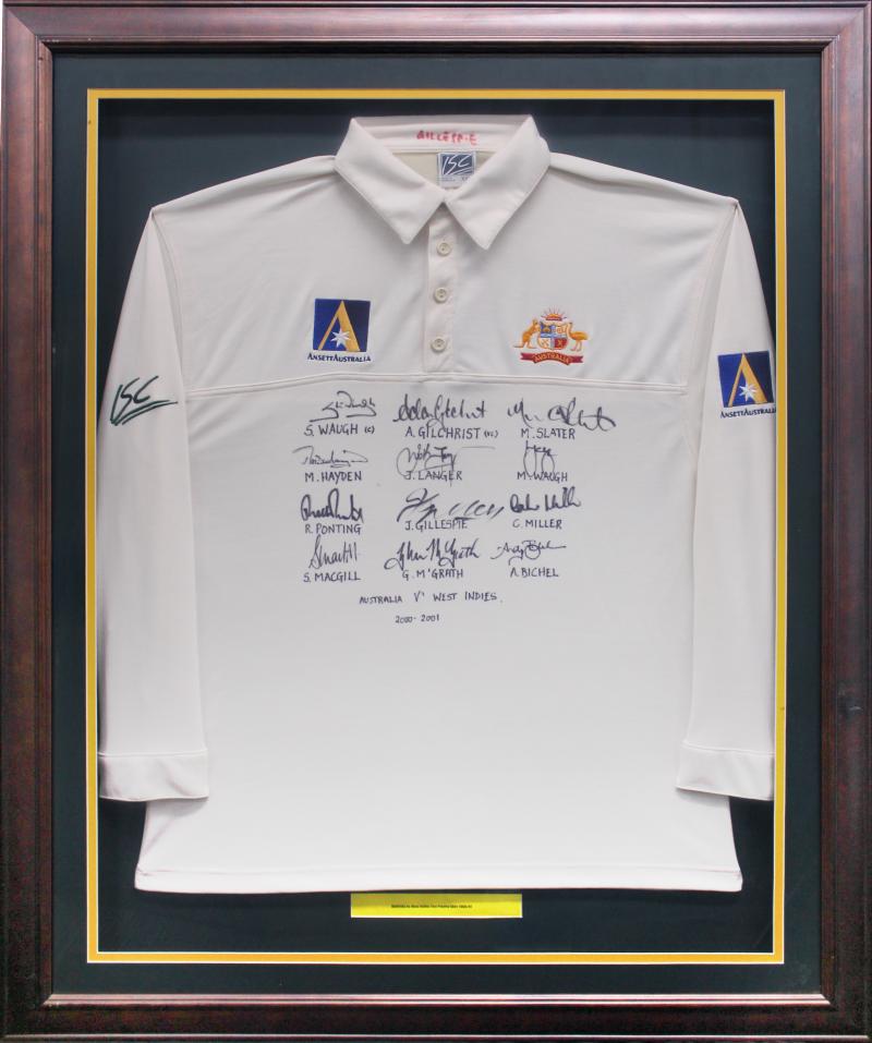 'Australia v West Indies 2000-2001' with 12 signatures of the Australian Team including Steve Waugh, Adam Gilchrist, Colin Miller, Jason Gillespie, window mounted, framed & glazed, overall 92x112cm. Ex Jason Gillespie collection. (Image1) (Image2)