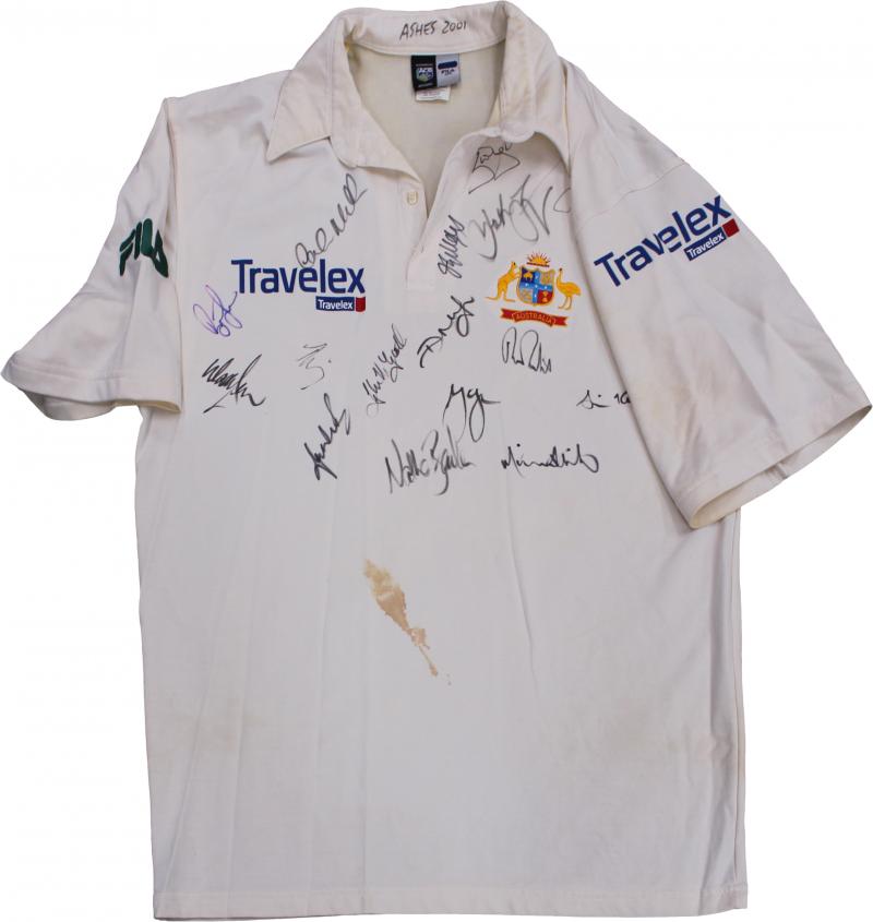 'Ashes 2001' on collar & 'DIZ' on tag with 16 signatures of the Australian Team including Steve Waugh, Mark Waugh, Glenn McGrath & Shane Warne. Ex Jason Gillespie collection. (Image1) (Image2)
