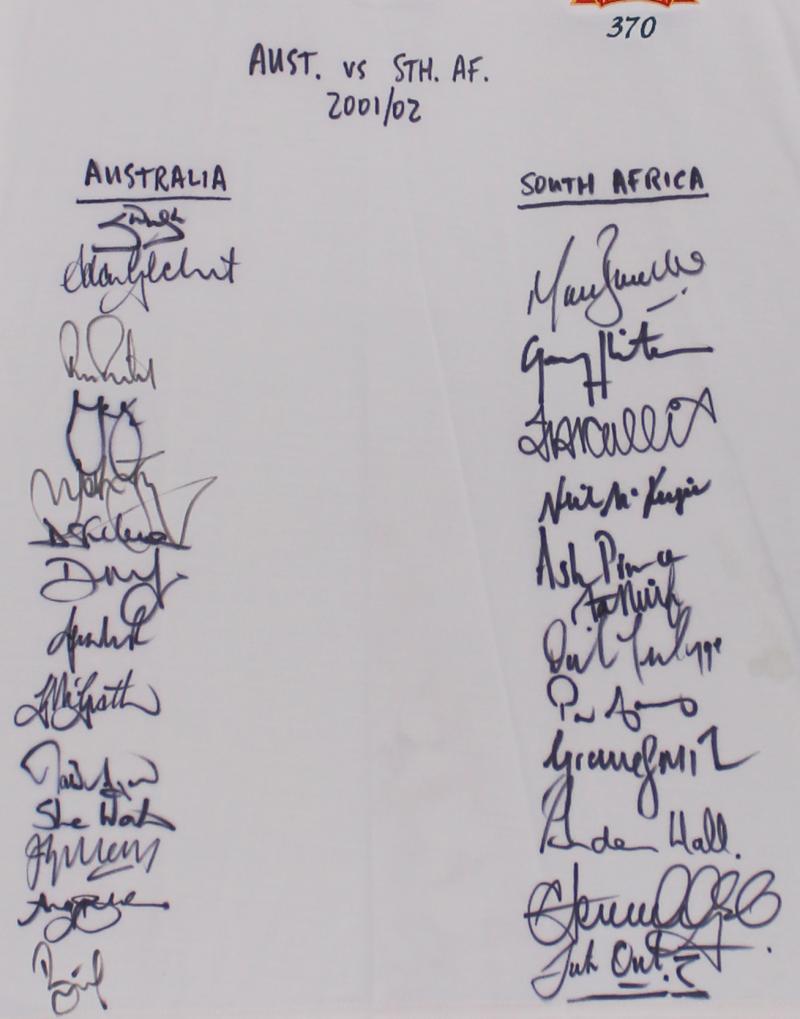 (with JG below) logos, match worn, endorsed 'AUST vs STH AF 2001/02' signed by both teams with 26 signatures including Steve Waugh, Shane Warne, Gary Kirsten & Jacques Kallis. Ex Jason Gillespie collection. (Image1) (Image2)