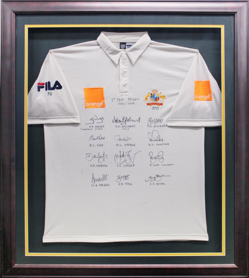 endorsed '5th TEST SYDNEY 2002-2003' with 26 signatures including Steve Waugh (10,000 runs), Brett Lee (100th Wicket), Adam Gilchrist & Jason Gillespie, window mounted, framed & glazed, overall 92x116cm. Ex Jason Gillespie collection. (Image1) (Image2)