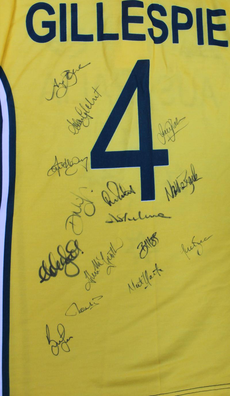 signatures of the Australian Team including Steve Waugh, Ricky Ponting, Ian Healy & Colin Miller. [Remembered for the sickening on-field collision between Steve Waugh and Jason Gillespie]. Ex Jason Gillespie collection. (Image1) (Image2)