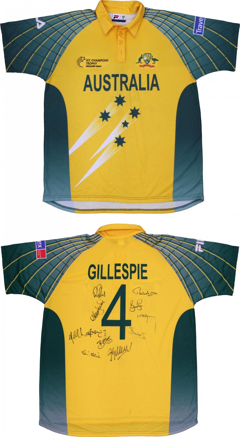 Australian ODI Shirt with 'GILLESPIE' & '4' on reverse, CA Coat-of-Arms & 'ICC CHAMPIONS TROPHY, ENGLAND 2004' on front, with 11