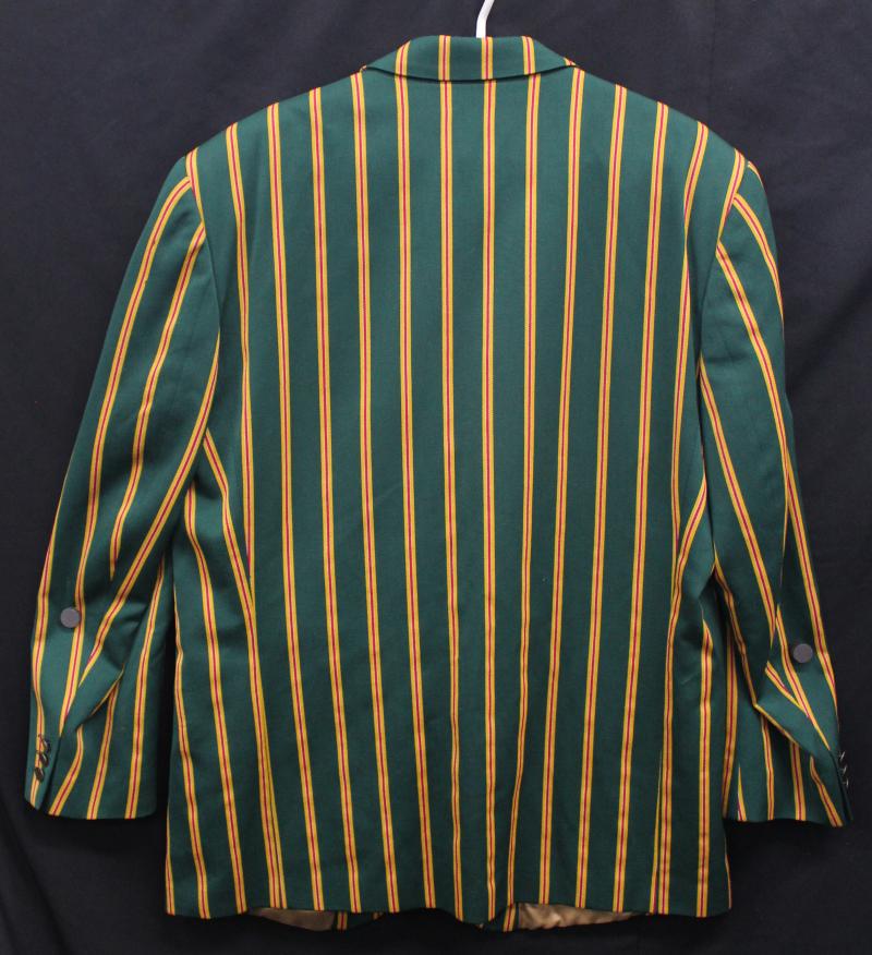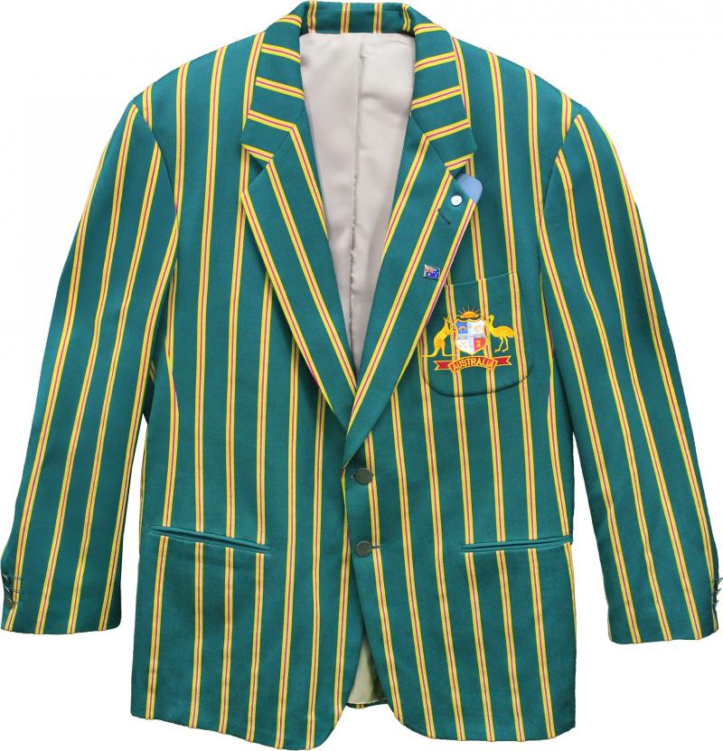 Australian Test Blazer candy-striped blazer with Australian Coat-of-Arms on pocket, worn 1997 Ashes tour, with Australian flag pin