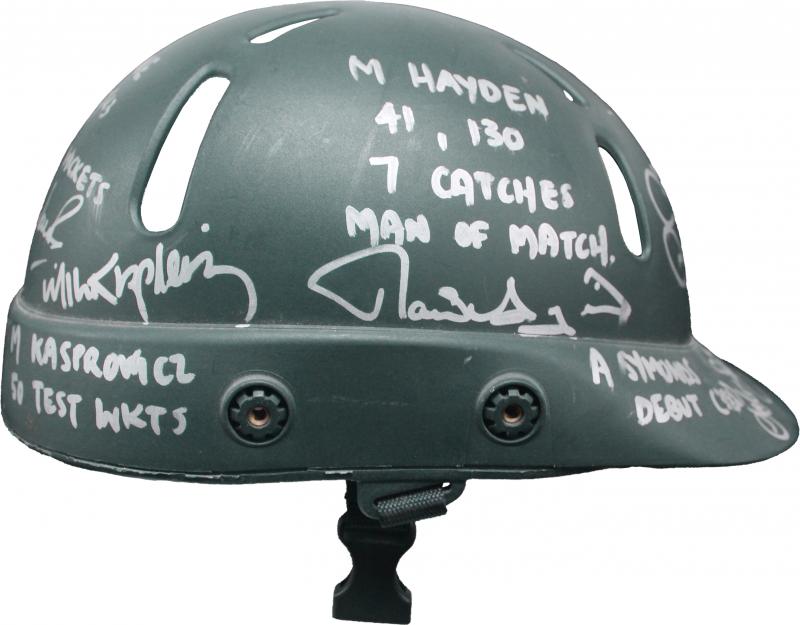 plus signature; 'SCG MacGill, 150 Test Wickets' with signature; 'M Kasprowicz, 50 Test Wickets' with signature'; 'M Hayden, 41,130, 7 Catches, Man of Match' with signature; 'A Symonds Debut (388)' with signature. The helmet match-used by Justin