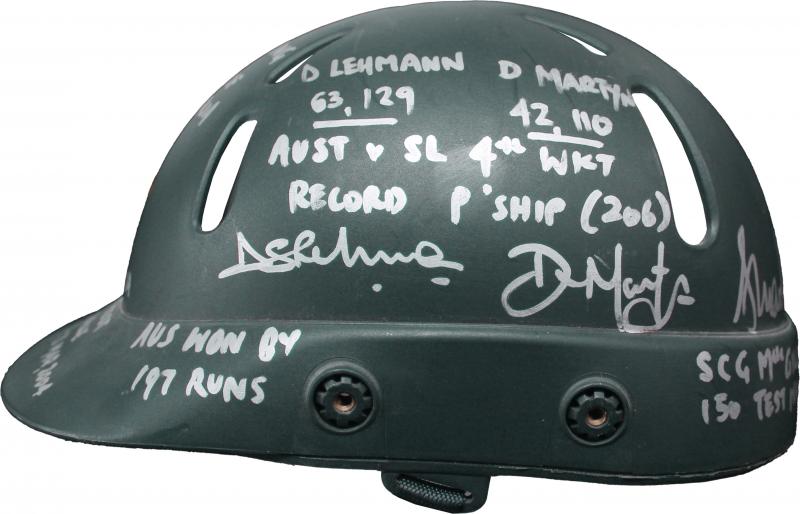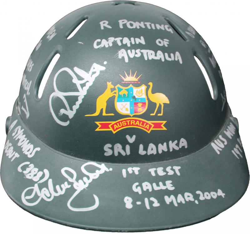 2004. Aus Won by 197 Runs', and also endorsed around helmet 'R Ponting, Captain of Australia' plus signature; 'D Lehmann 63,129, D Martyn 42,110, Aust v SL 4th Wicket Record P'Ship (206)' plus both signatures; 'SK Warne 5/116, 5/43, 500 Test Wickets'
