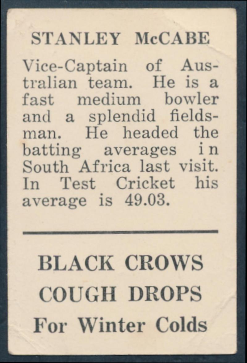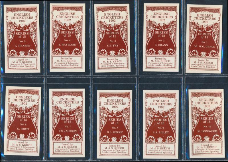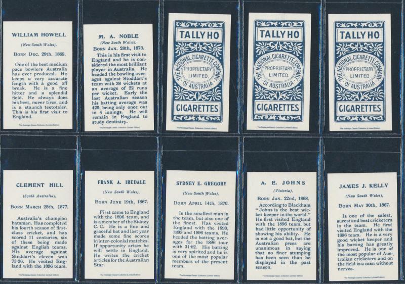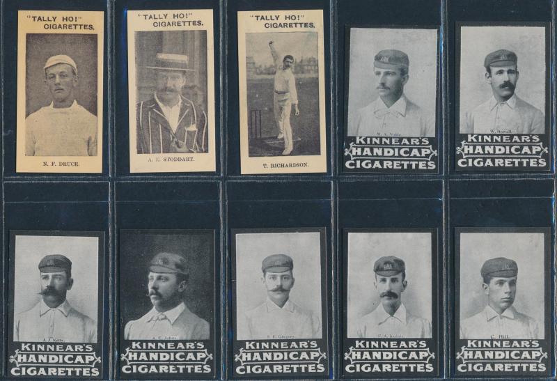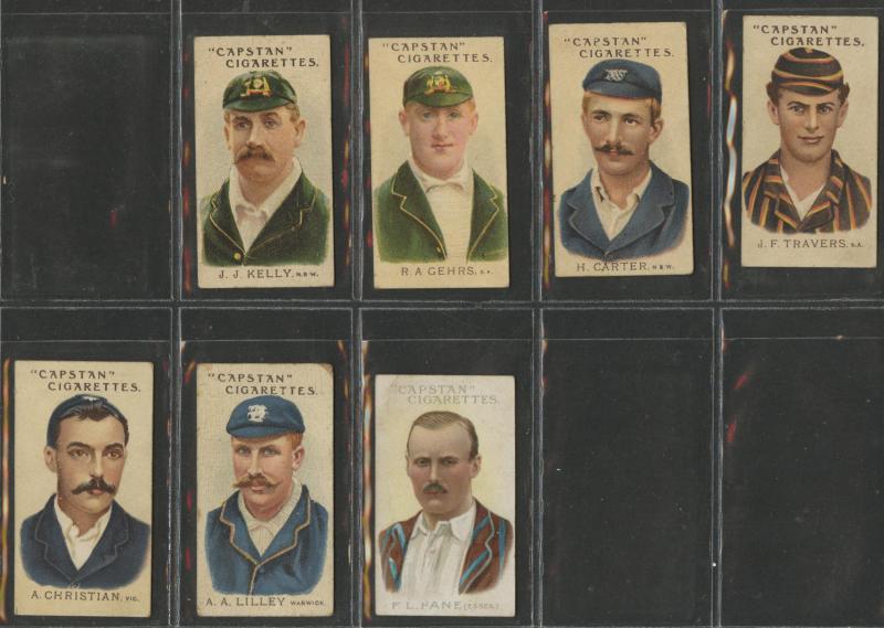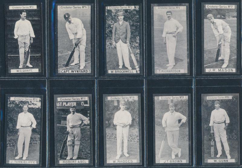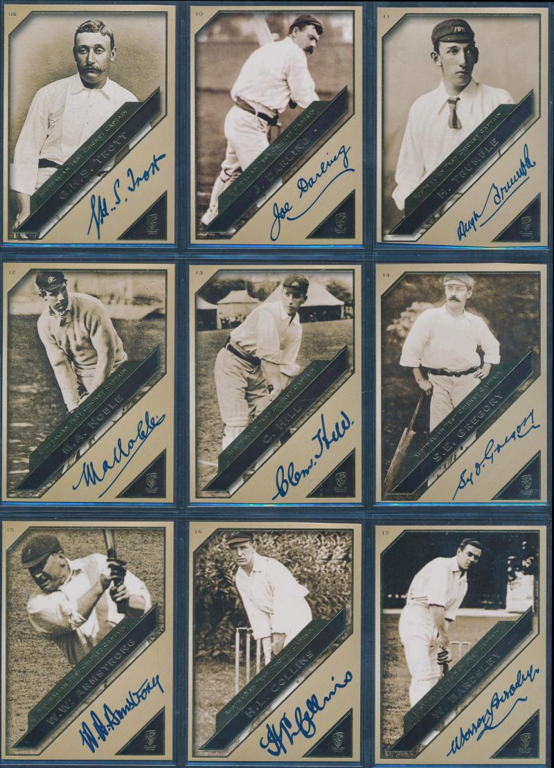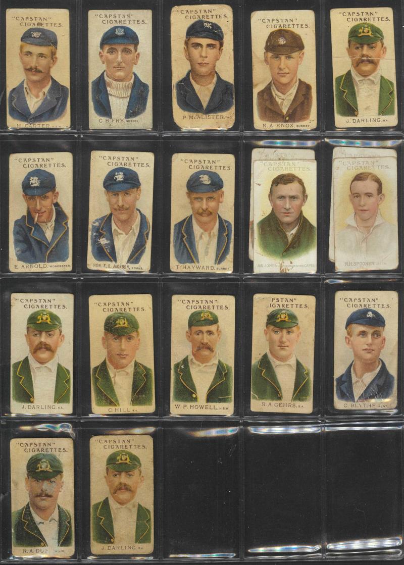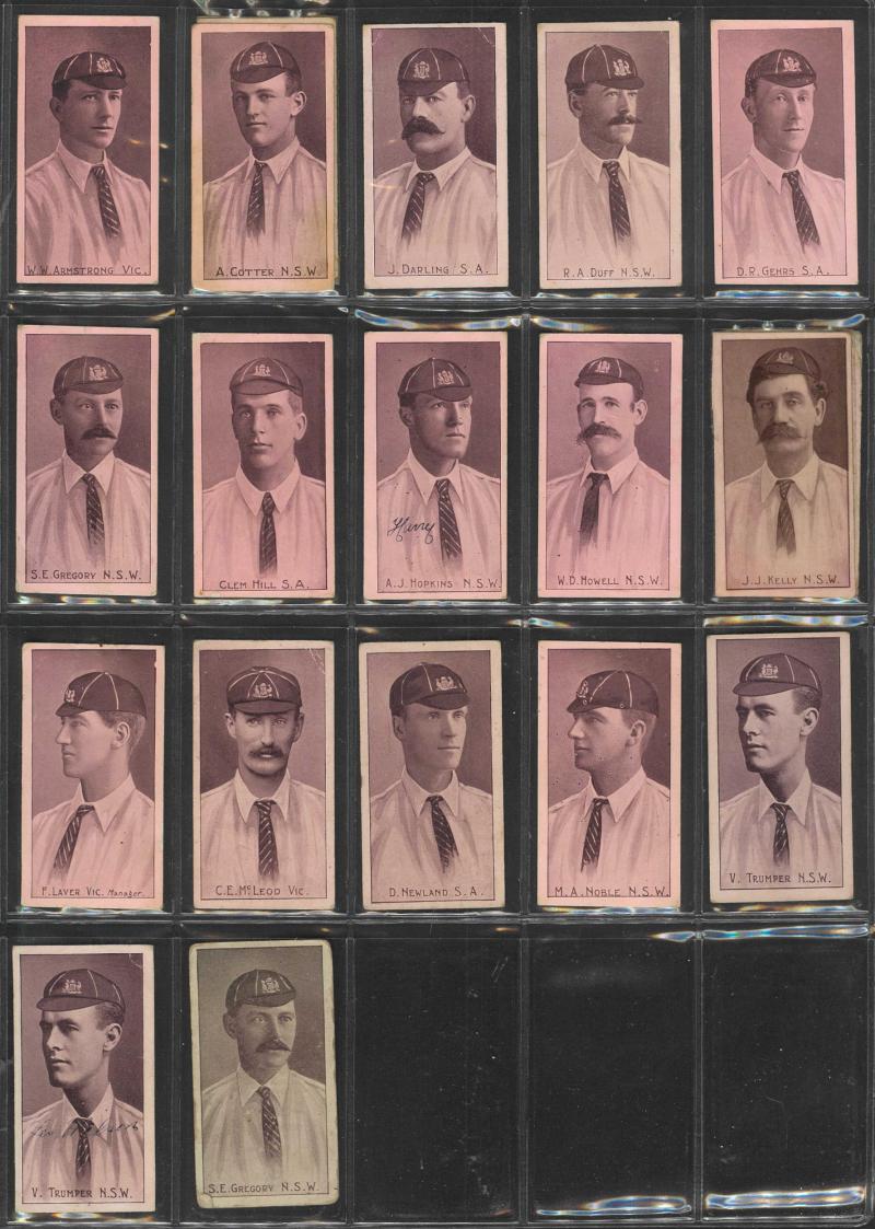 'Club Cricketers' (61); 1907 'Prominent Australian & English Cricketers' (1-50) [50], Grey Captions [23] & Red Captions [8]; 1909 'Australian & English Cricketers' (33); 1910-11 'Australian & South African Cricketers' (50); Sniders & Abrahams '1905