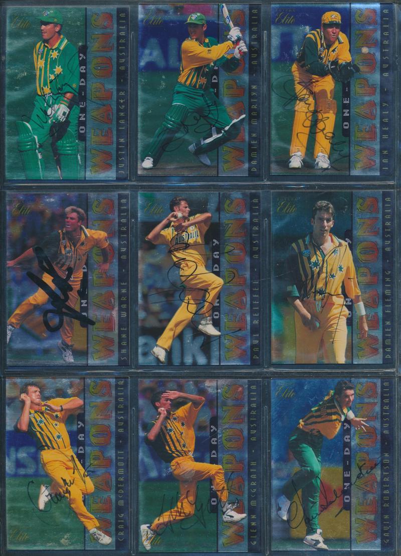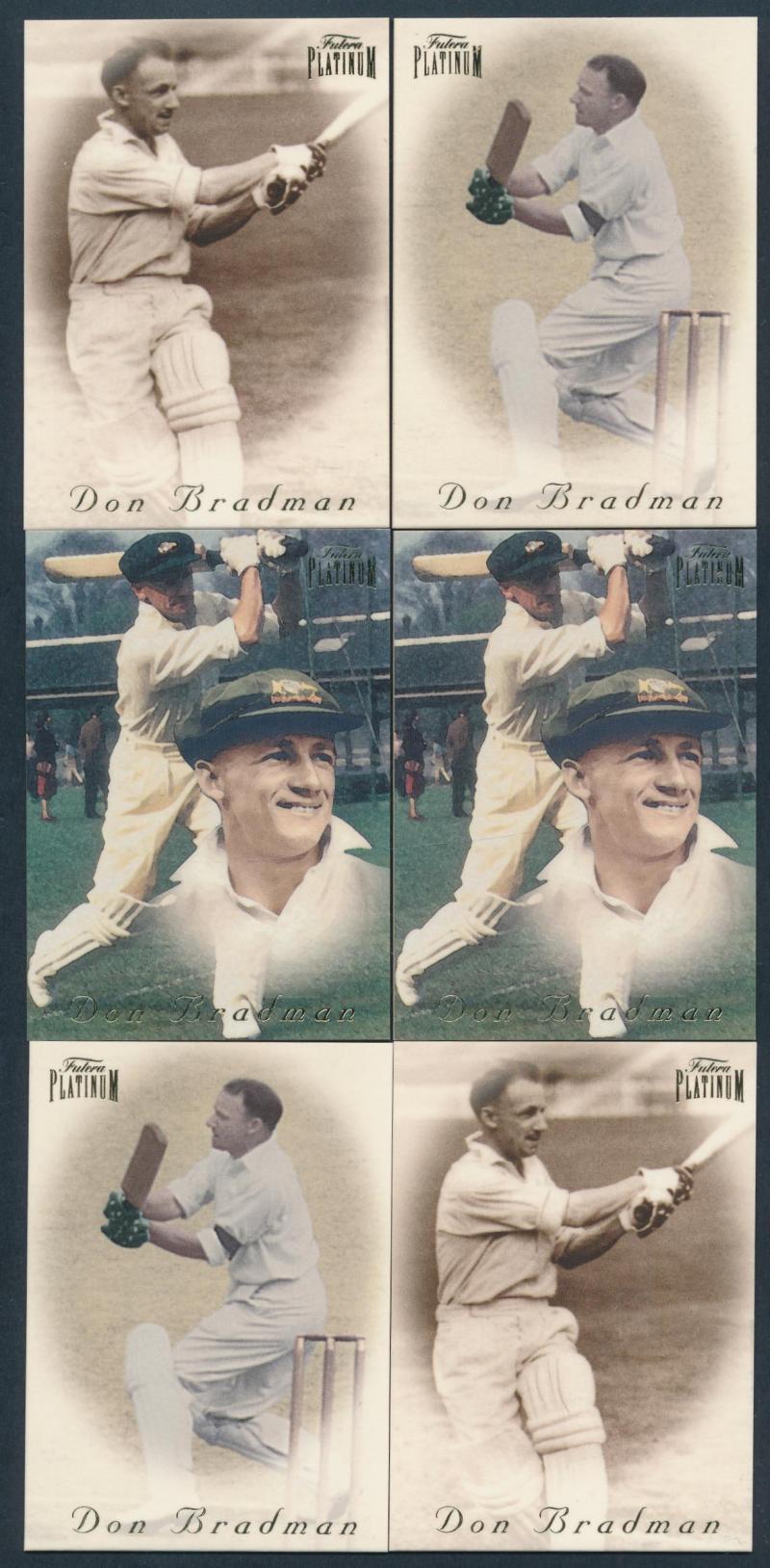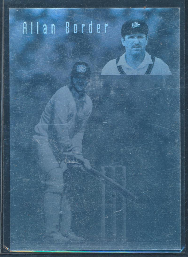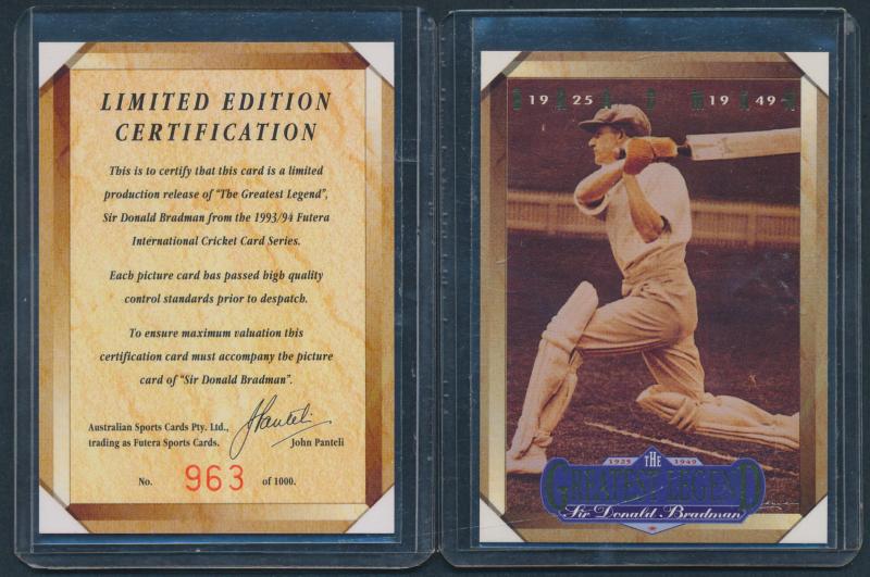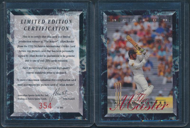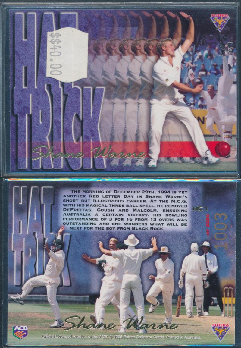 Greatest Legend - Sir Donald Bradman' & 'Allan Border - The Master'; 1994 Futera 'Allan Border Hologram' (3); 1995 Futera 'Shane Warne Hat Trick' (8); 1996 Futera '4-Up Mark Waugh Signature'; 1996 Heritage 'Sir Donald Bradman' Sample [4] &