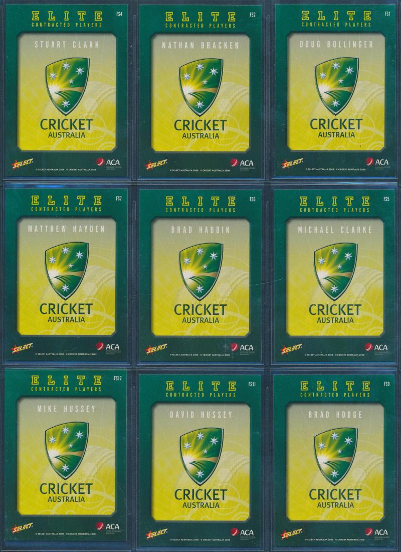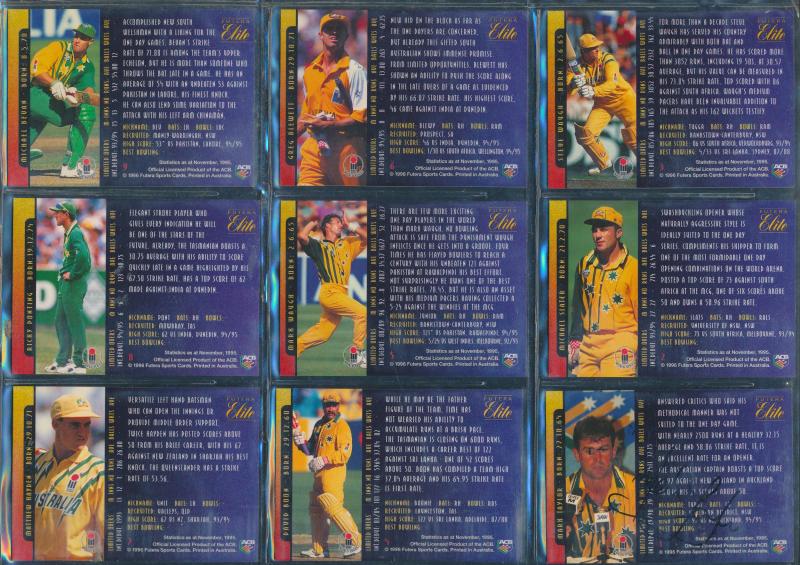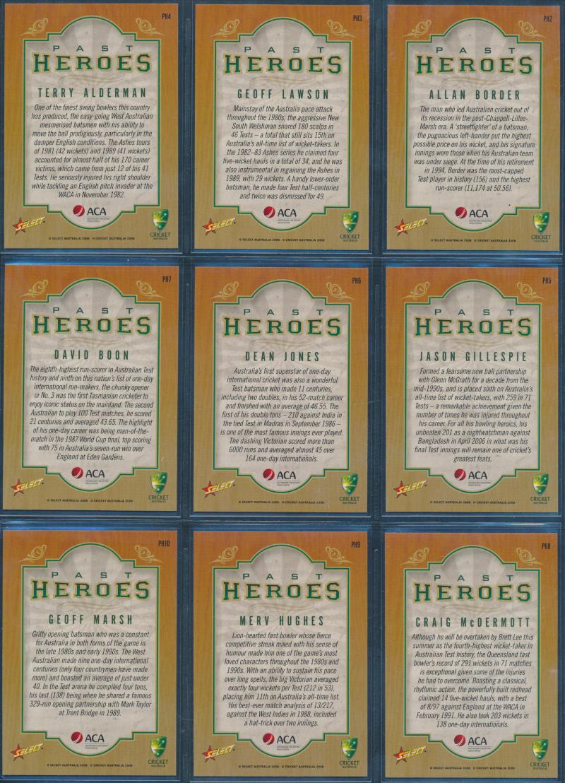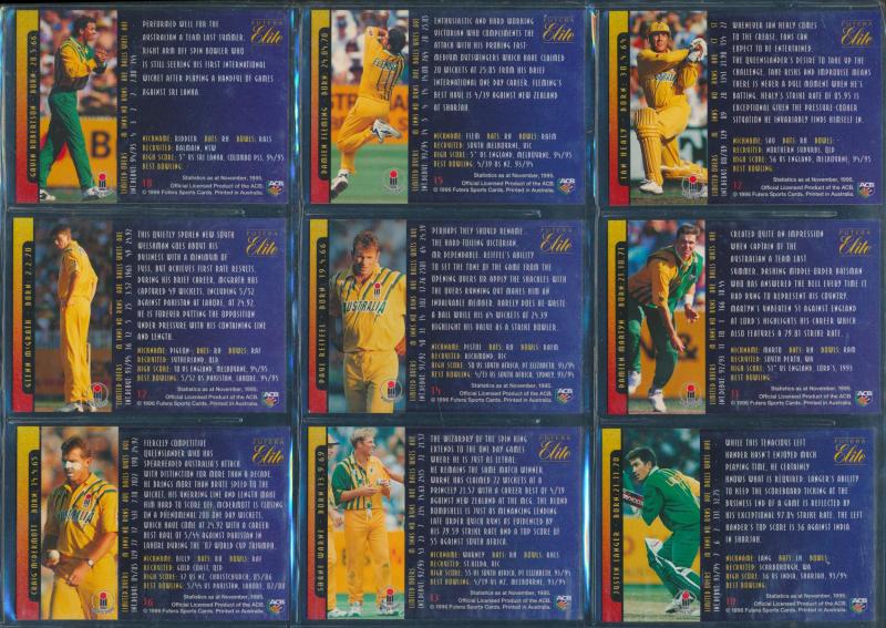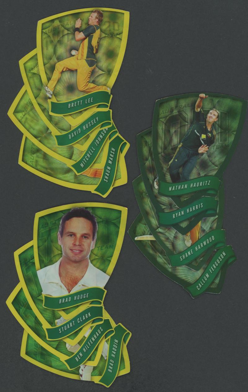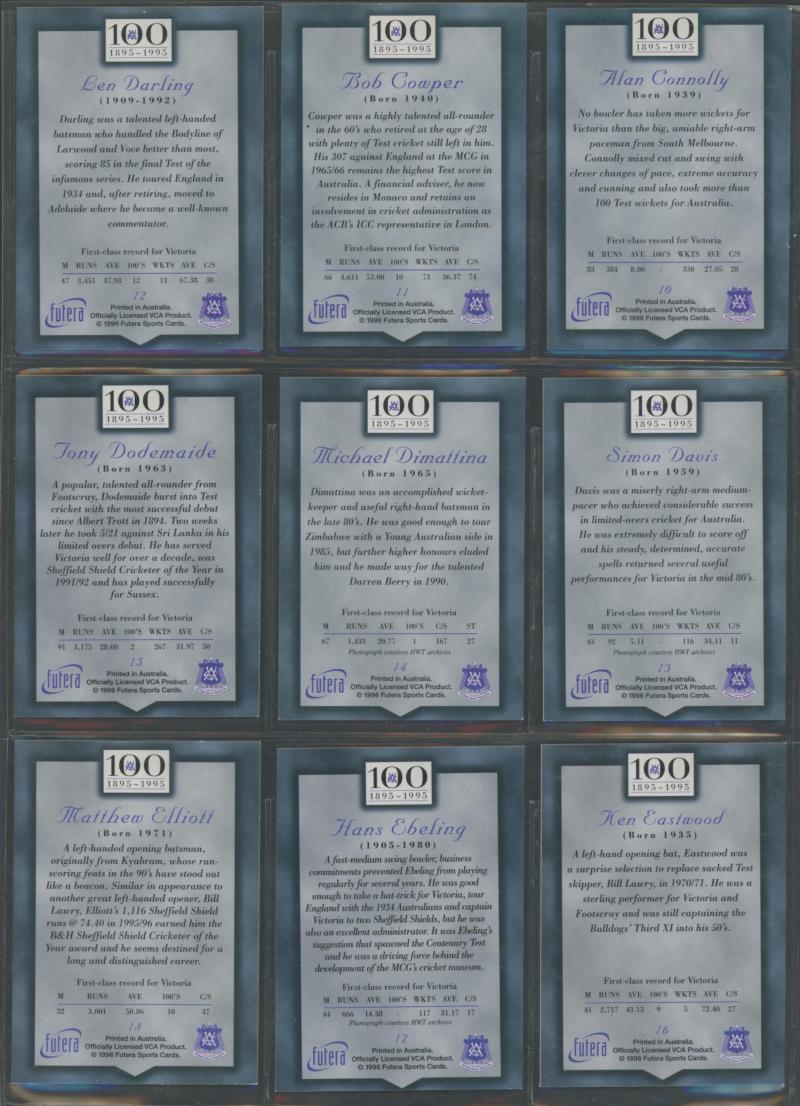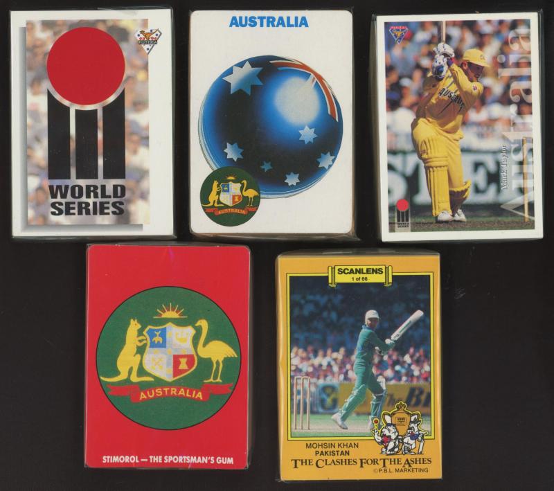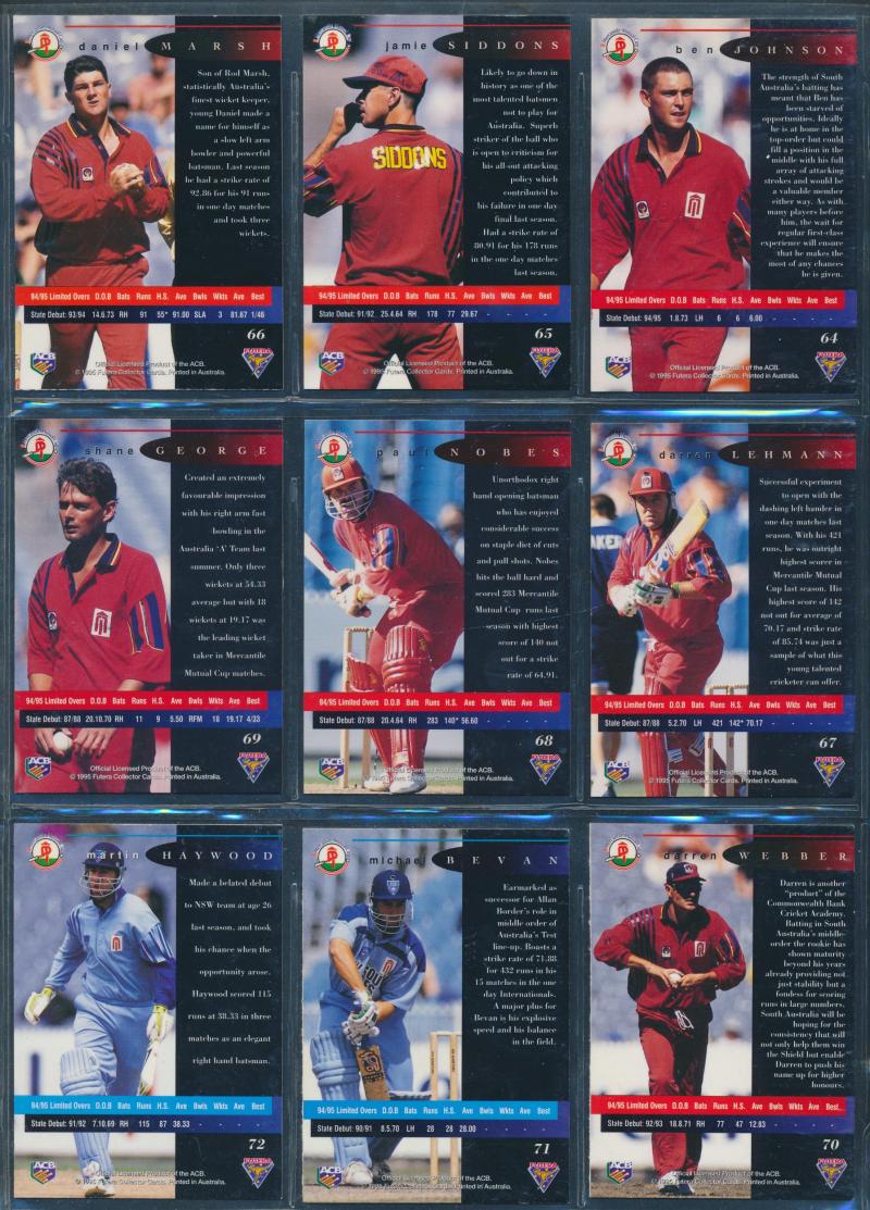 [54] x 2 sets & 1984 [50] x 2 sets; 1985 Kanga Cricket [63]; 1989-90 FAI [24]; 1995-96 Mazda 'Redbacks Shield Winners' [15]; 1996 VCA Centenary [100]; 2006 Weetbaix 'Champions Work Harder' [6], mainly Fine/Very Fine.