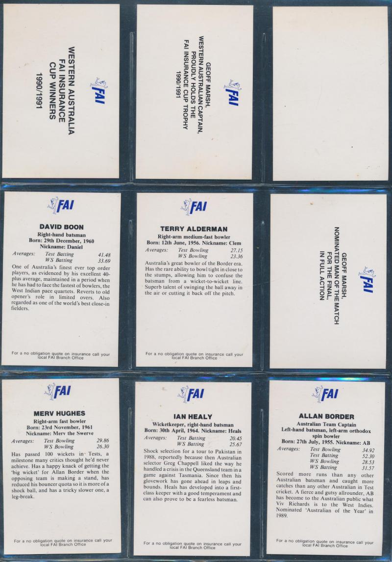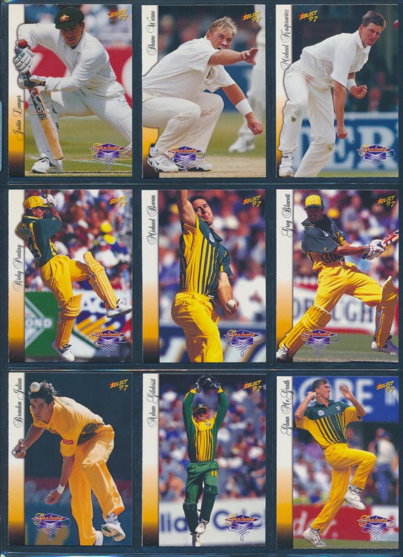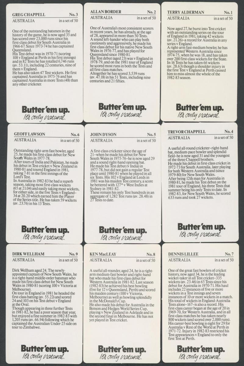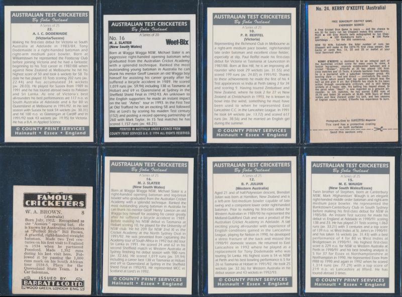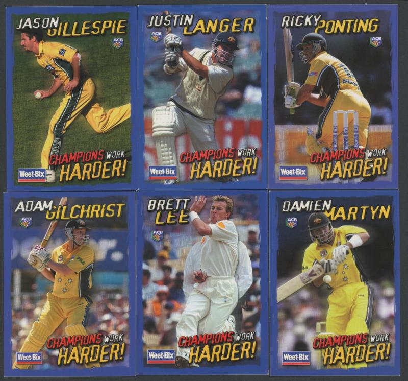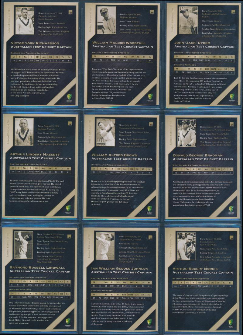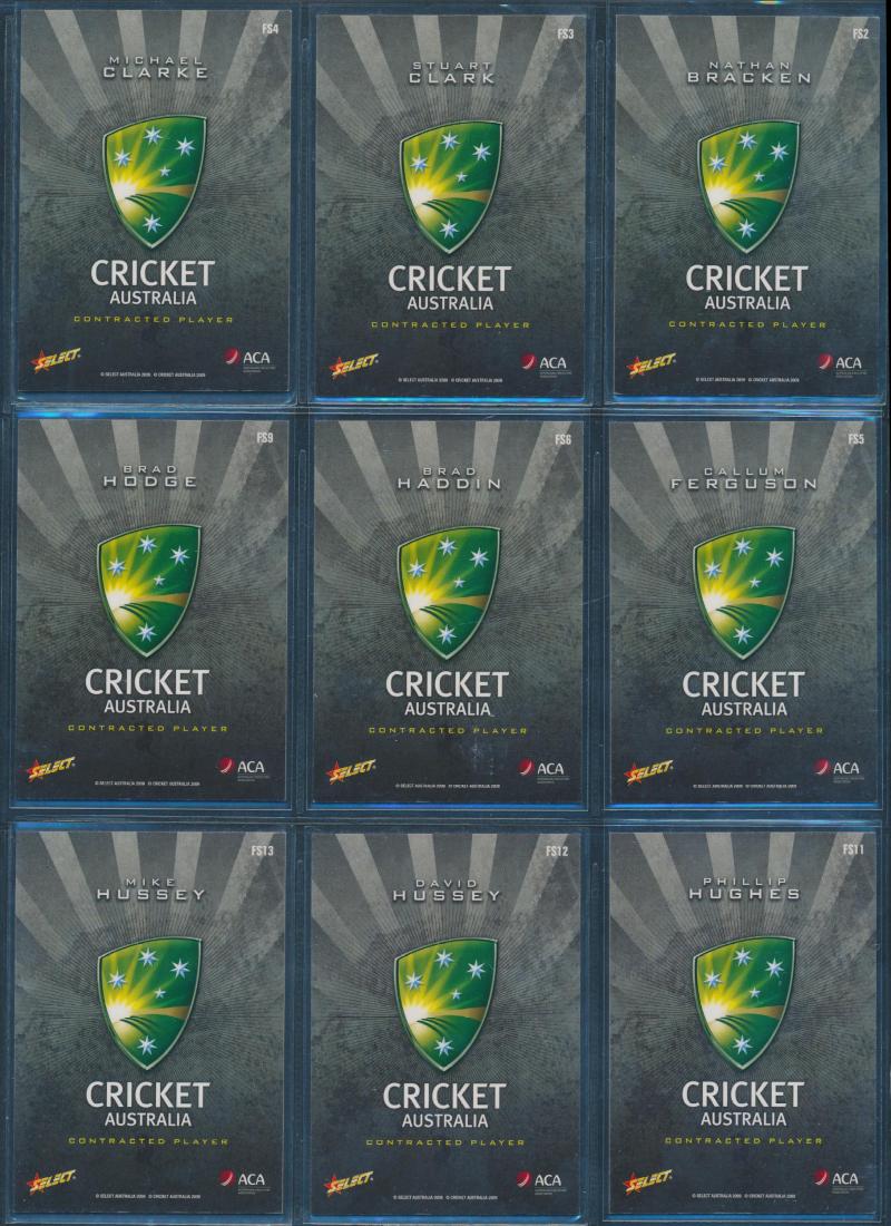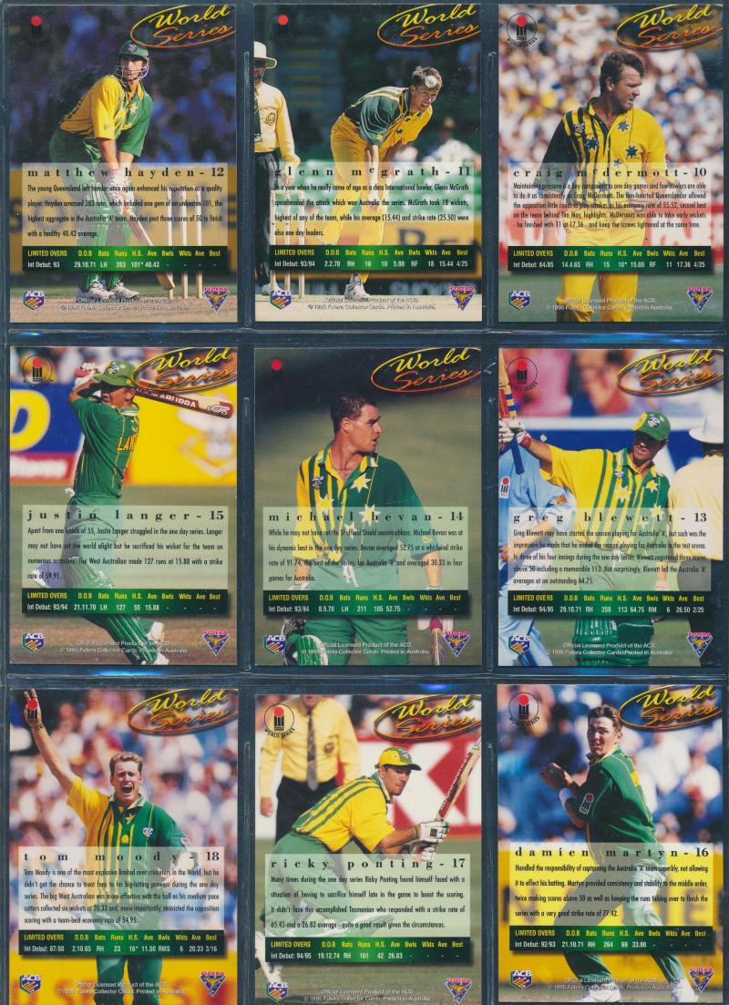[54] x 2 sets & 1984 [50] x 2 sets; 1985 Kanga Cricket [63]; 1989-90 FAI [24]; 1995-96 Mazda 'Redbacks Shield Winners' [15]; 1996 VCA Centenary [100]; 2006 Weetbaix 'Champions Work Harder' [6], mainly Fine/Very Fine.