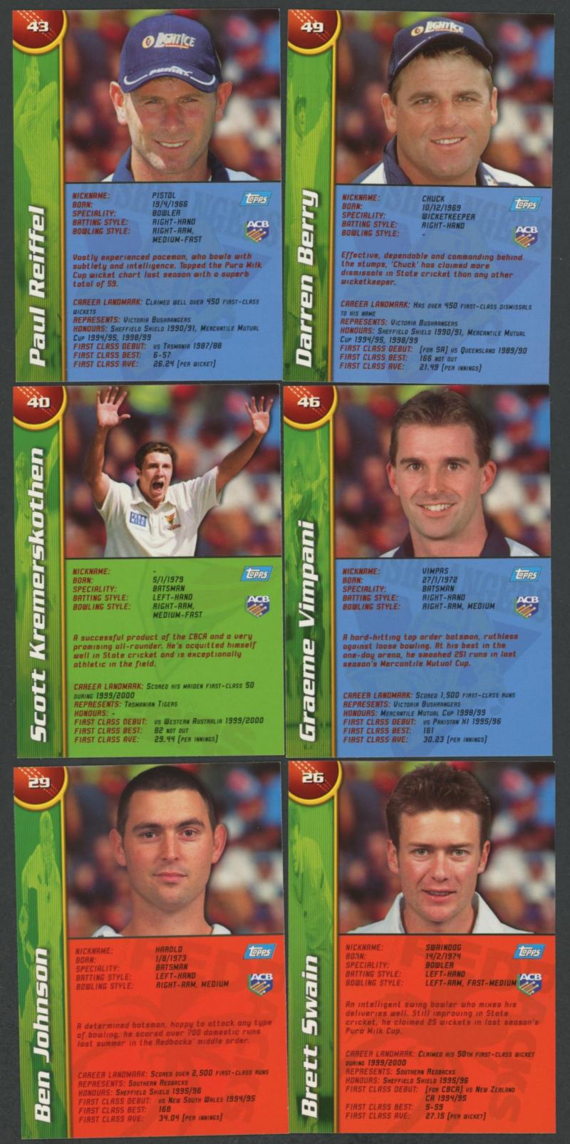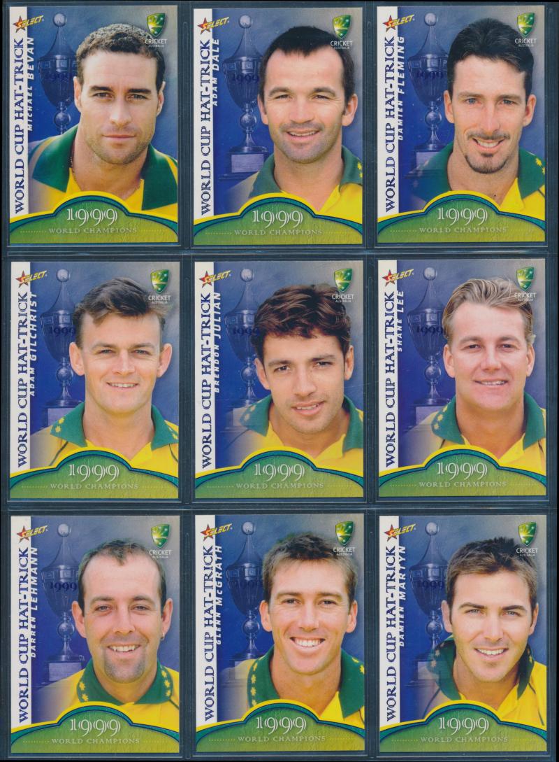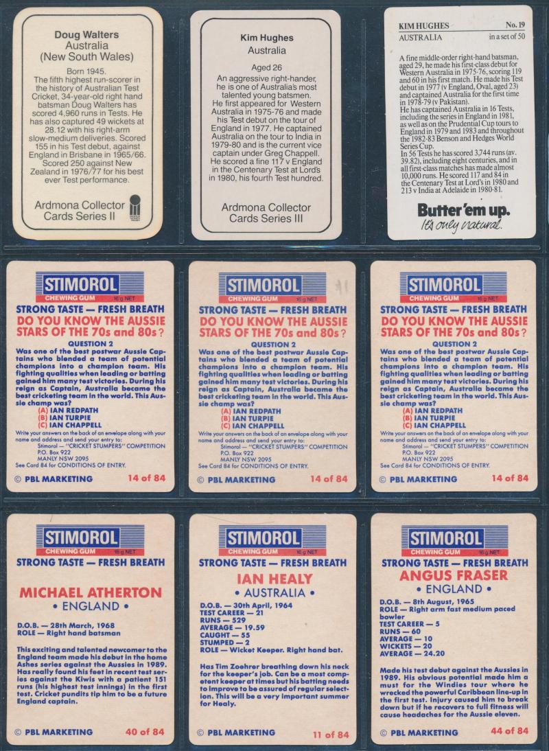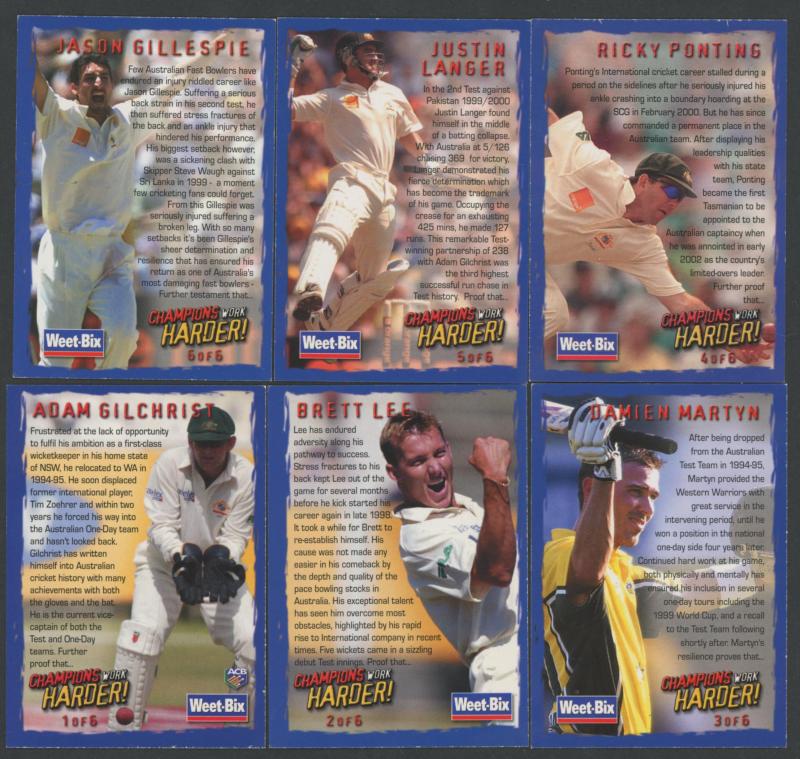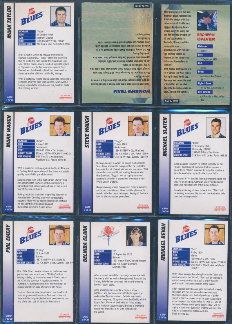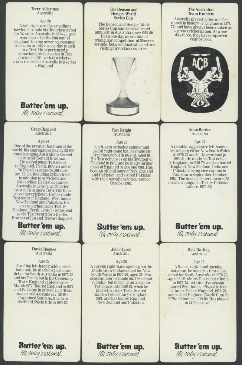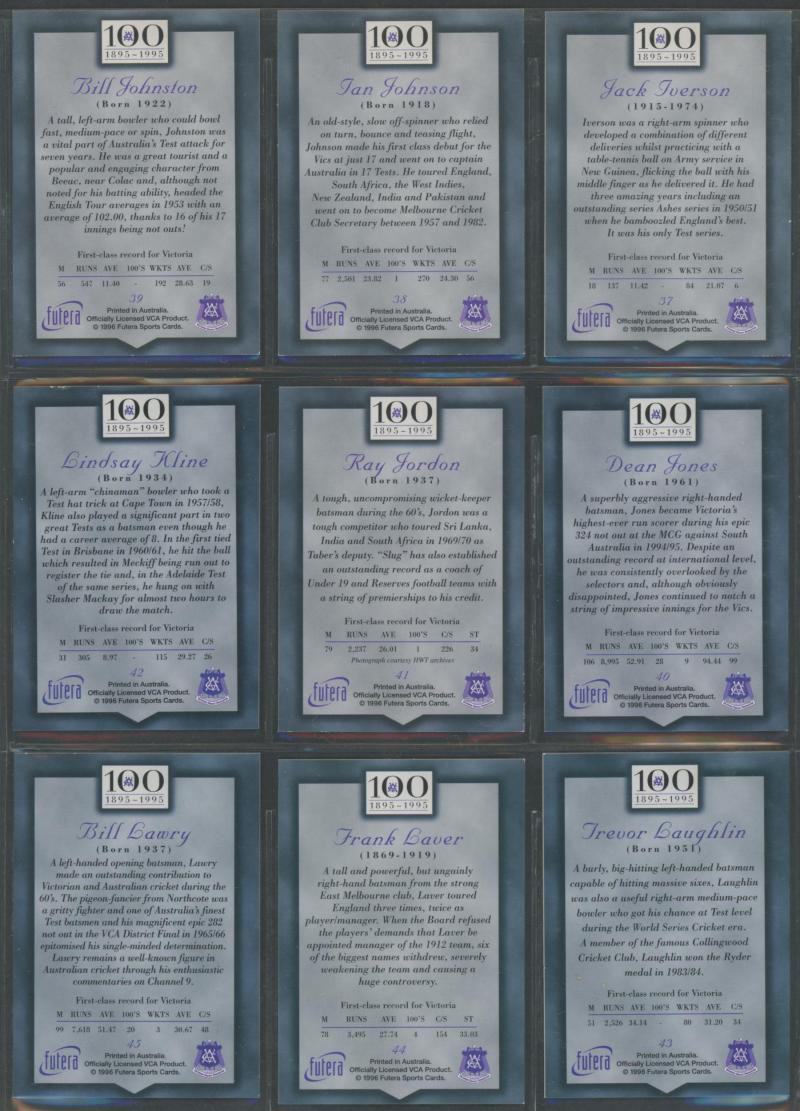 [54] x 2 sets & 1984 [50] x 2 sets; 1985 Kanga Cricket [63]; 1989-90 FAI [24]; 1995-96 Mazda 'Redbacks Shield Winners' [15]; 1996 VCA Centenary [100]; 2006 Weetbaix 'Champions Work Harder' [6], mainly Fine/Very Fine.