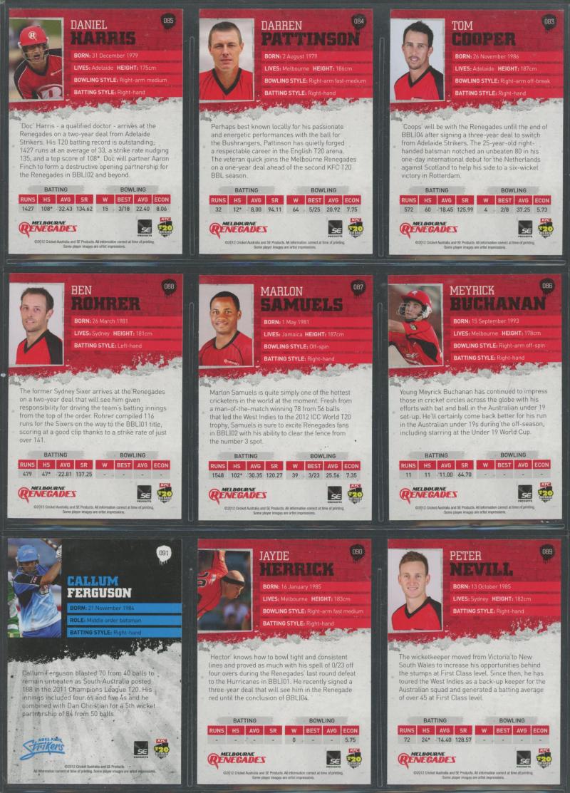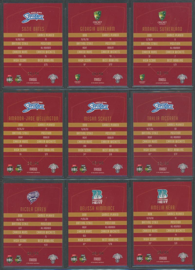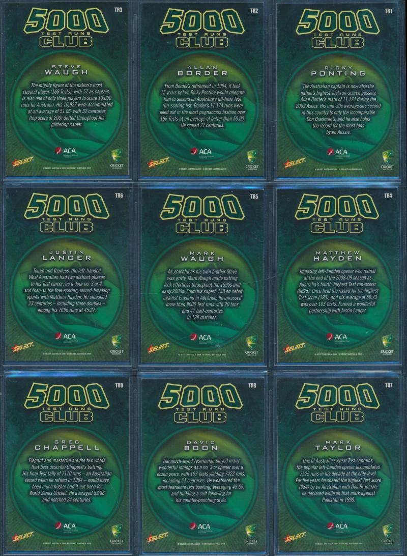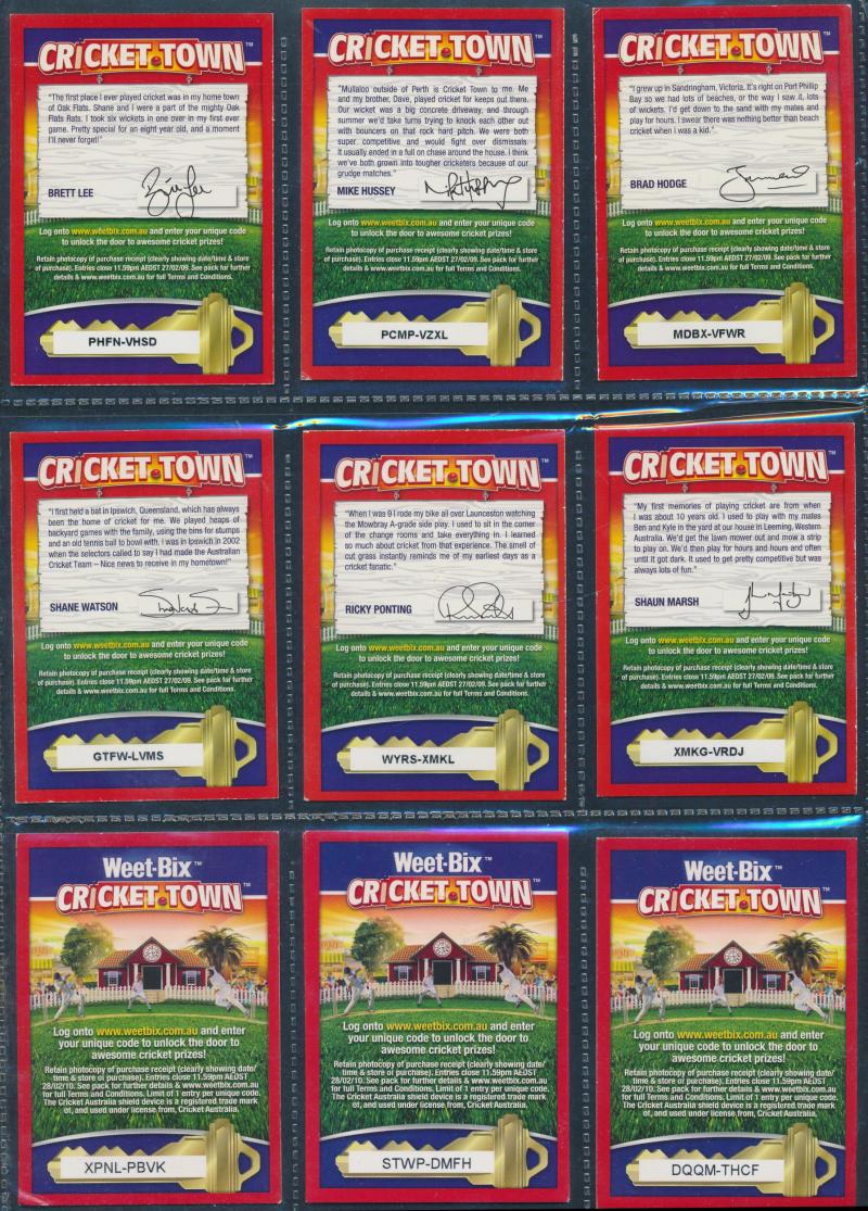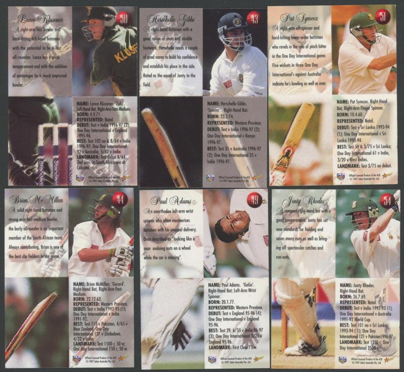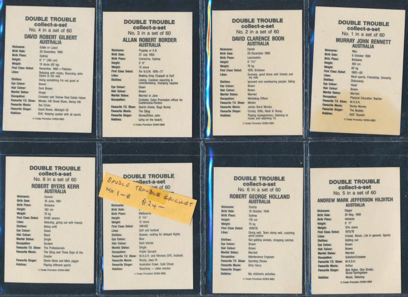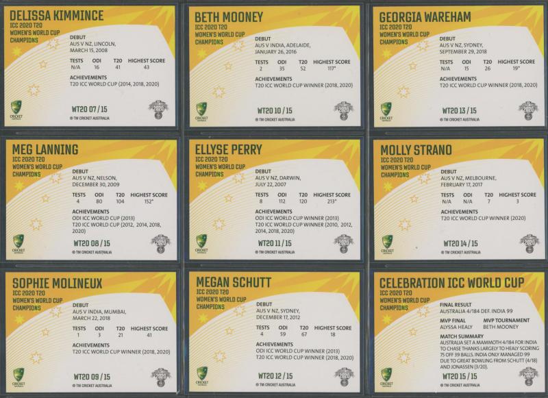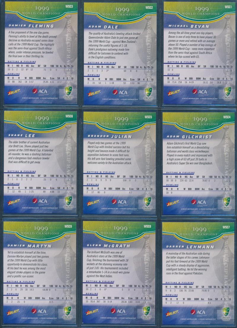 [54] x 2 sets & 1984 [50] x 2 sets; 1985 Kanga Cricket [63]; 1989-90 FAI [24]; 1995-96 Mazda 'Redbacks Shield Winners' [15]; 1996 VCA Centenary [100]; 2006 Weetbaix 'Champions Work Harder' [6], mainly Fine/Very Fine.