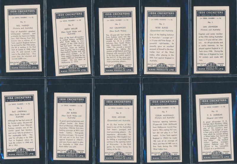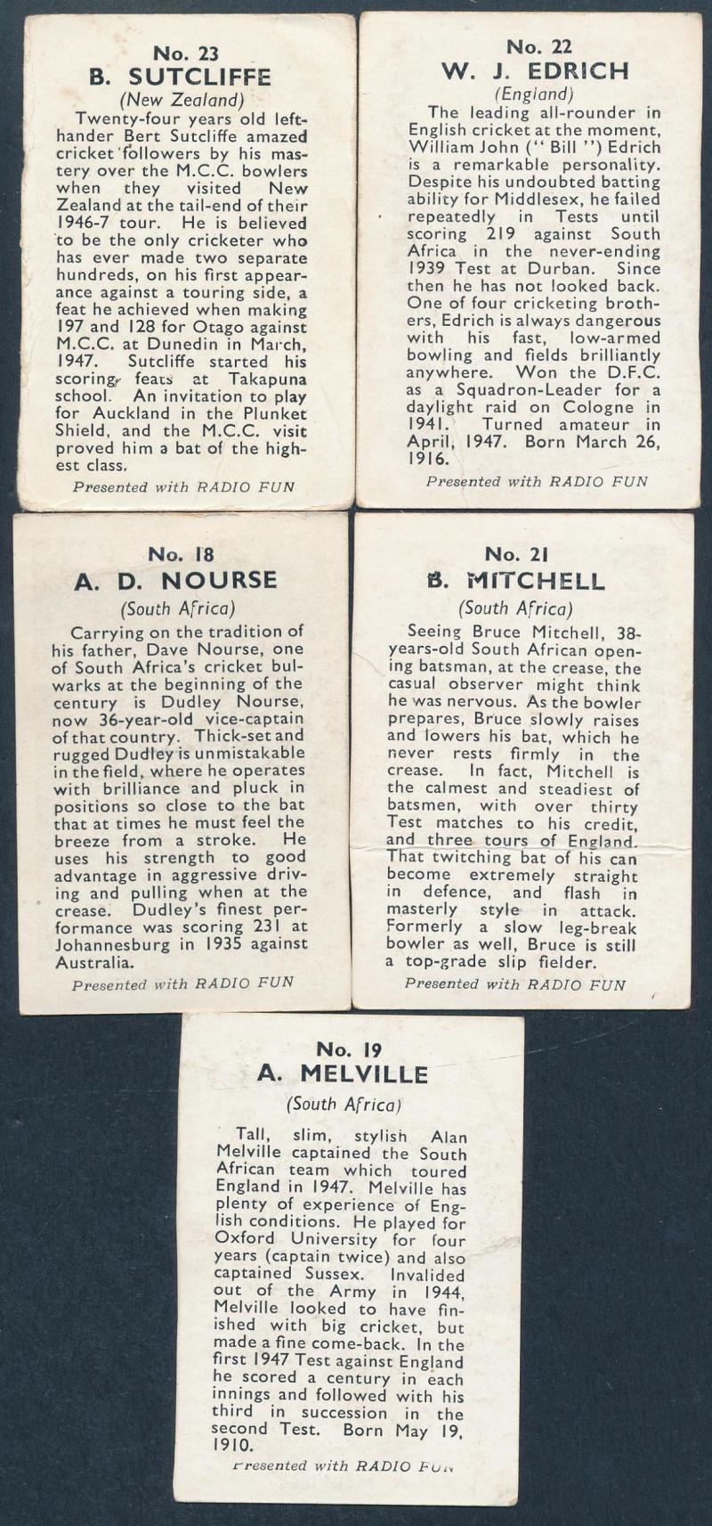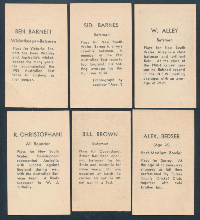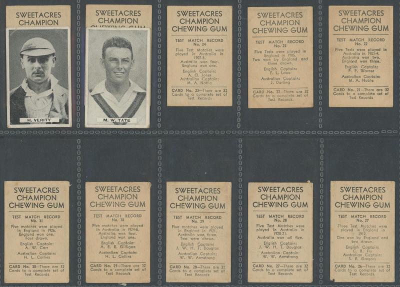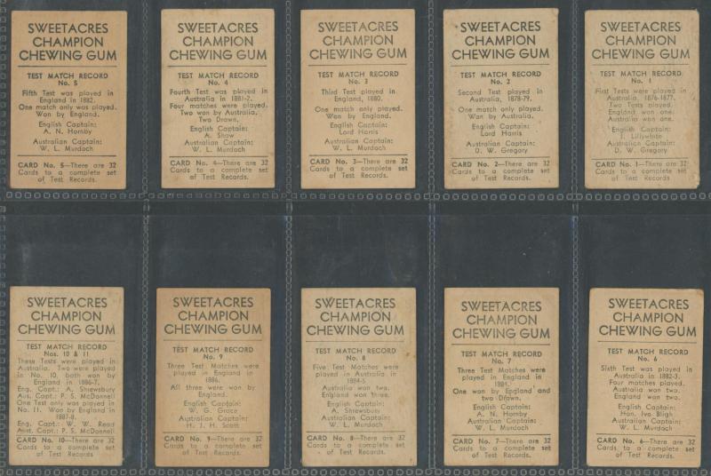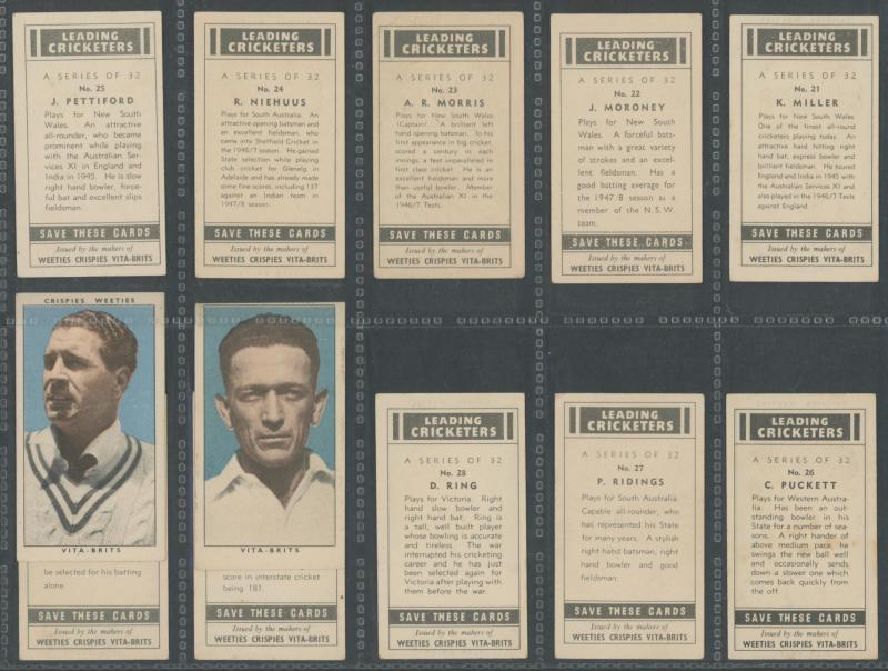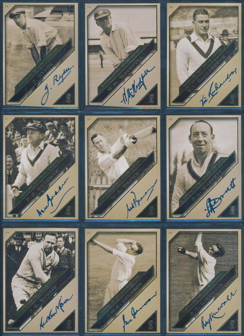(9); 1932 Sweetacres 'Test Match Records' [32]; 1932-38 Don Bradman cards (4); 1948 Nabisco 'Leading Cricketers [32]; 1951 Godfrey Phillips 'Cricketers' package issue [19/25], mainly Fair/Very Fine.