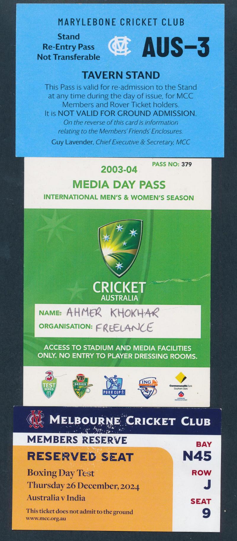 oval 'Century Makers' [38/40]; 1985 APD Snack Foods 'Double Trouble' [44/60]; 2018 ACS 50th Anniversary card signed Keith Stackpole; also 2004 MCC Season Ticket; MCG tickets (3) & Media Pass, mainly Fair/Fine.