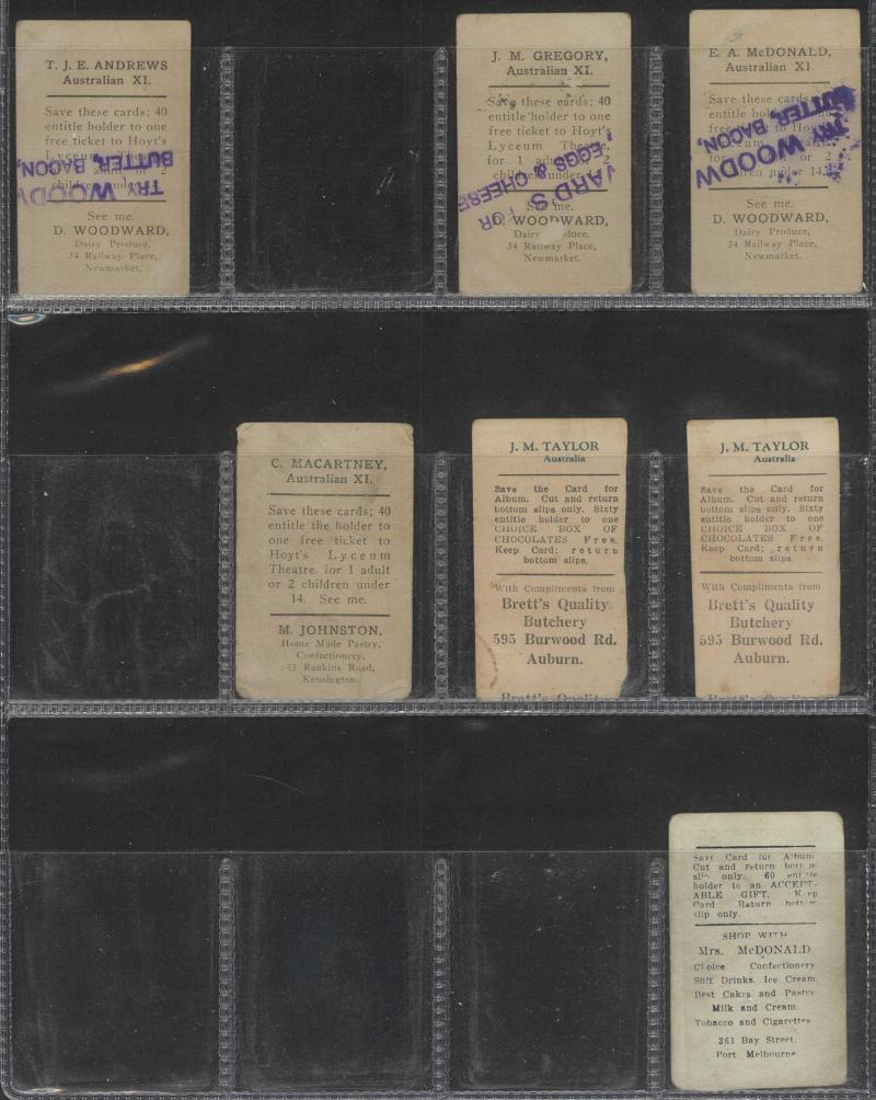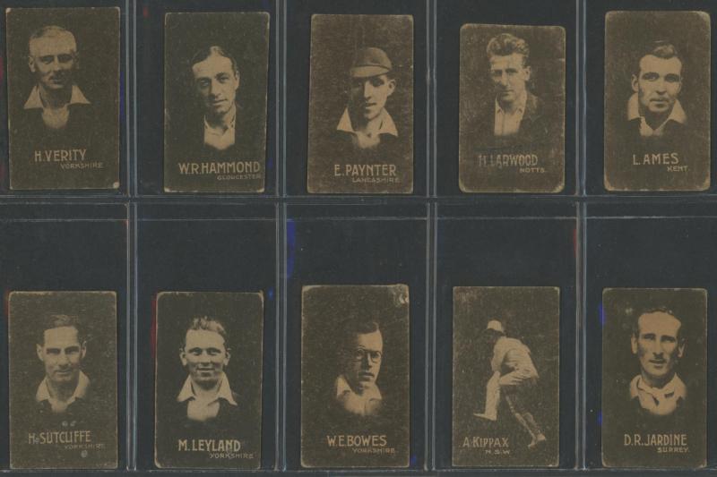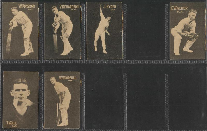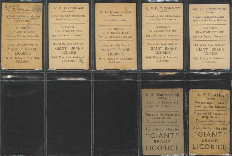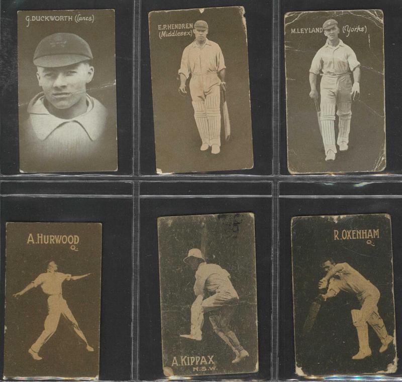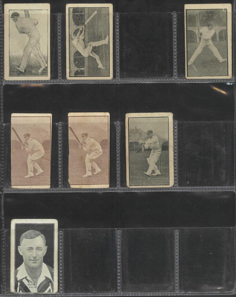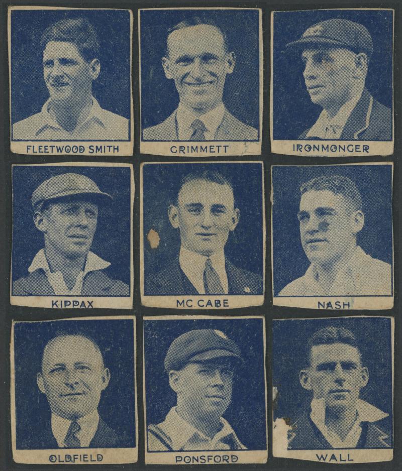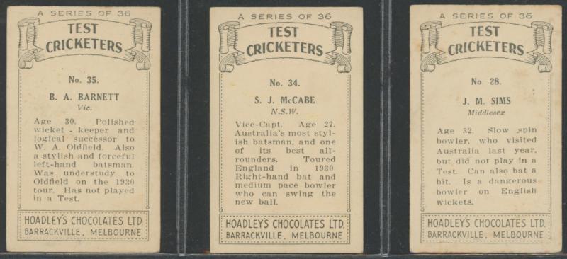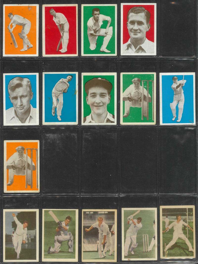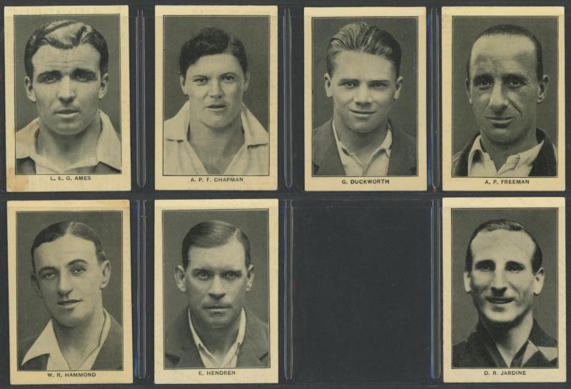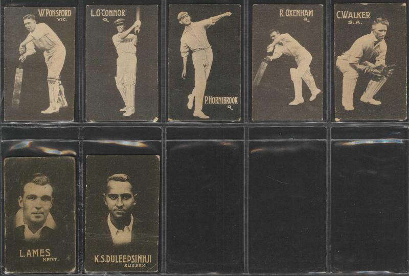 1930-31 'Australian Cricketers' [3/24]; 1931 'South African Cricketers' [12] & 3 spares; 1932-33 'English Cricketers' [2/18]; 1934 'Australian Cricketers' [2/24]; 1936-37 'Australian & English Cricketers' [2/44]; 1958 'Test Cricket Series' [17/32]