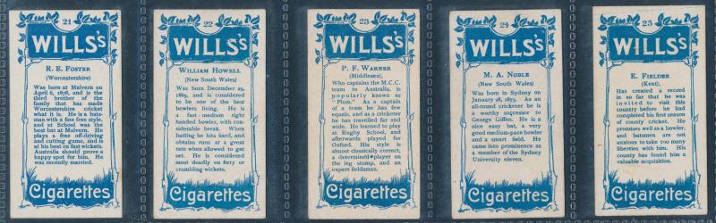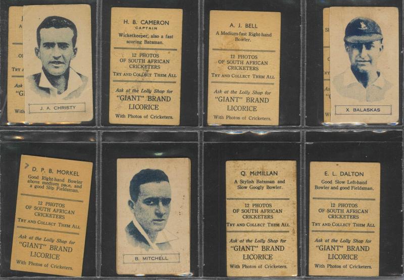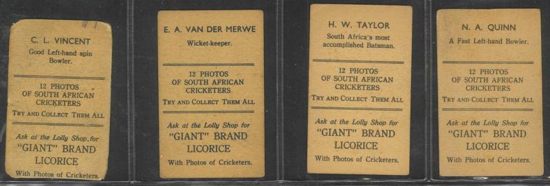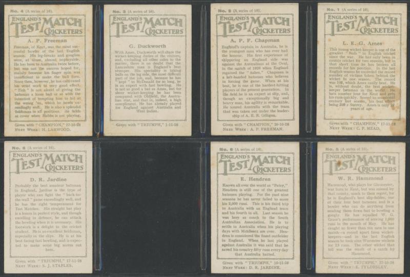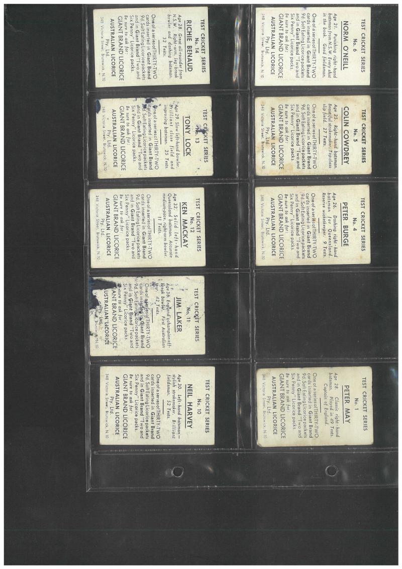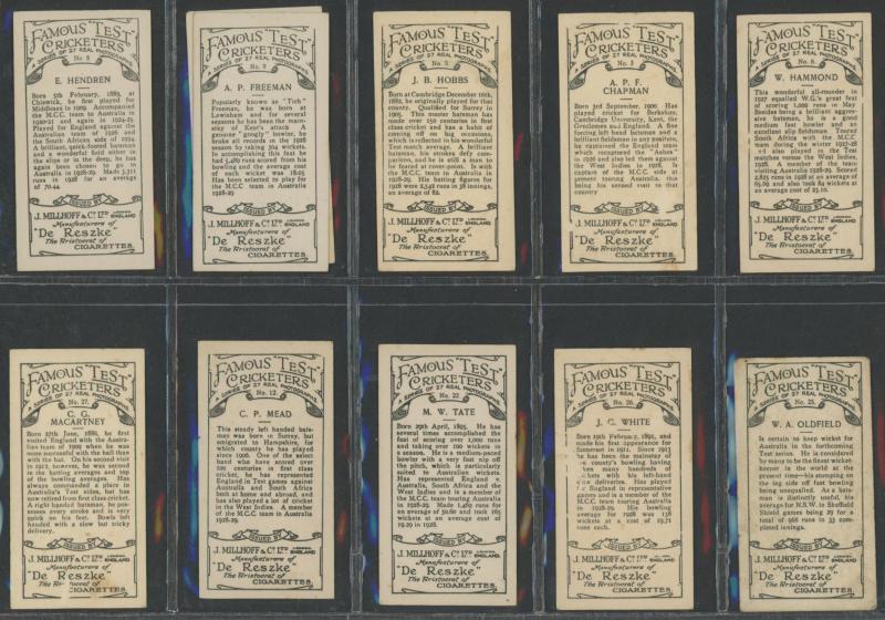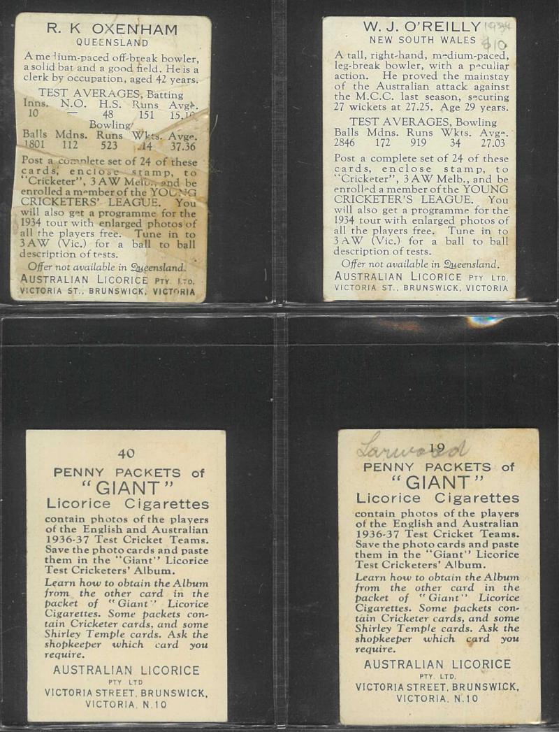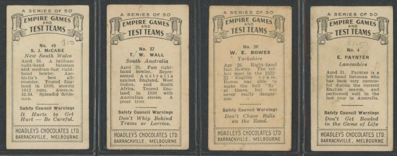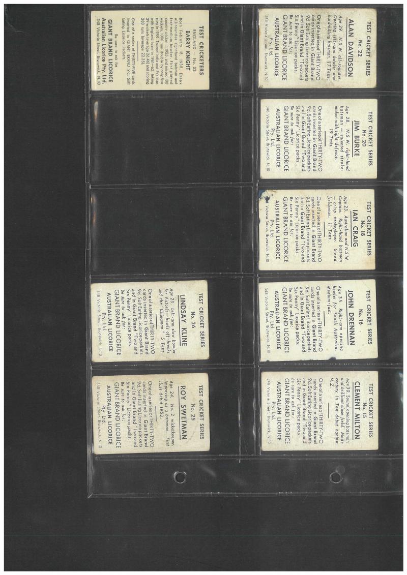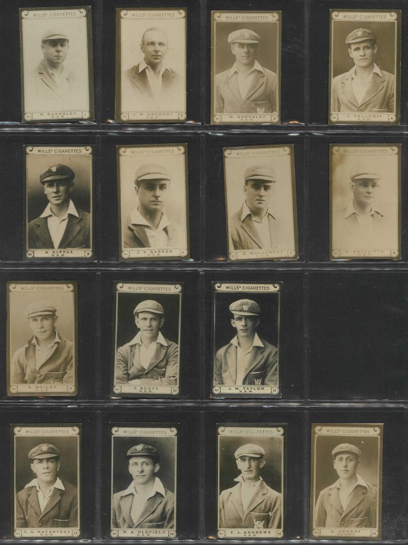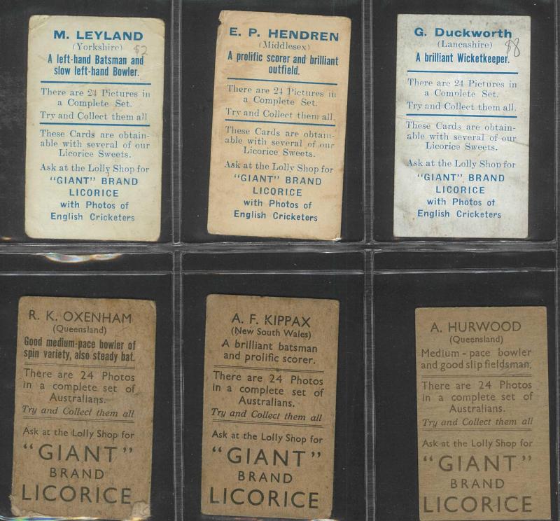 1930-31 'Australian Cricketers' [3/24]; 1931 'South African Cricketers' [12] & 3 spares; 1932-33 'English Cricketers' [2/18]; 1934 'Australian Cricketers' [2/24]; 1936-37 'Australian & English Cricketers' [2/44]; 1958 'Test Cricket Series' [17/32]