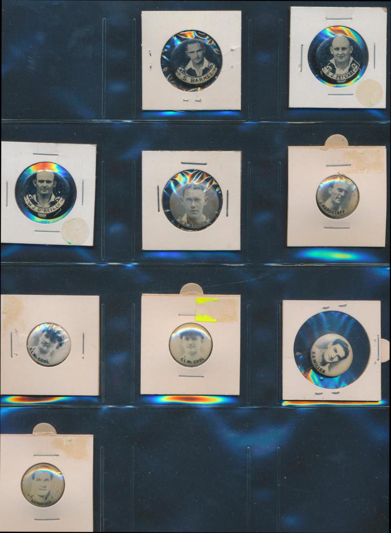 1930s-40s badges including rare 'Richardson-Grimmett Testimonial/Adelaide Oval Nov 26-30 1937'; 25mm S Barnes, SJ McCabe, WJ