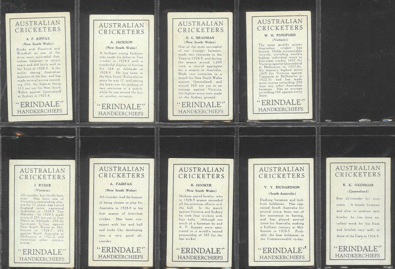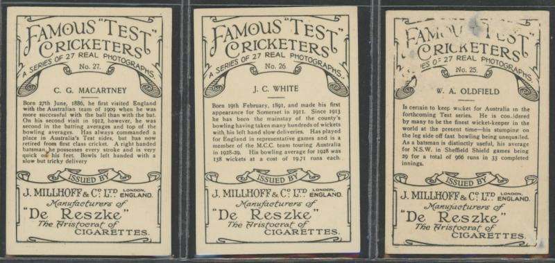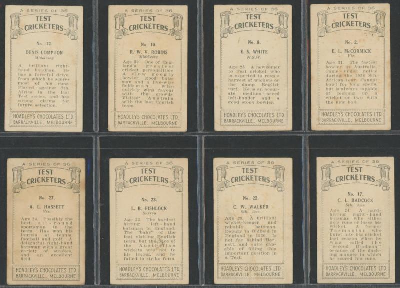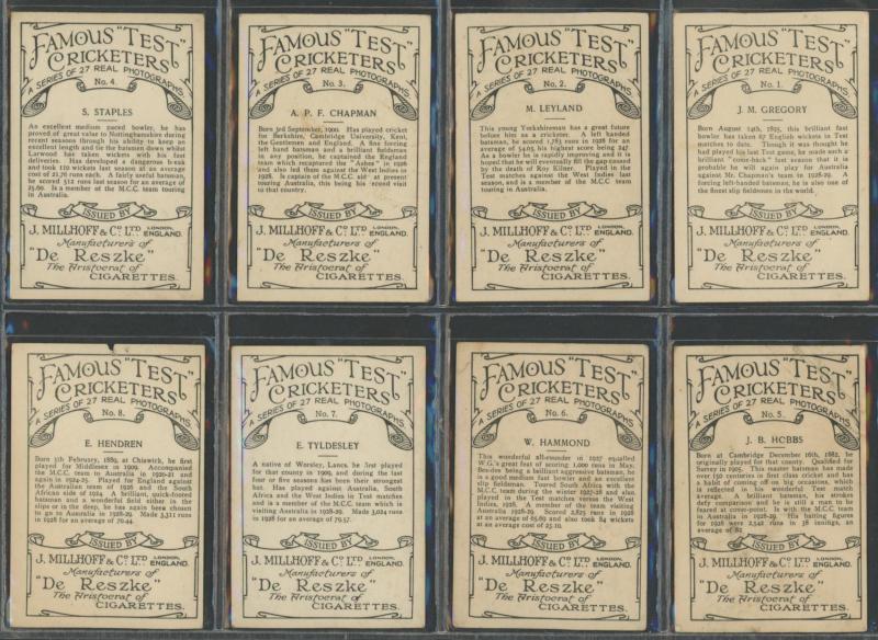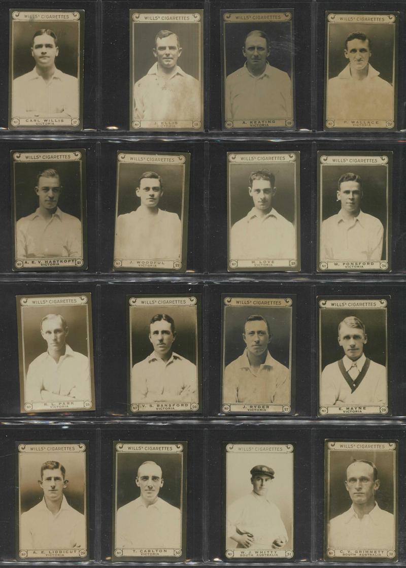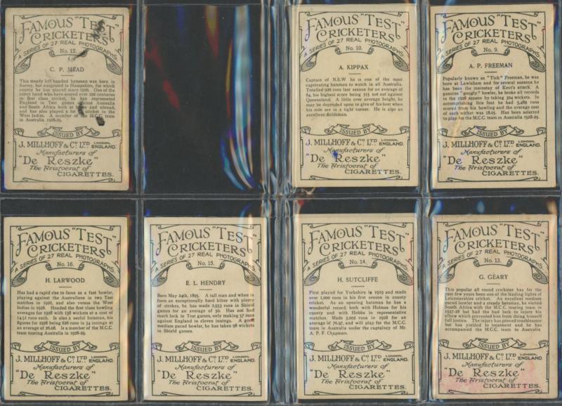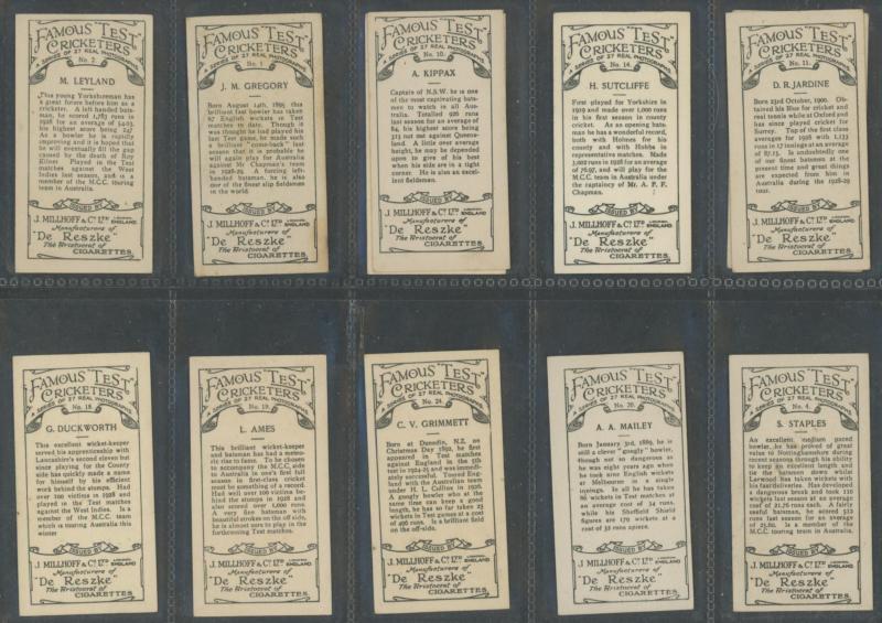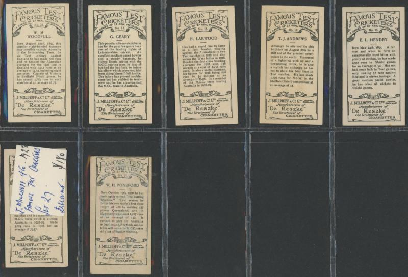 'Australian Cricketers' [25/27]; 1930-31 'Australian Cricketers' [13/24]; 1931 'South African Cricketers' [12]; 1932-33 'English Cricketers' [10/18]; 1934 'Australian Cricketers' [6/24]; 1936-37 'Australian & English Cricketers' [11/44]; 1958 'Test