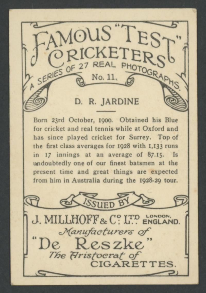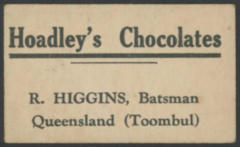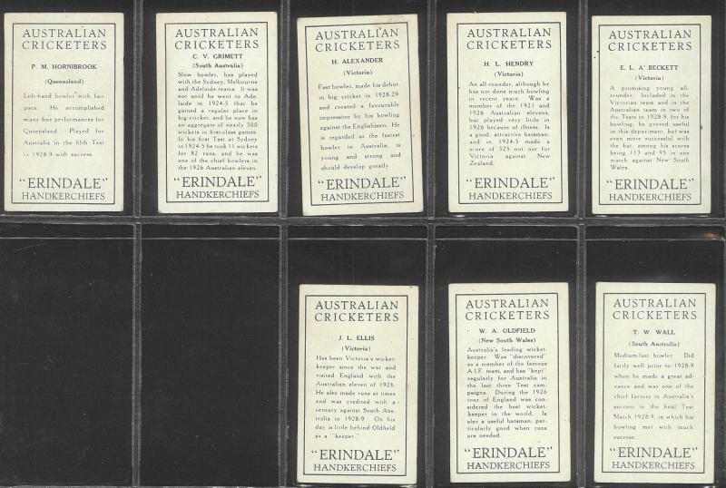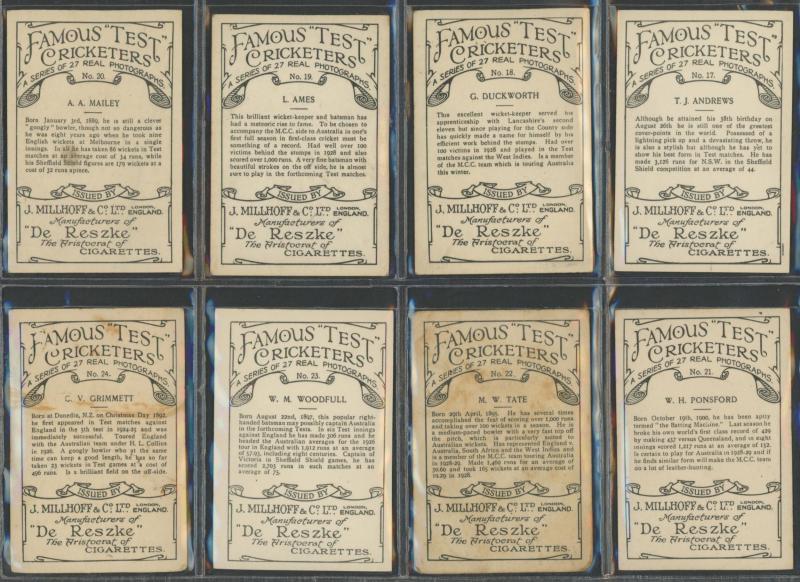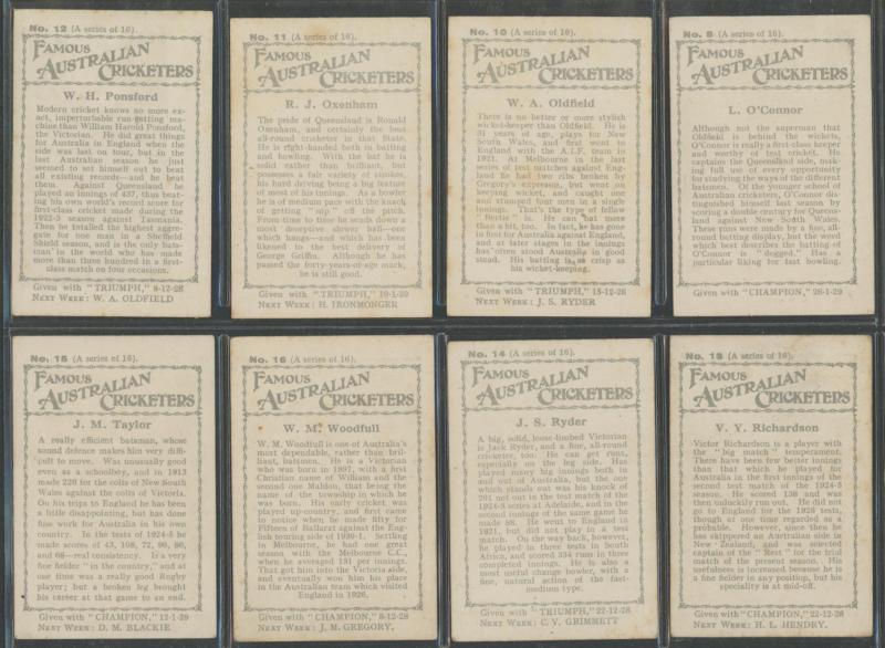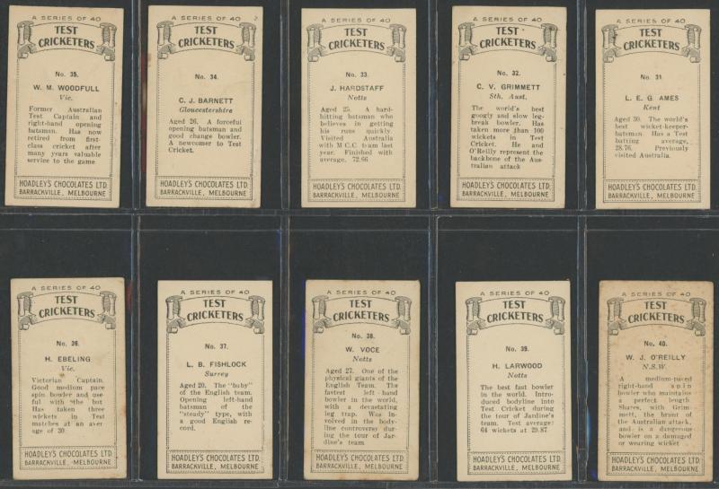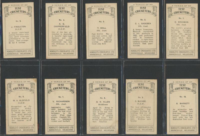 'Australian Cricketers' [25/27]; 1930-31 'Australian Cricketers' [13/24]; 1931 'South African Cricketers' [12]; 1932-33 'English Cricketers' [10/18]; 1934 'Australian Cricketers' [6/24]; 1936-37 'Australian & English Cricketers' [11/44]; 1958 'Test