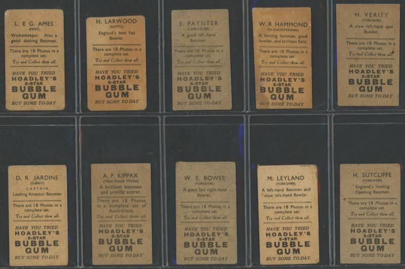 1928-36 Hoadleys cricket cards including 1928 [8/33]; 1932 'Empire Games & Test Teams' [4/50]; 1933 [22/36], 1936 [38/40], 1938