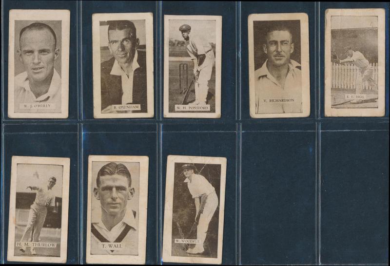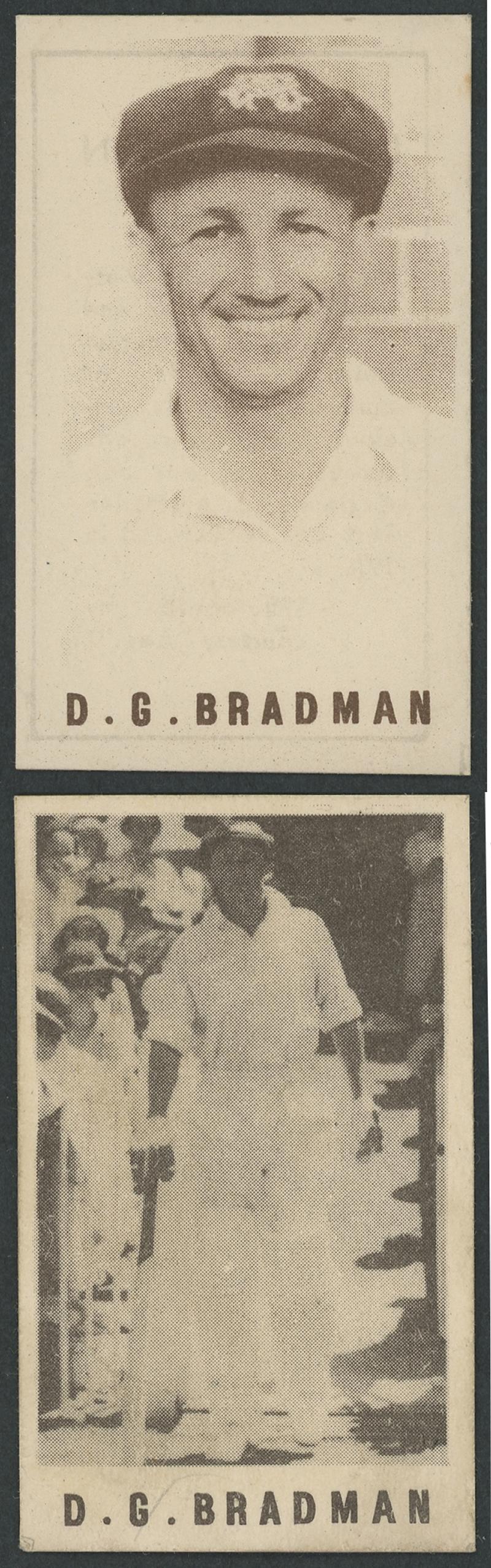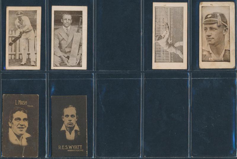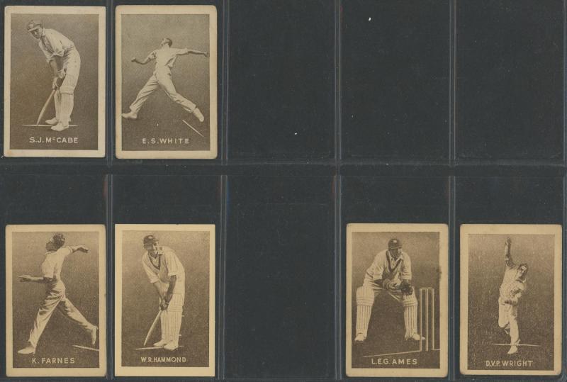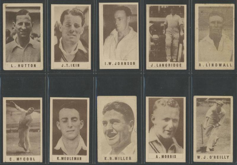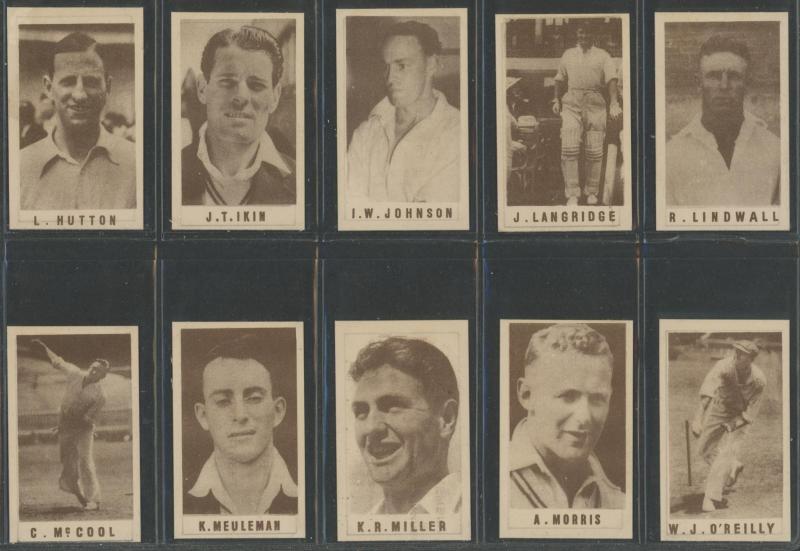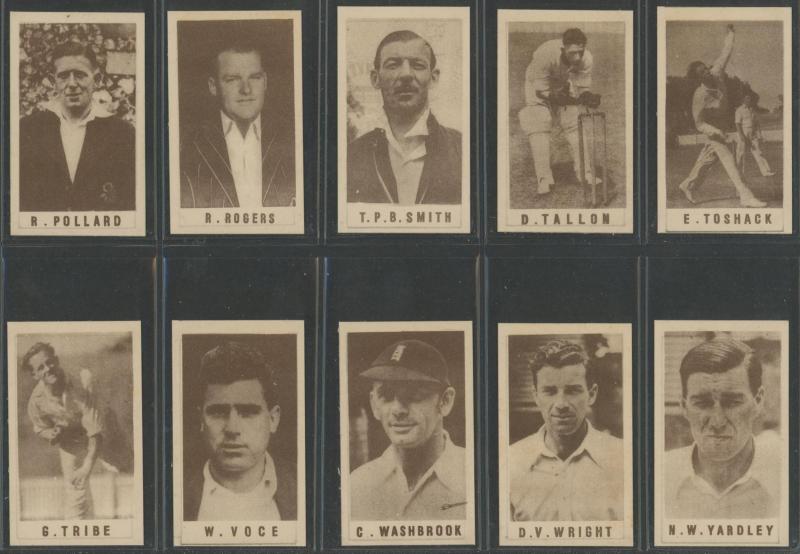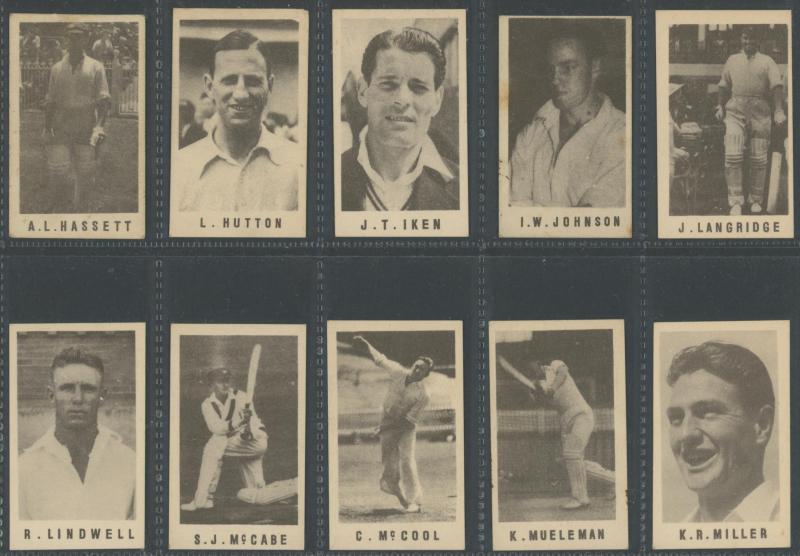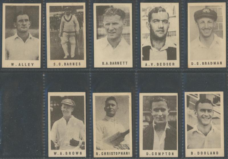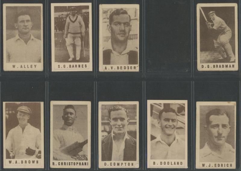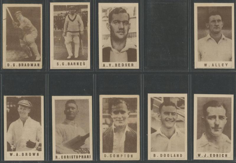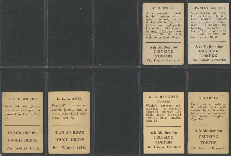 (Ask Mother for Cruising Toffee) 'Australian Cricketers' [2/10 known; 1938 (Black Crow Throat Drops) 'English Cricketers' [2/7 known]; 1938 (Ask Mother for Cruising Toffee) 'English Cricketers' [2/7 known], mainly Fair/Very Fine condition. Rare.