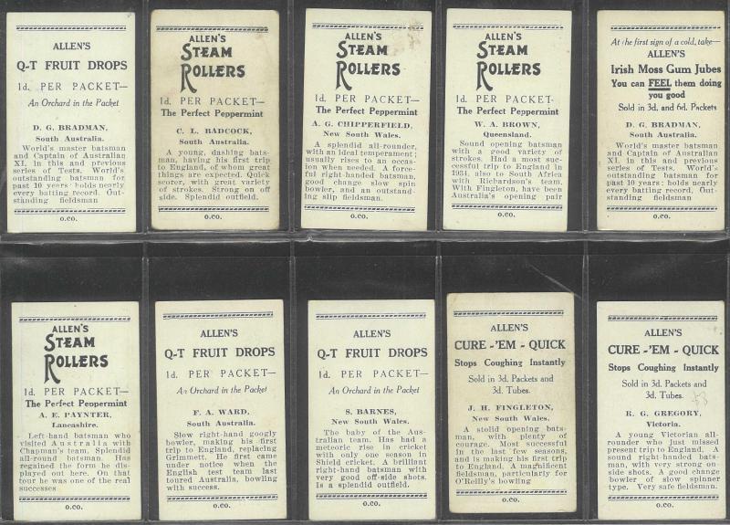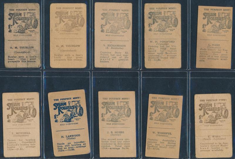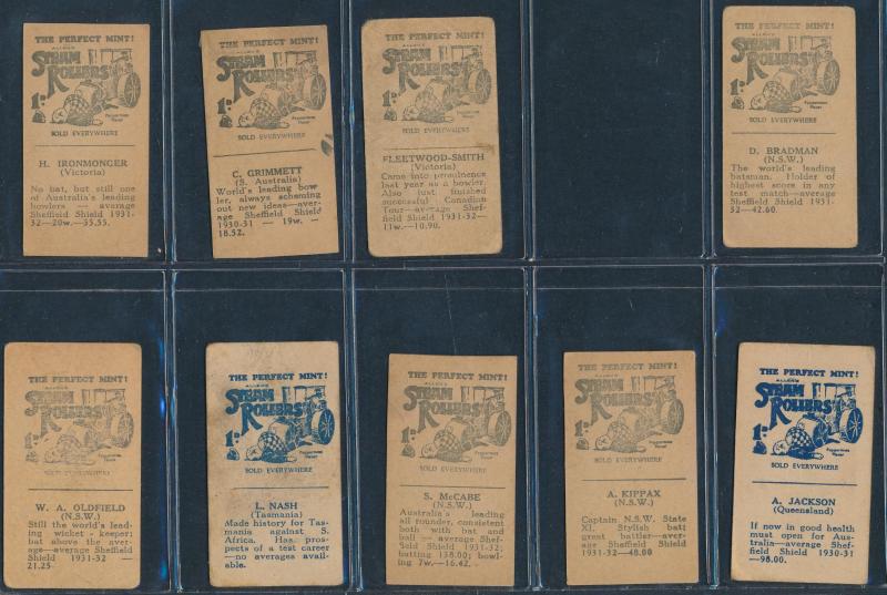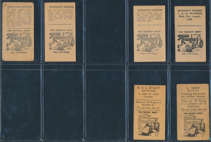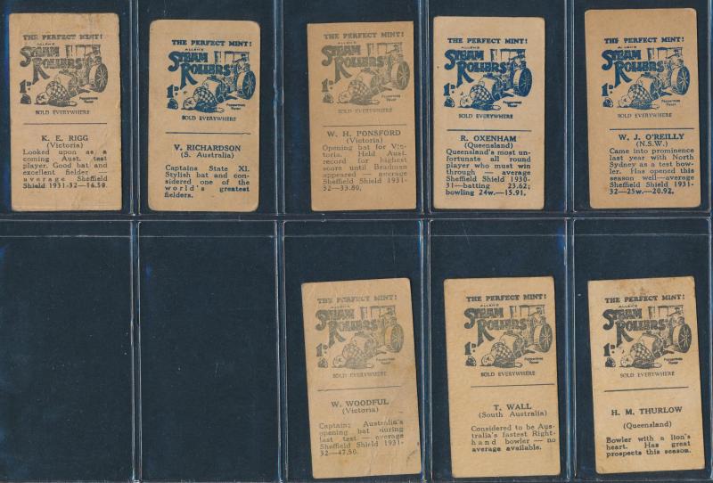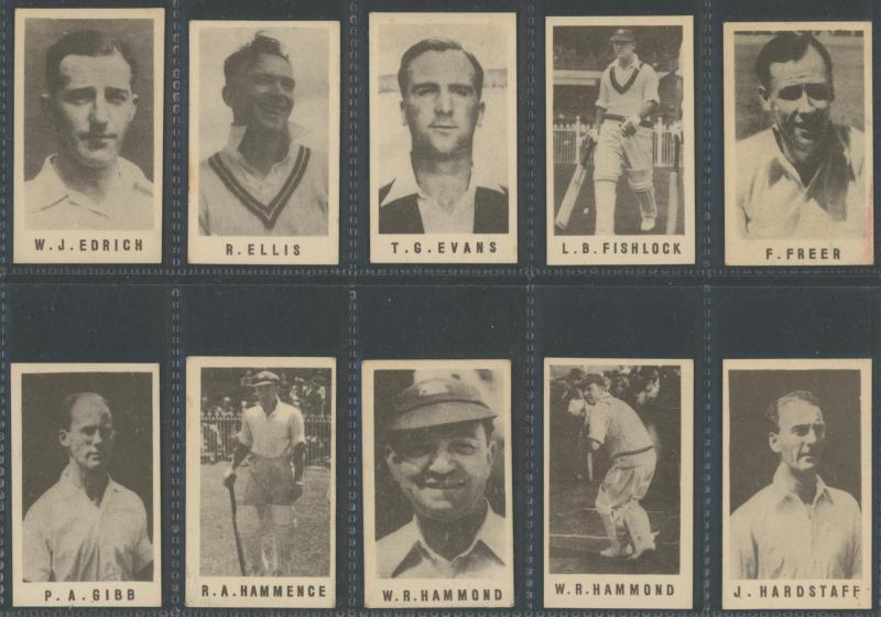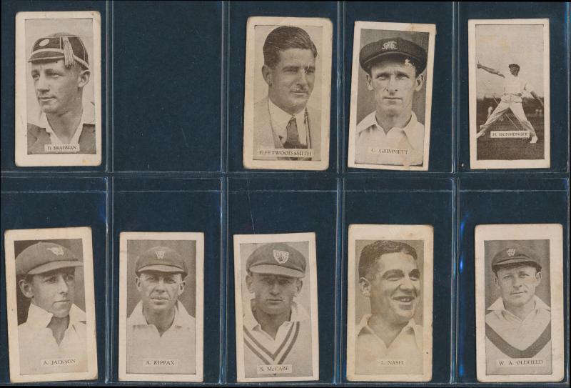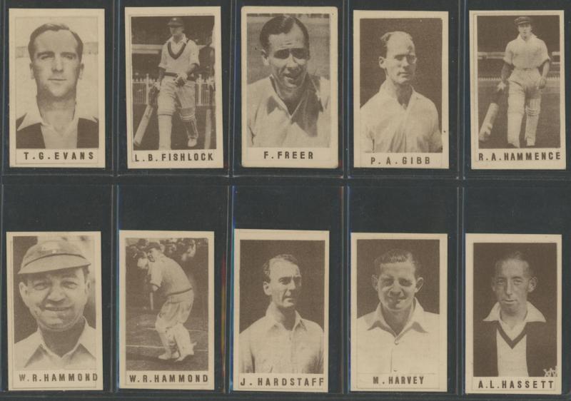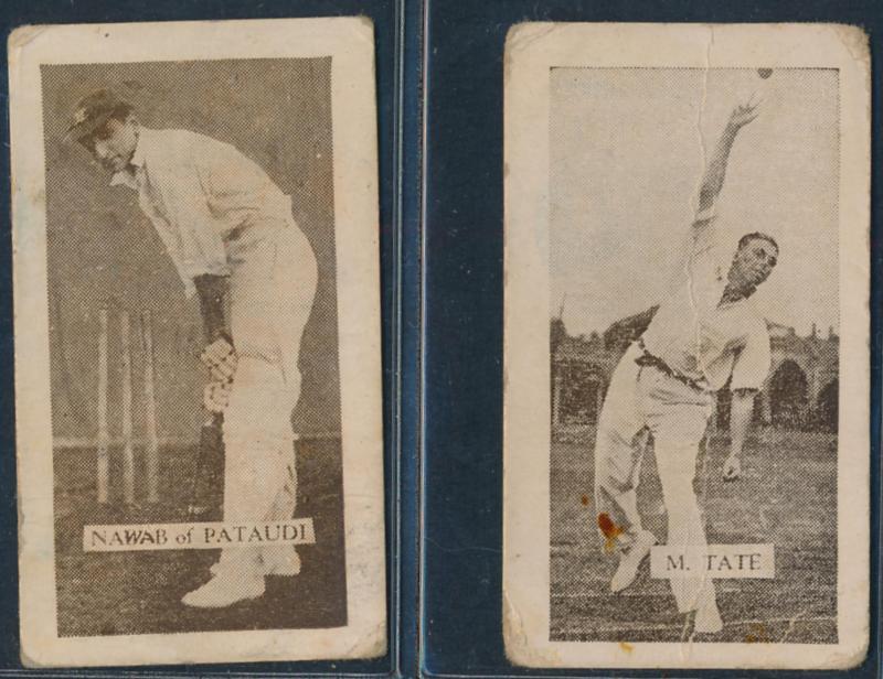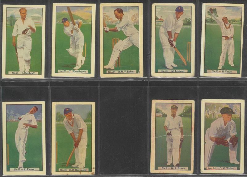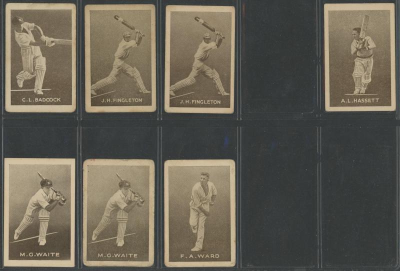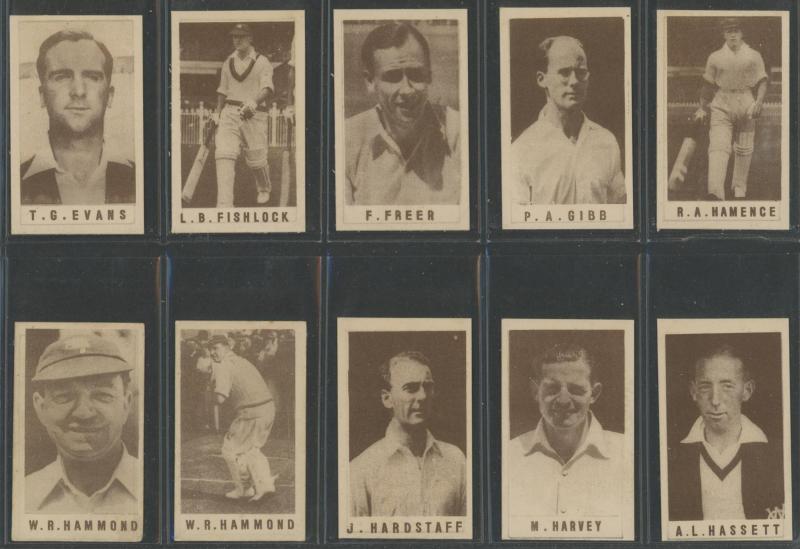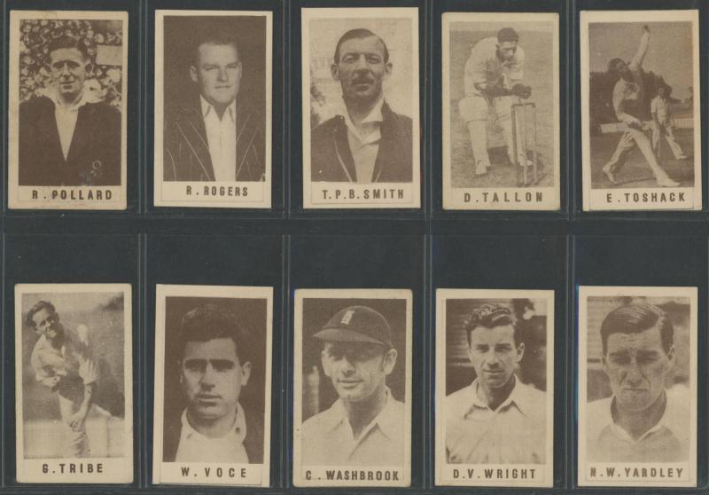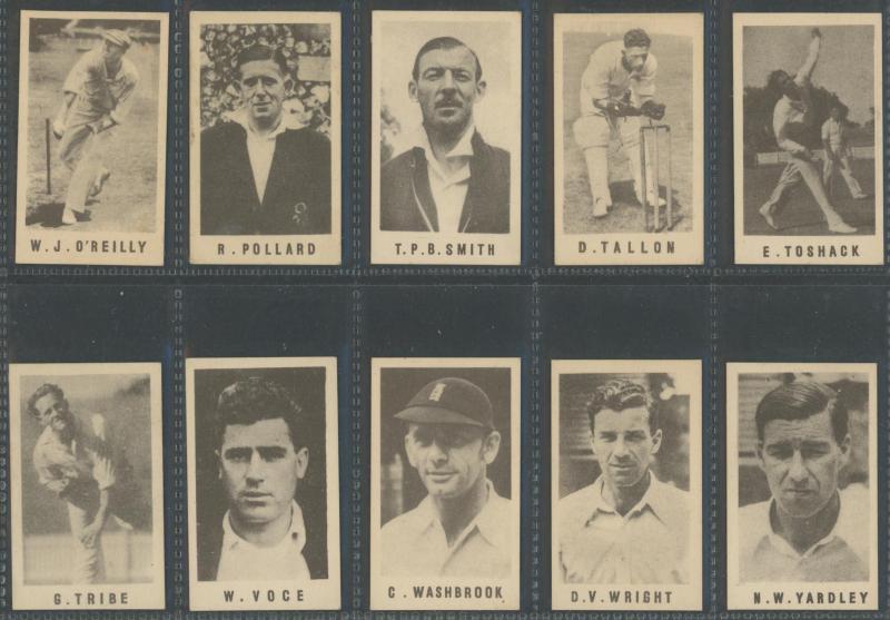 (Ask Mother for Cruising Toffee) 'Australian Cricketers' [2/10 known; 1938 (Black Crow Throat Drops) 'English Cricketers' [2/7 known]; 1938 (Ask Mother for Cruising Toffee) 'English Cricketers' [2/7 known], mainly Fair/Very Fine condition. Rare.