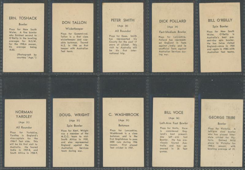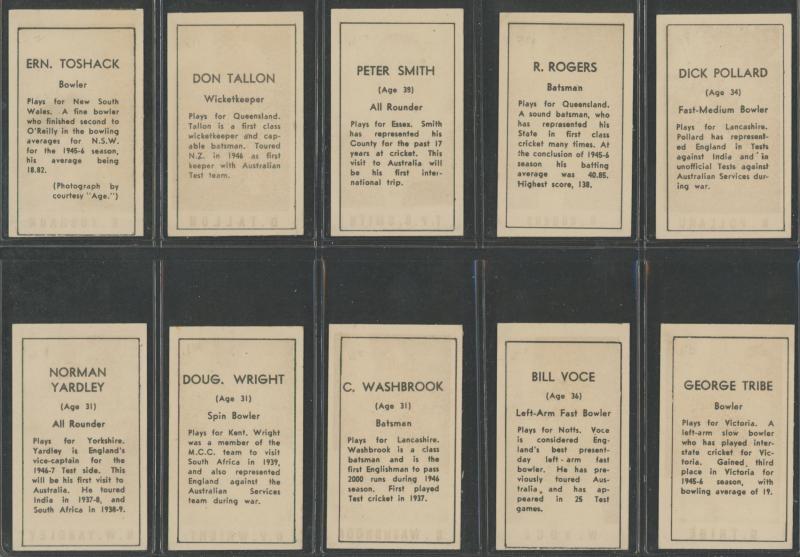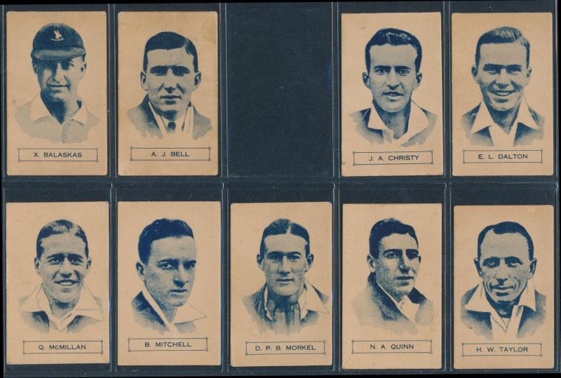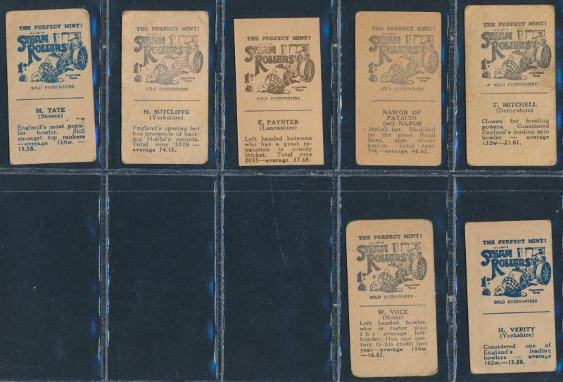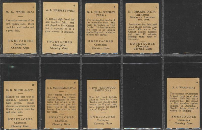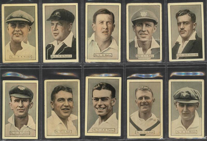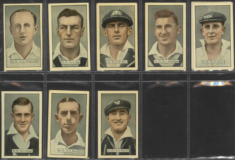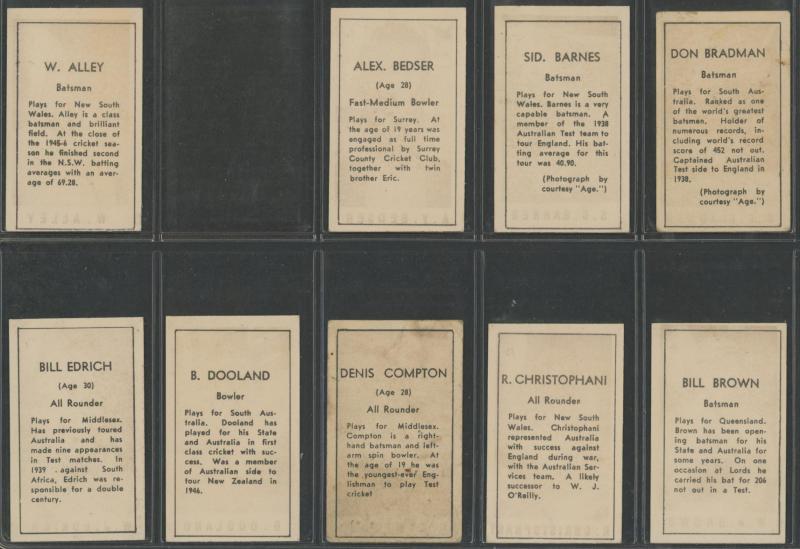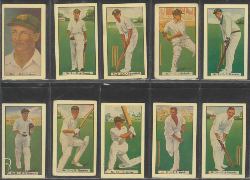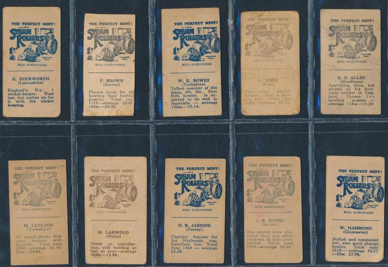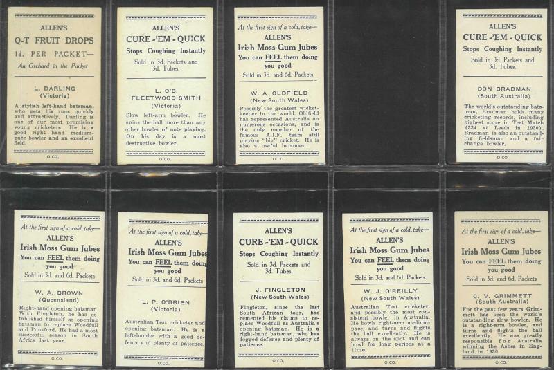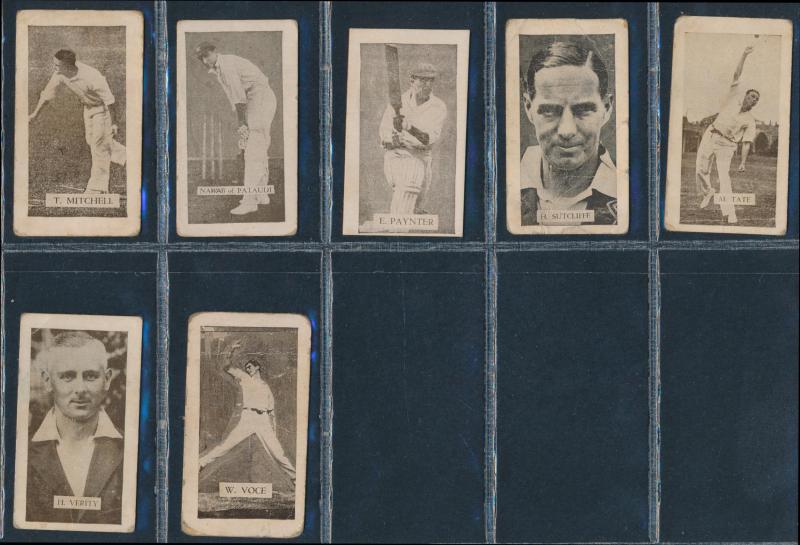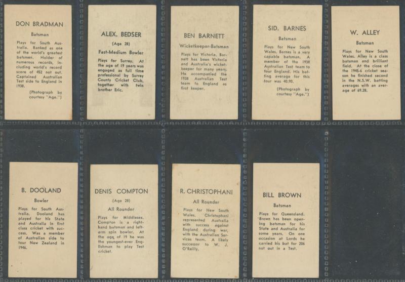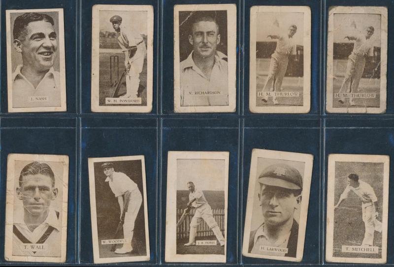 (Ask Mother for Cruising Toffee) 'Australian Cricketers' [2/10 known; 1938 (Black Crow Throat Drops) 'English Cricketers' [2/7 known]; 1938 (Ask Mother for Cruising Toffee) 'English Cricketers' [2/7 known], mainly Fair/Very Fine condition. Rare.