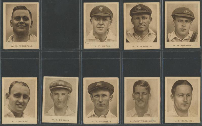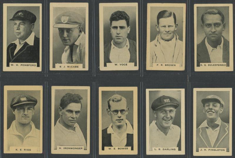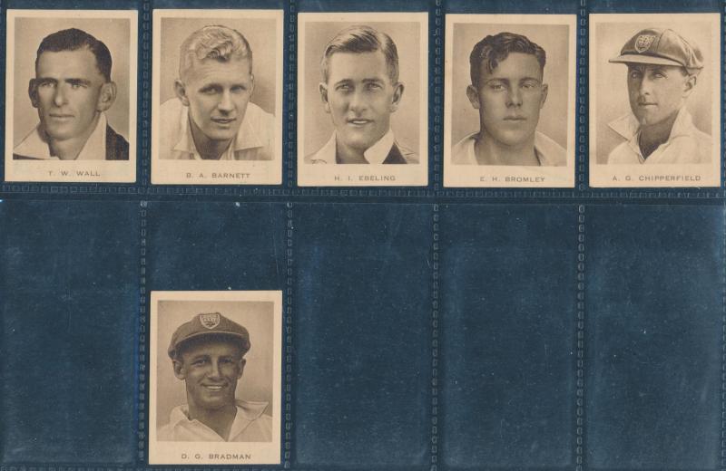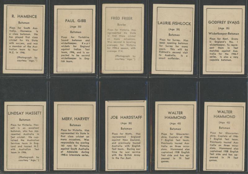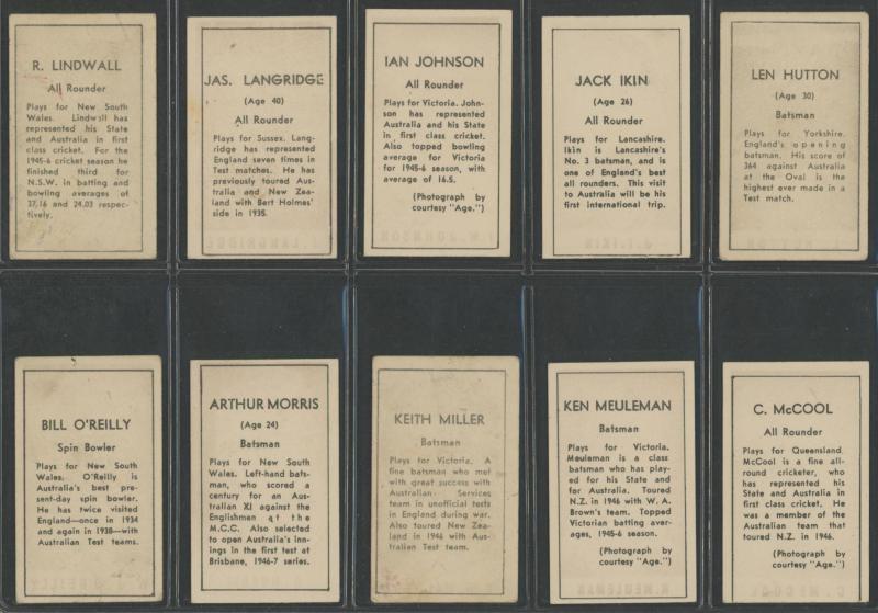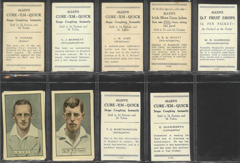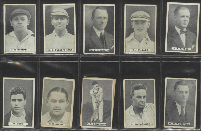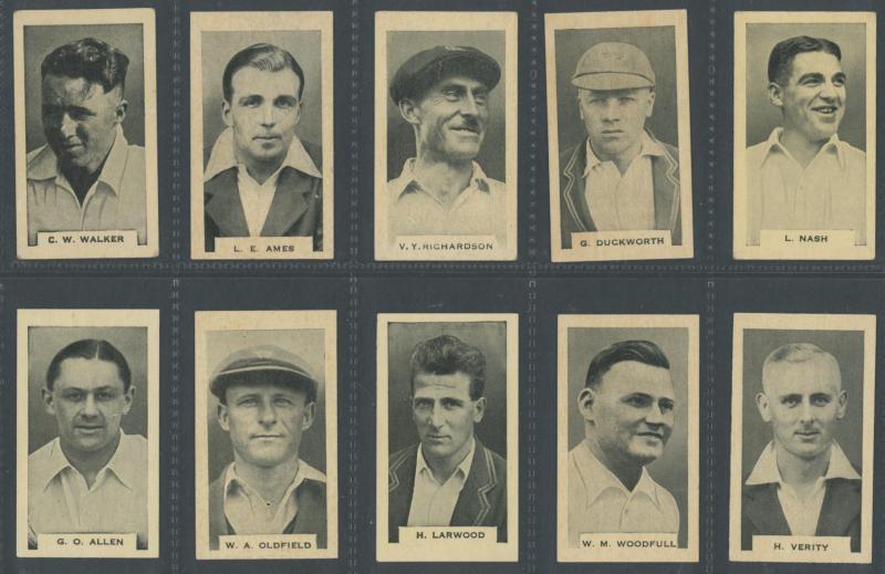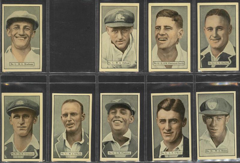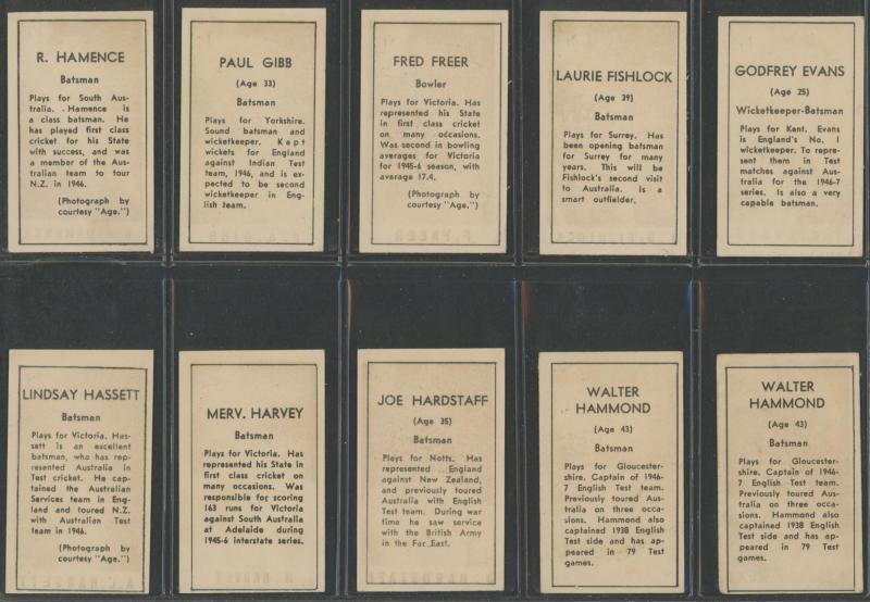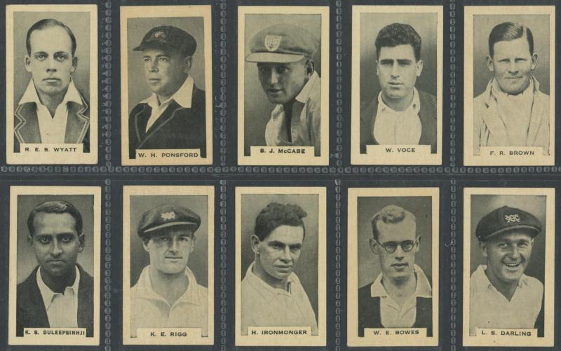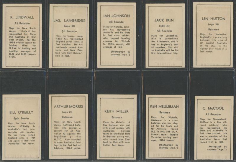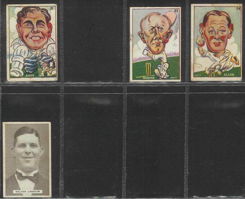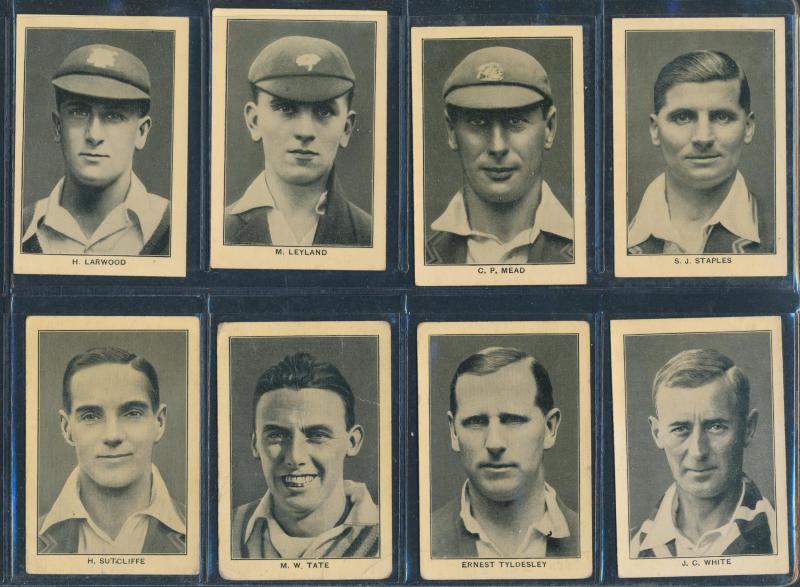 (Ask Mother for Cruising Toffee) 'Australian Cricketers' [2/10 known; 1938 (Black Crow Throat Drops) 'English Cricketers' [2/7 known]; 1938 (Ask Mother for Cruising Toffee) 'English Cricketers' [2/7 known], mainly Fair/Very Fine condition. Rare.