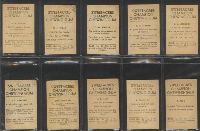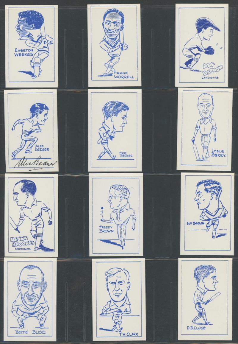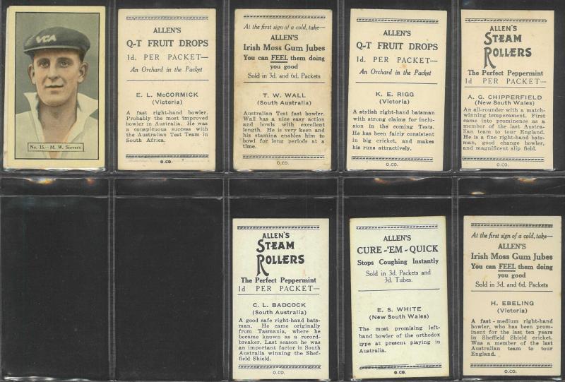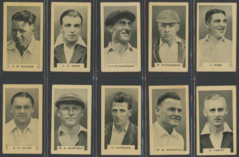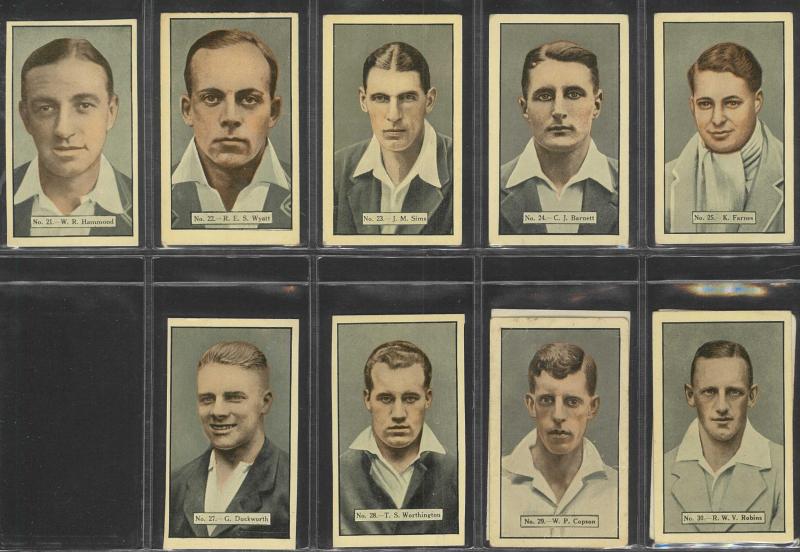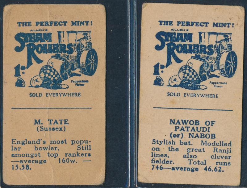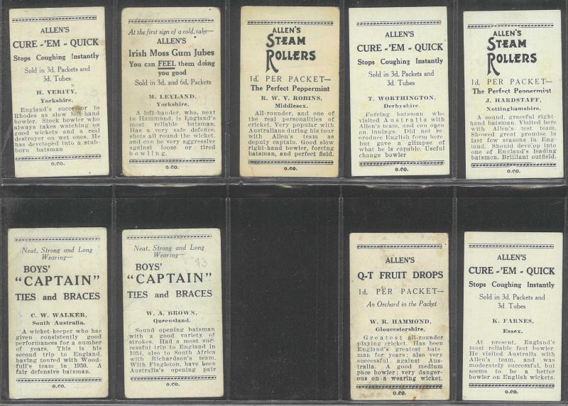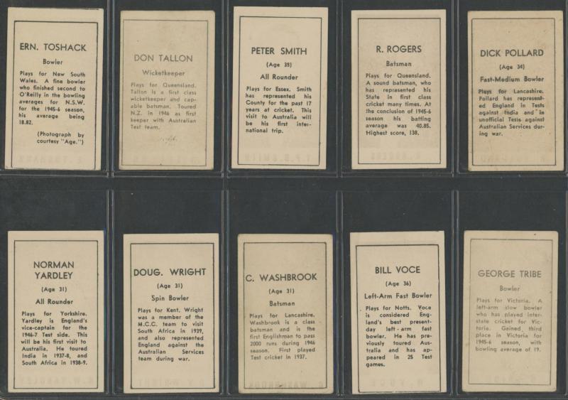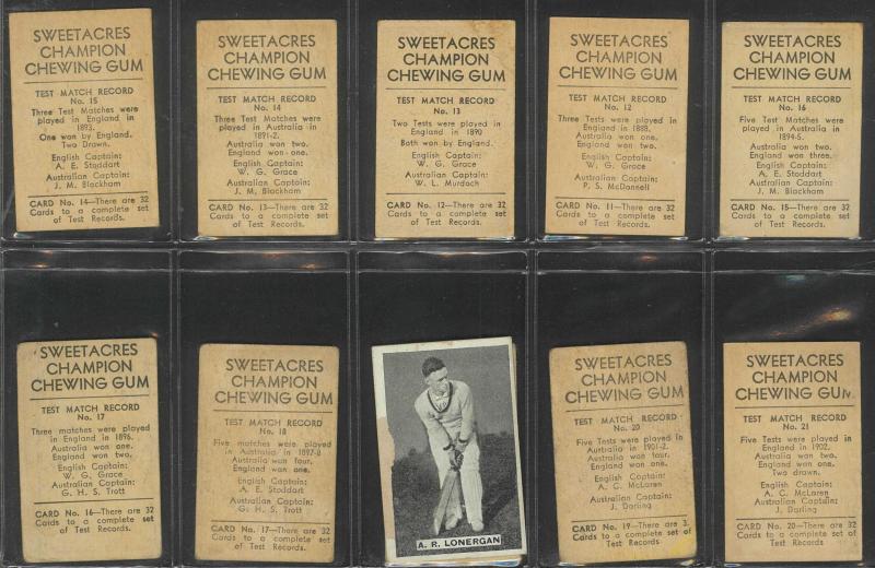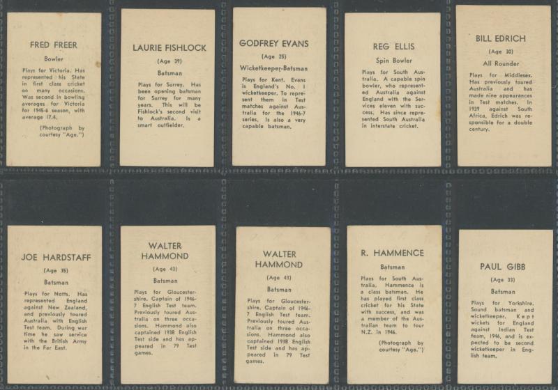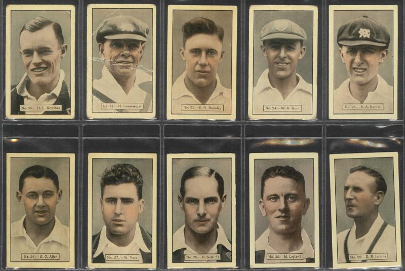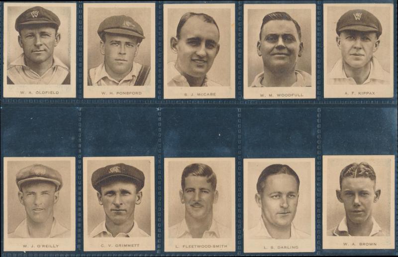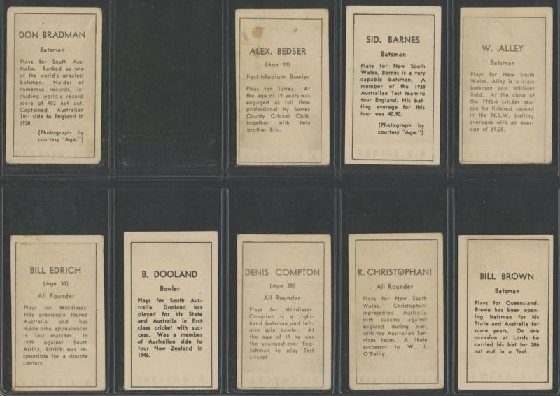 (Ask Mother for Cruising Toffee) 'Australian Cricketers' [2/10 known; 1938 (Black Crow Throat Drops) 'English Cricketers' [2/7 known]; 1938 (Ask Mother for Cruising Toffee) 'English Cricketers' [2/7 known], mainly Fair/Very Fine condition. Rare.
