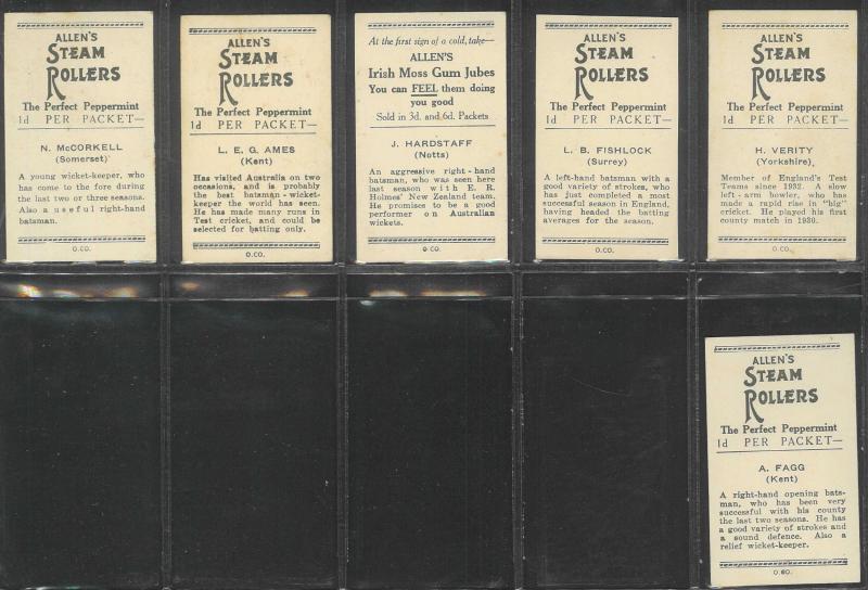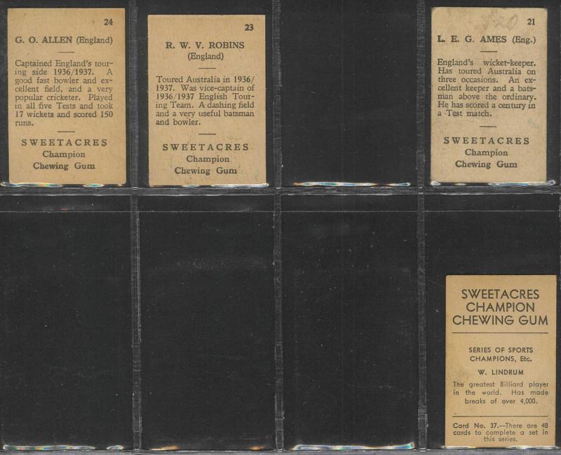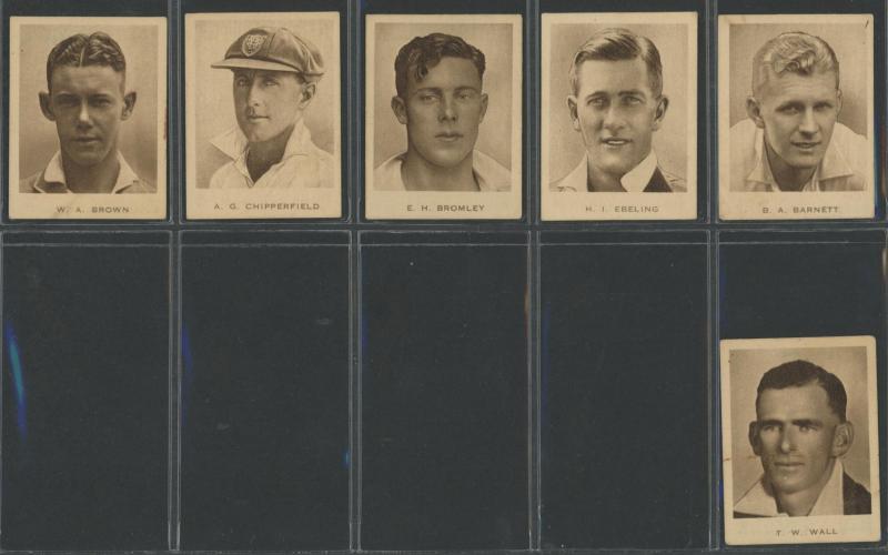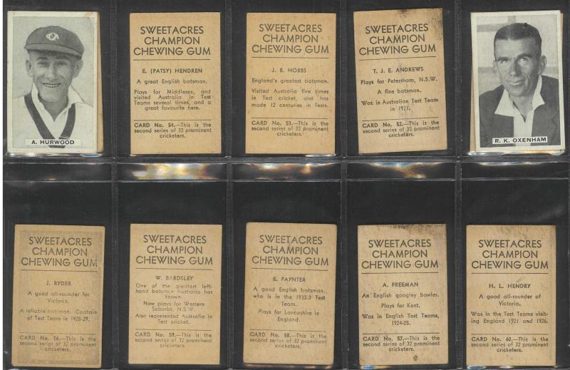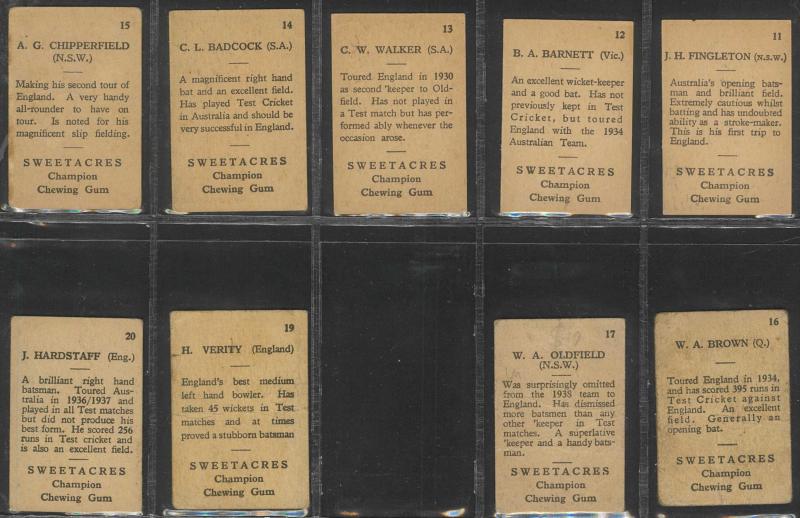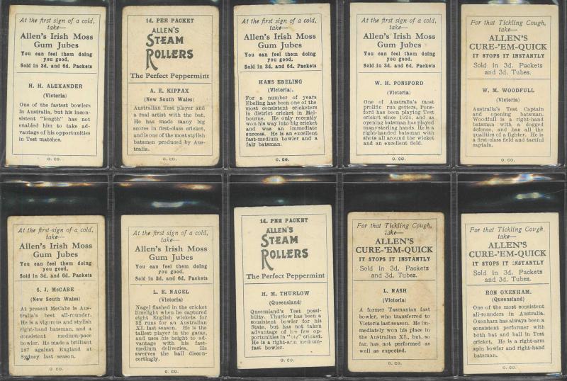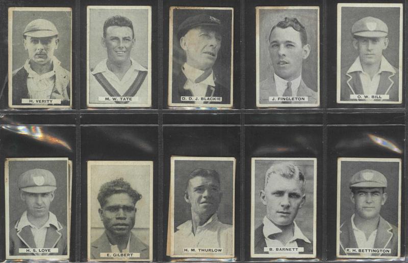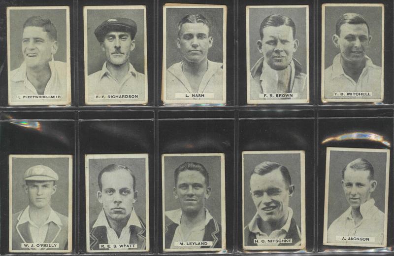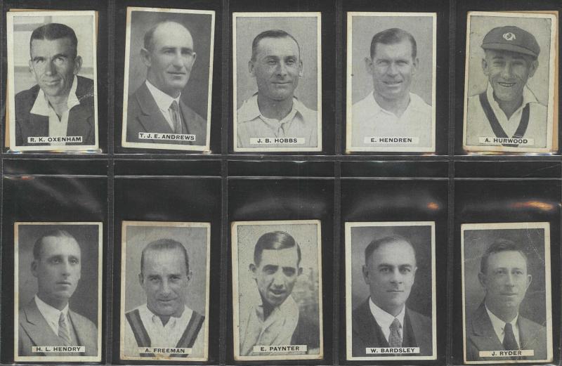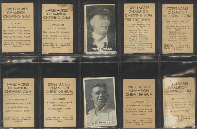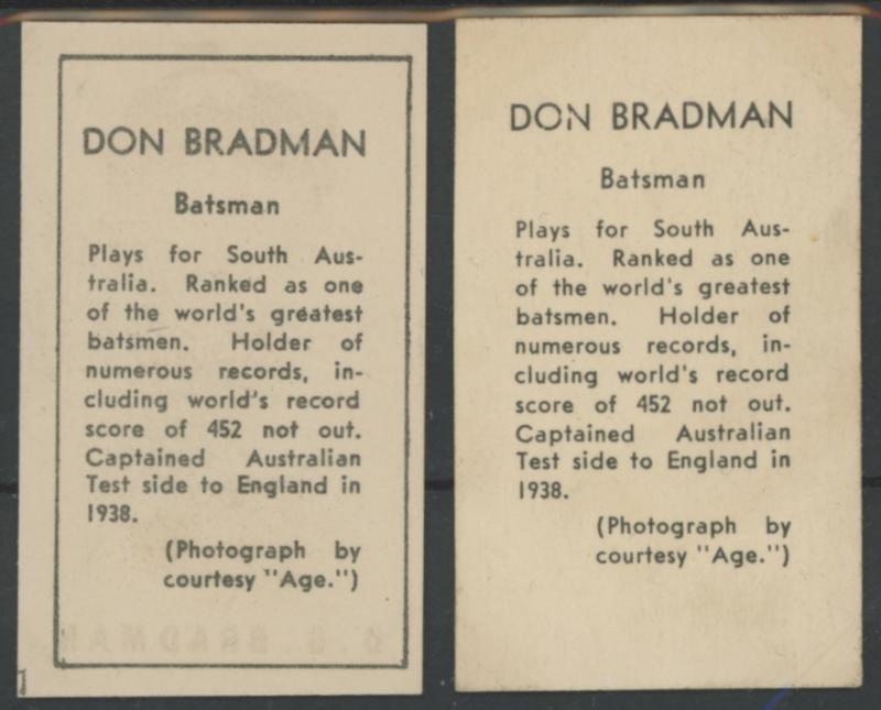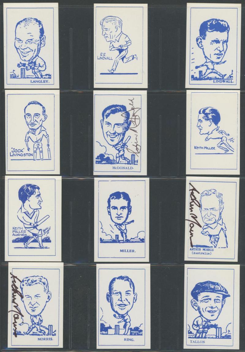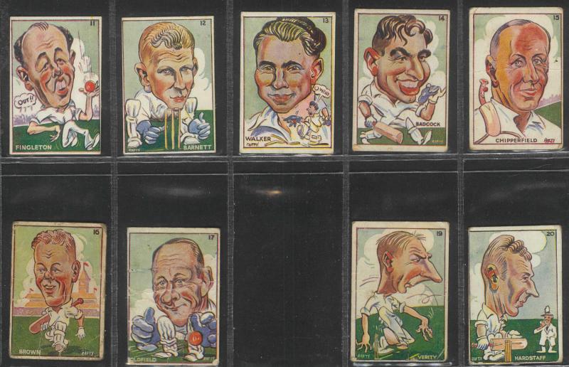 (Ask Mother for Cruising Toffee) 'Australian Cricketers' [2/10 known; 1938 (Black Crow Throat Drops) 'English Cricketers' [2/7 known]; 1938 (Ask Mother for Cruising Toffee) 'English Cricketers' [2/7 known], mainly Fair/Very Fine condition. Rare.