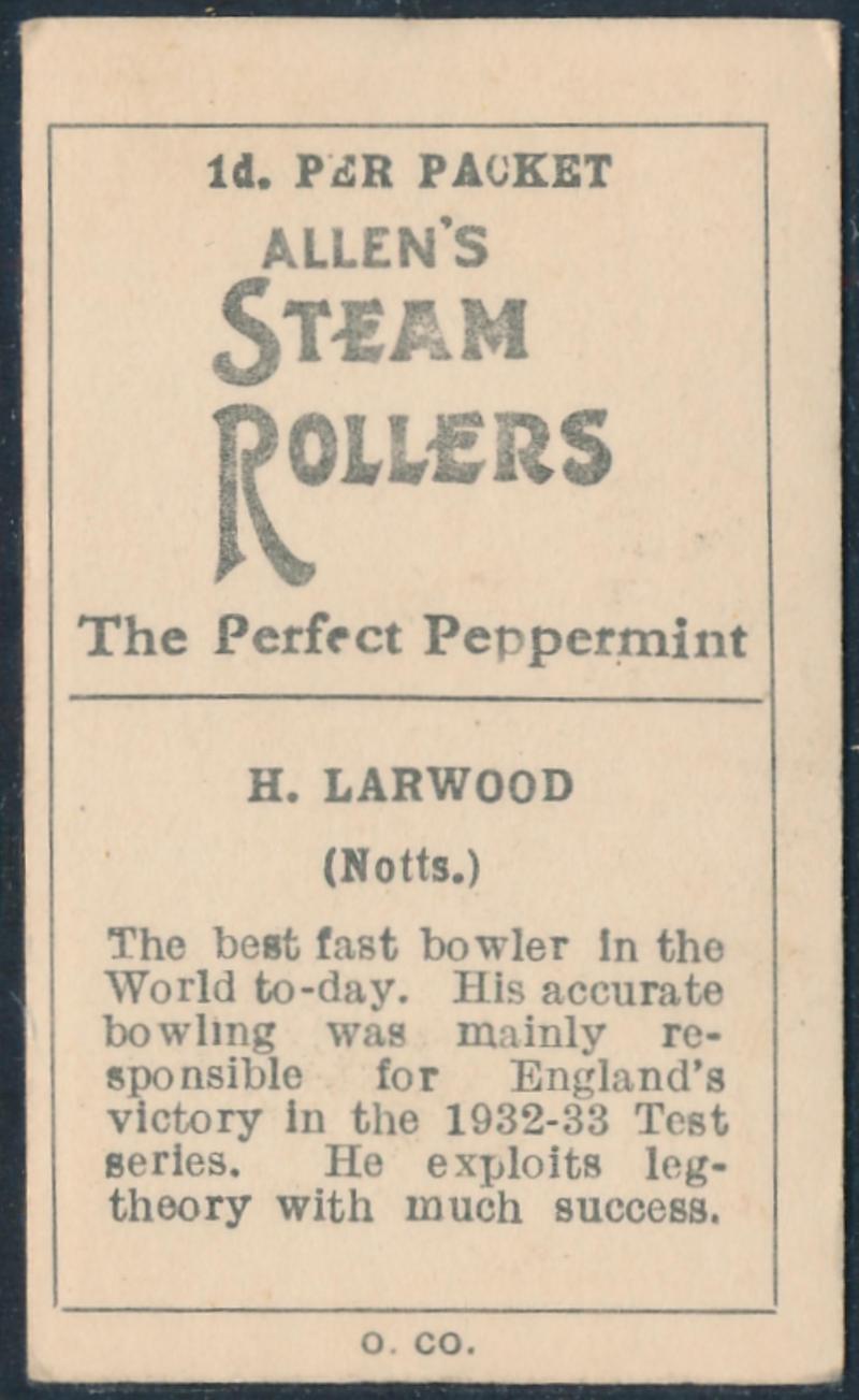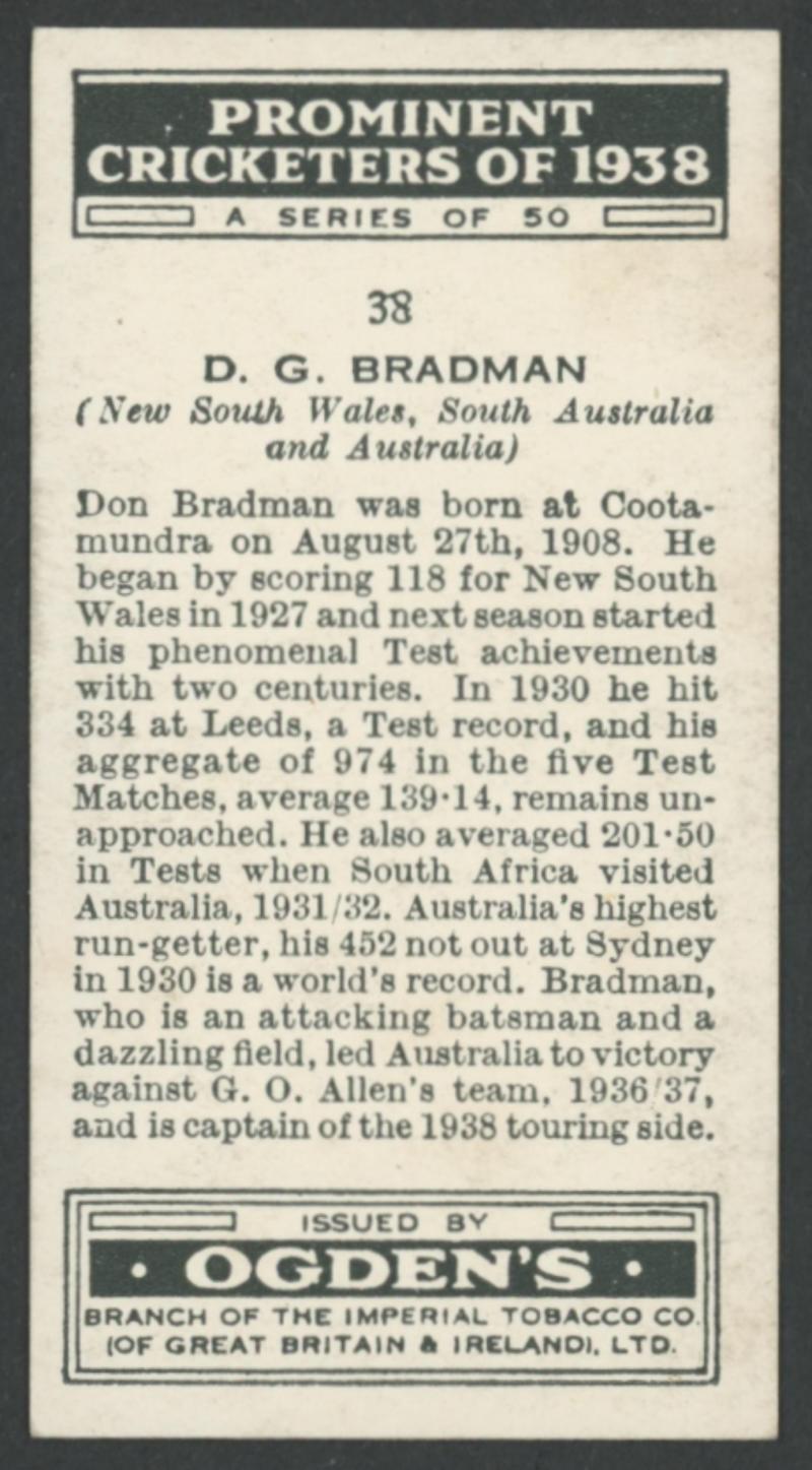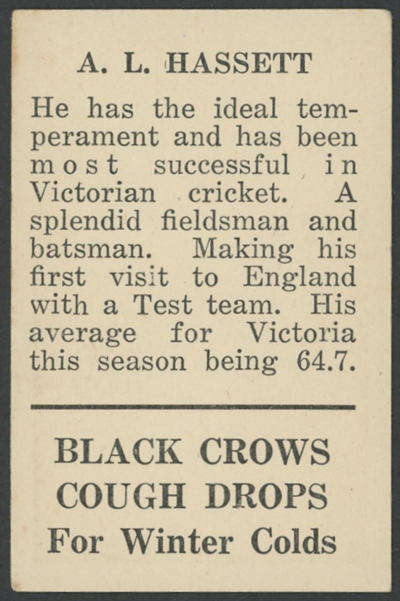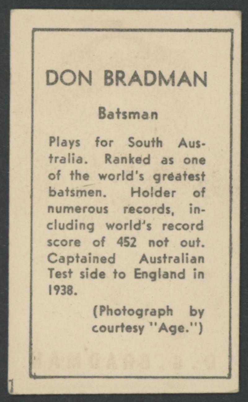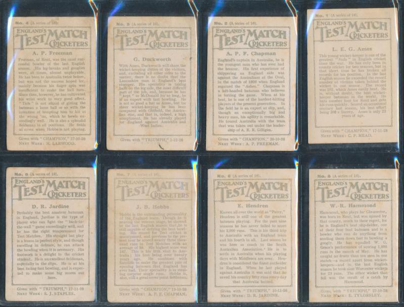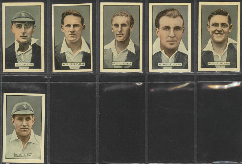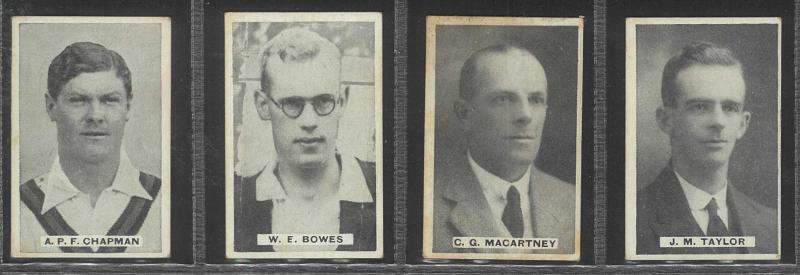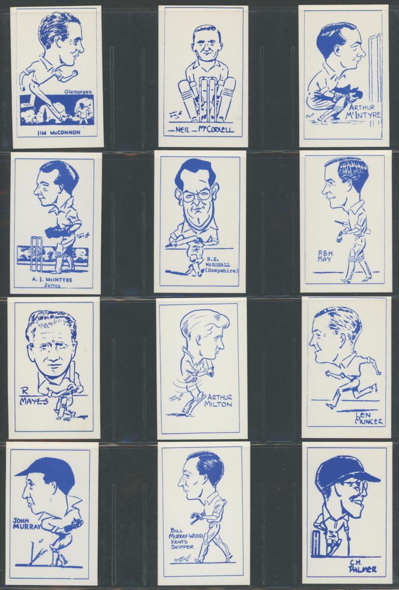 (Ask Mother for Cruising Toffee) 'Australian Cricketers' [2/10 known; 1938 (Black Crow Throat Drops) 'English Cricketers' [2/7 known]; 1938 (Ask Mother for Cruising Toffee) 'English Cricketers' [2/7 known], mainly Fair/Very Fine condition. Rare.