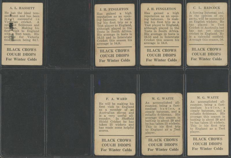1936-38 Griffiths Brothers range comprising 1937 (Black Crow Cough Drops) 'Australian Cricketers' [5/11 known & 3 spares]; 1937