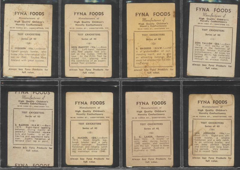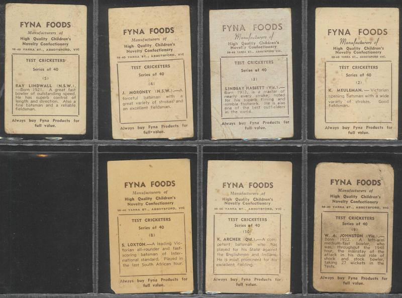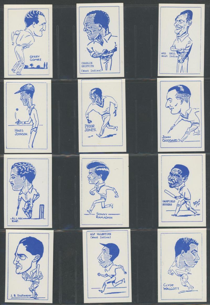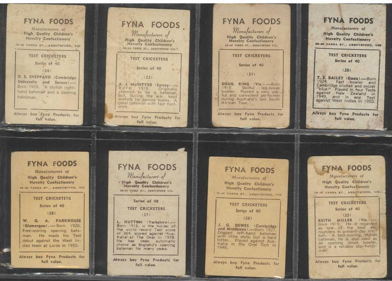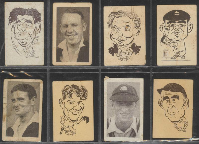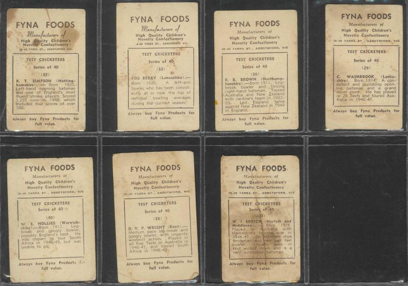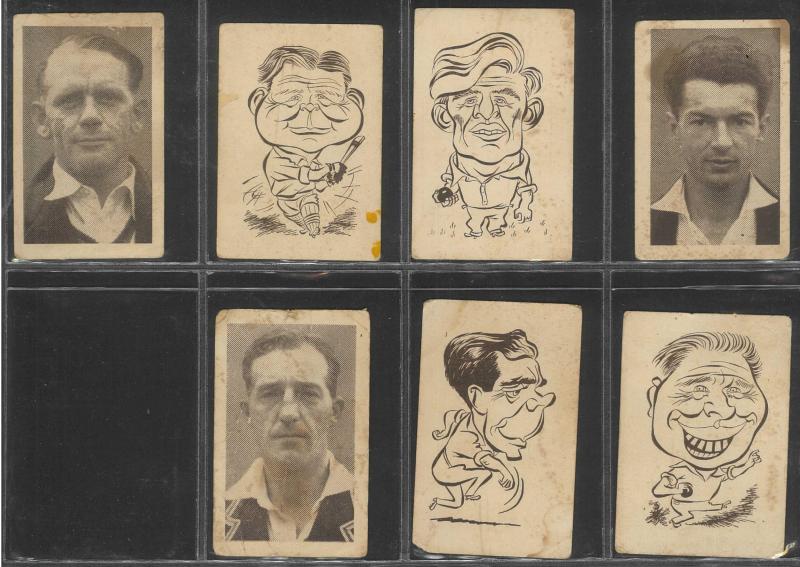 1950 Fyna Foods 'Test Cricketers' (portraits & caricatures) almost complete set [32/40], mainly Poor/Fine. Rare set.