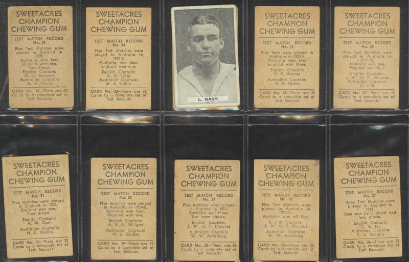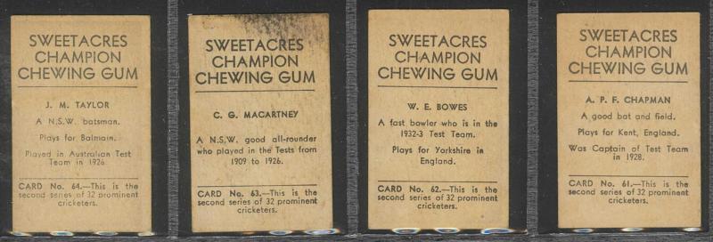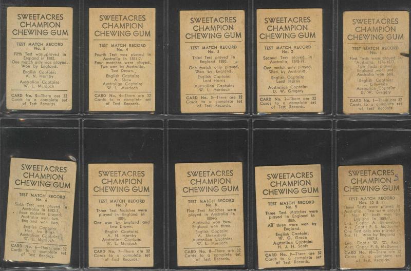 1930-38 Sweetacres cards including 1932 'Test Match Records' [32] & 'Prominent Cricketers [32] plus 7 spares; 1938 'Cricket
