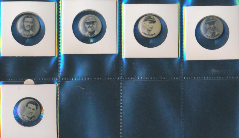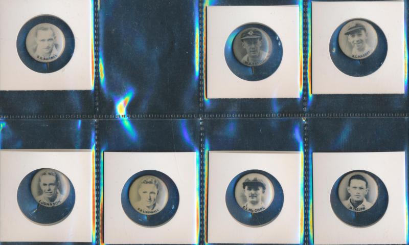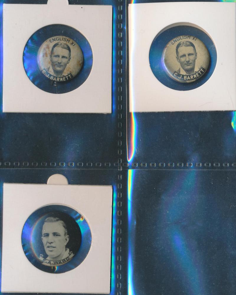 1936-37 cricket badges 'Australian XI' [6/12] & 'English XI' [1/14] plus 3 spares; also 1938 badge FA Ward, mainly Poor/Fine.