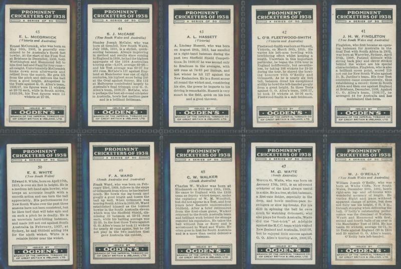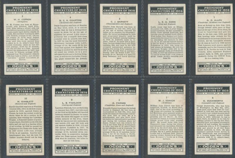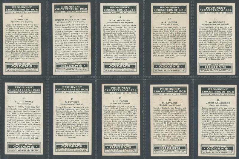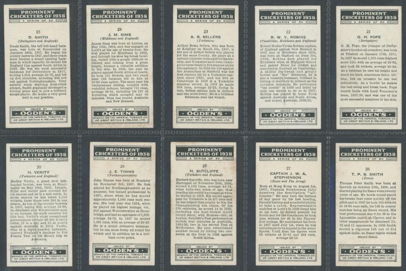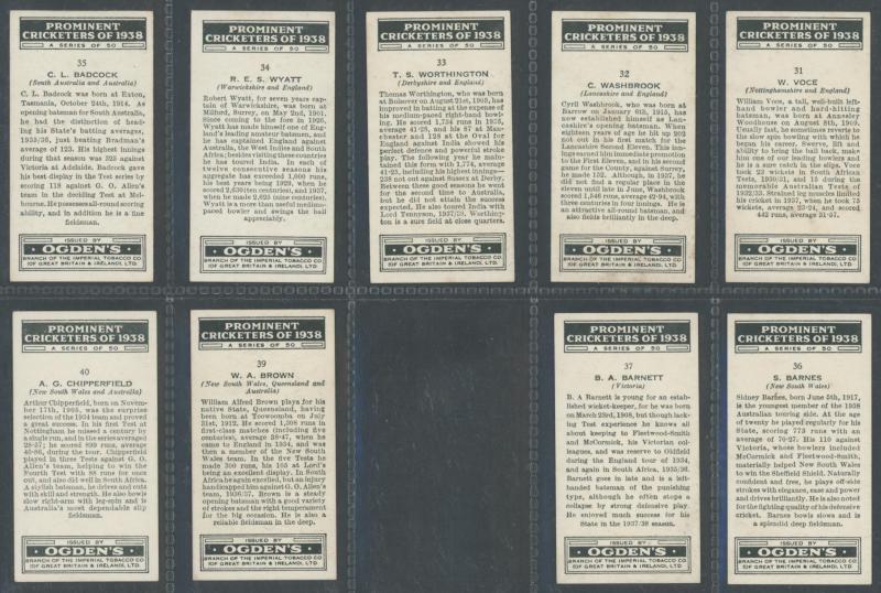 1938 Ogdens 'Prominent Cricketers of 1938' complete set [50], mainly Fine/Very Fine. Cat £130.