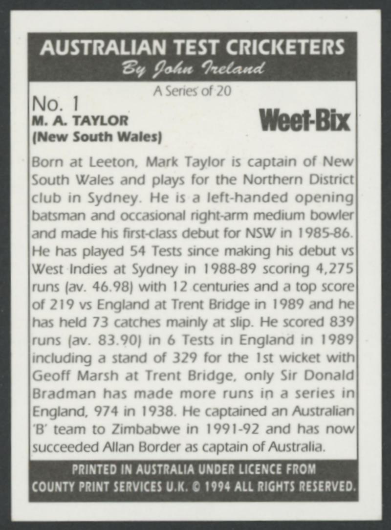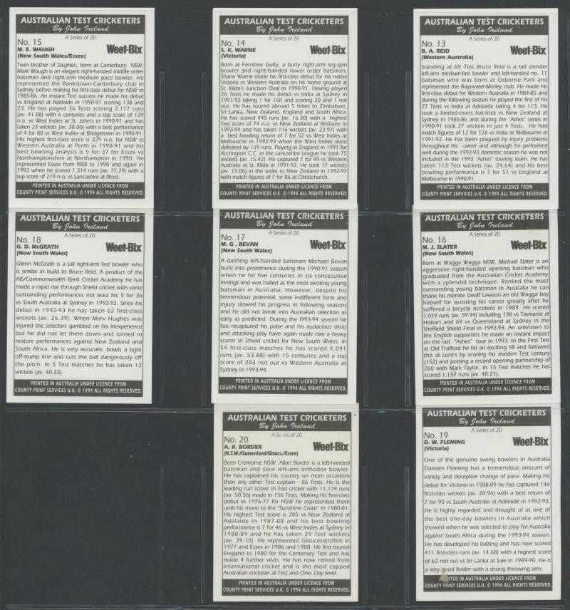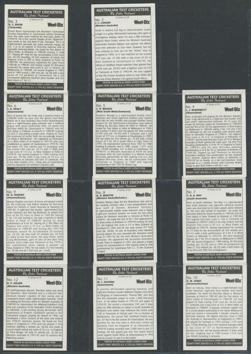 1994 Weet Bix/County Print 'Australian Test Cricketers by John Ireland', complete set [20] all signed including Mark Taylor, Steve
