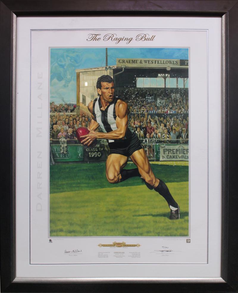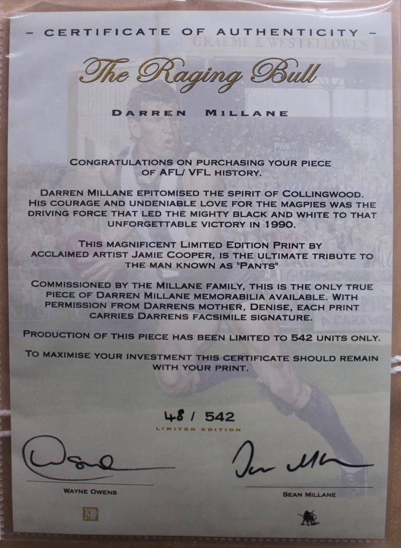COLLINGWOOD: 'The Raging Bull - Darren Millane' print by Jamie Cooper, limited edition 48/542, window mounted, framed & glazed,