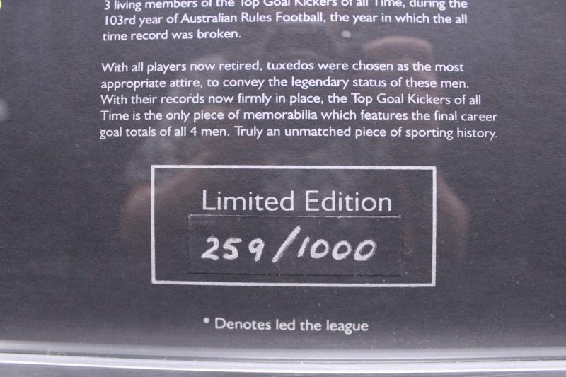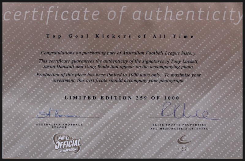 Signed display 'Top Goalkickers of All Time' display comprising photograph signed by Tony Lockett, Jason Dunstall & Doug Wade,