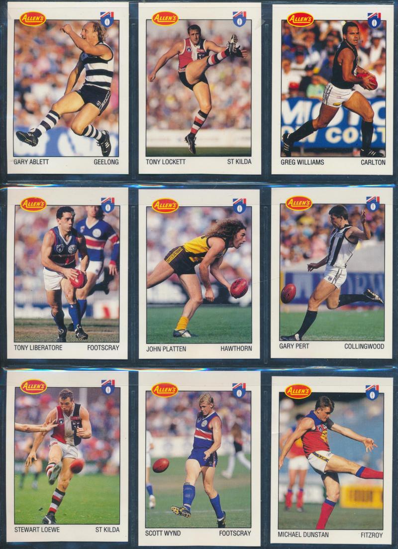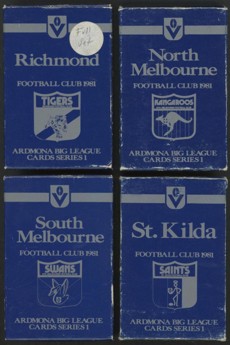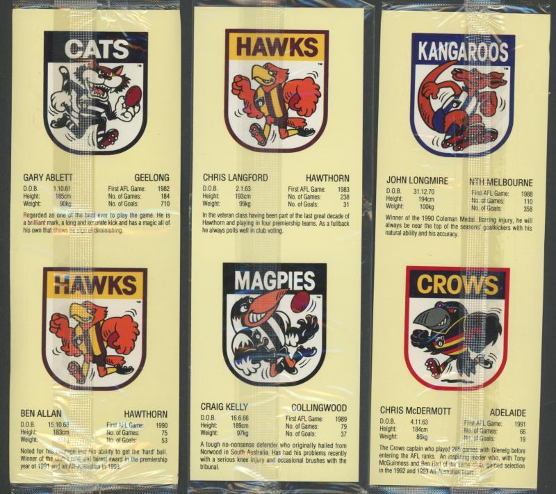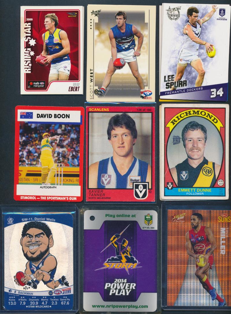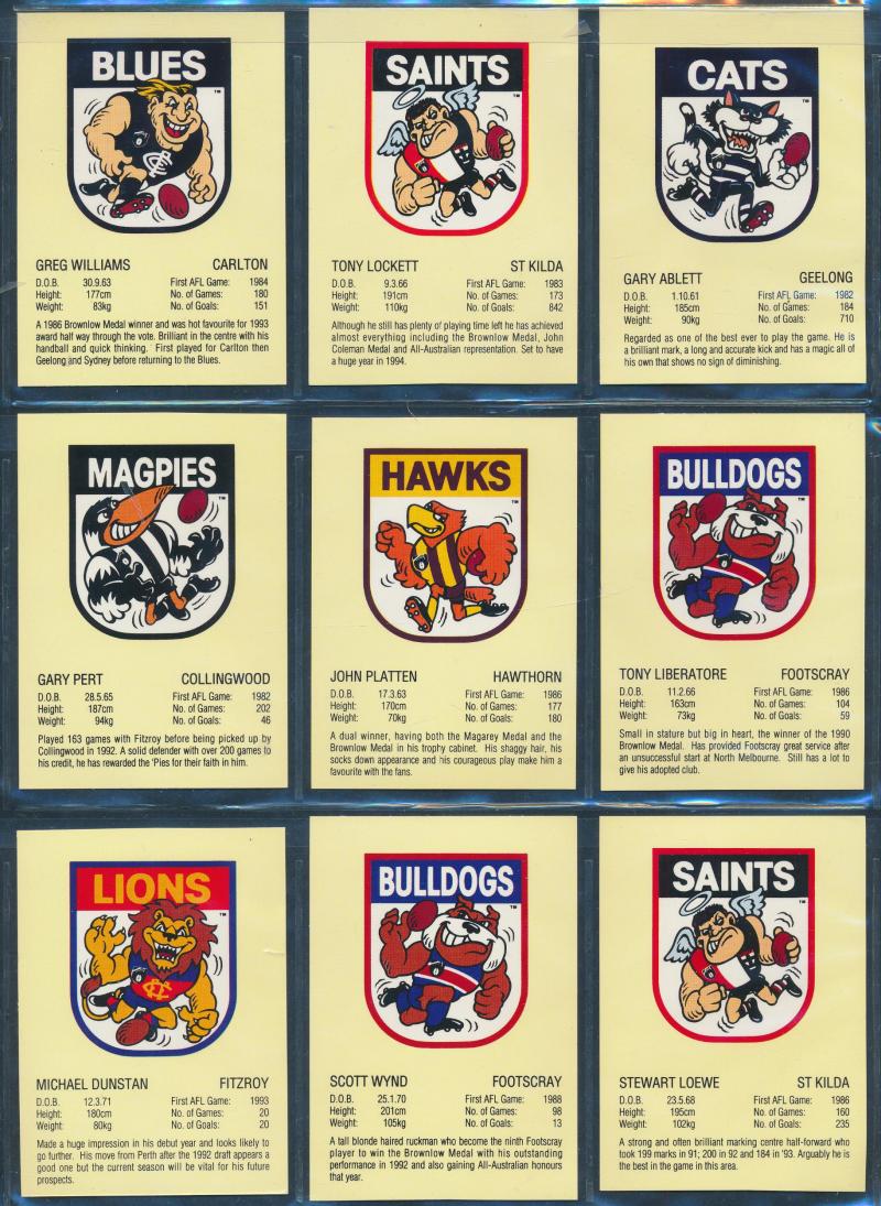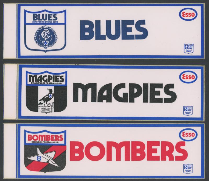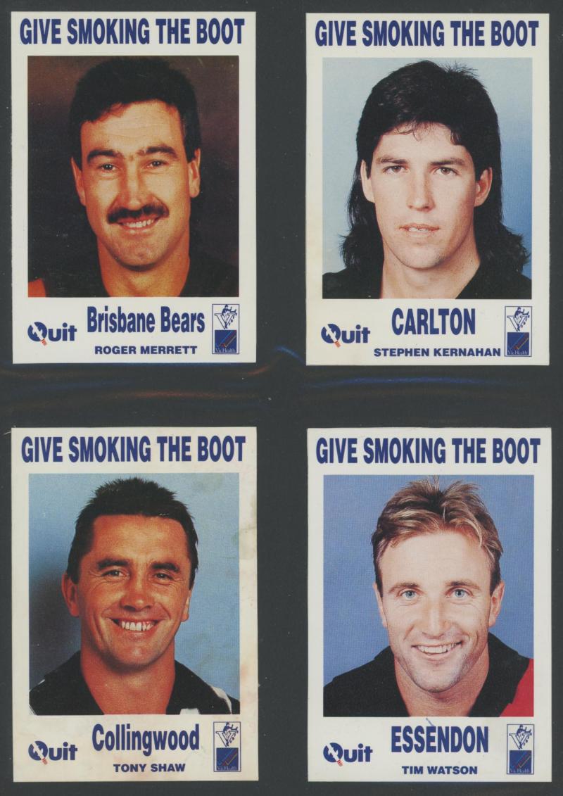 Herald-Sun 'Cartoon Stickers' [12]; 1980 Esso 'VFL Club Emblem Stickers' [12]; 1985 TAB 'I Back Stickers' [12]; 1990 Fox FM 'Fox Stickers' [14]; 1990 Quit 'AFL Captains Stickers' [15]; 1992-94 Quit 'VFA Players Stickers' [12]; 2011 Herald-Sun 'AFL