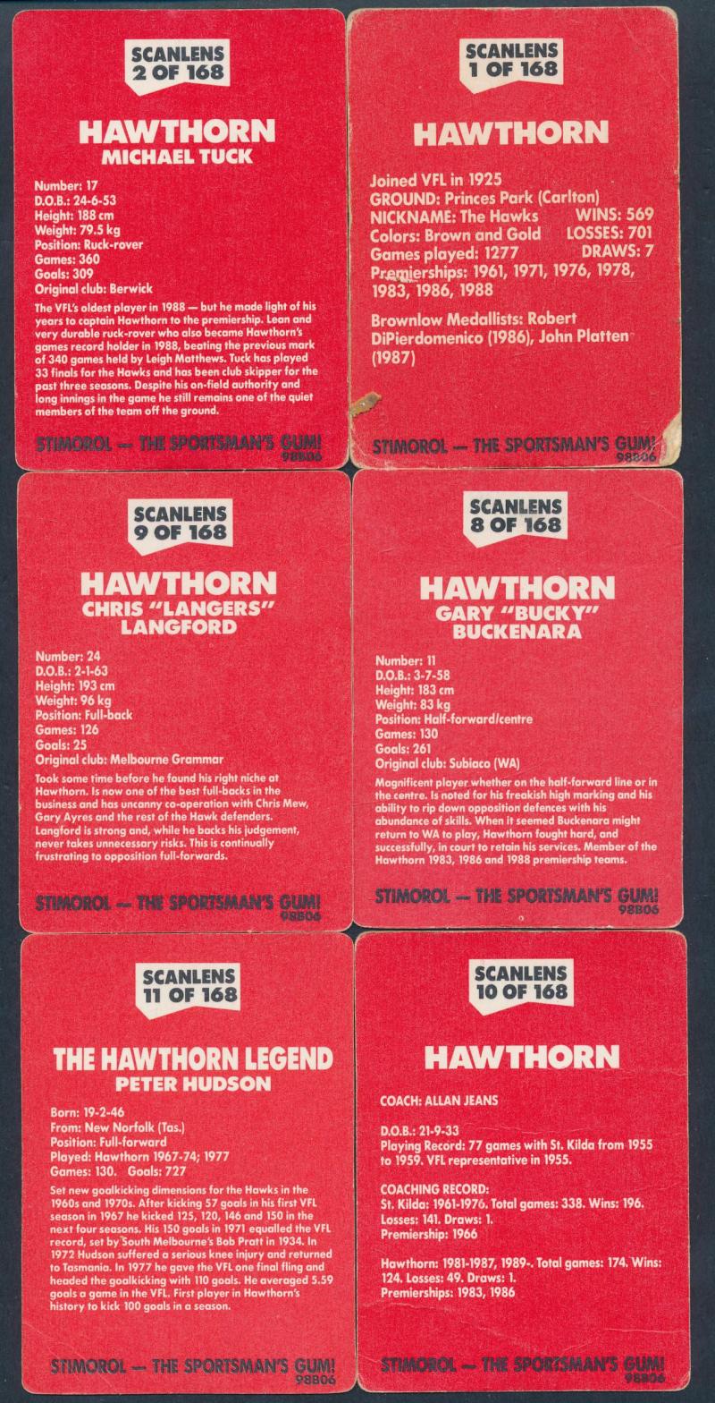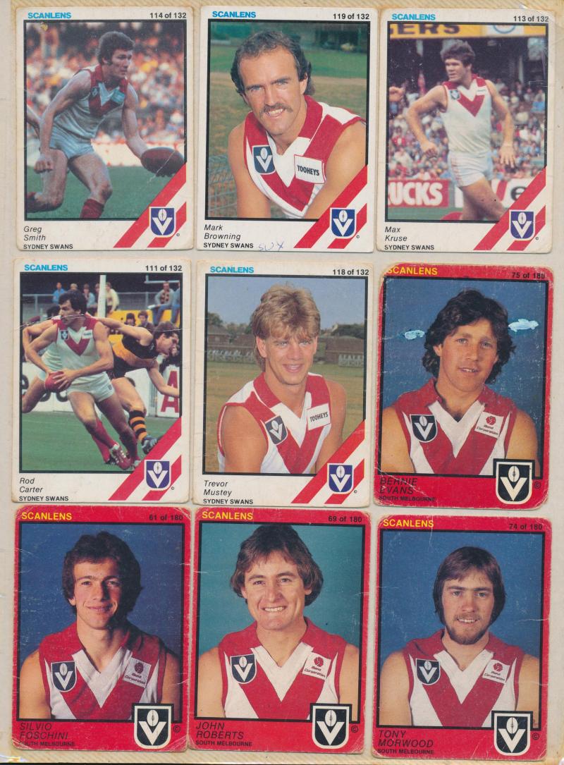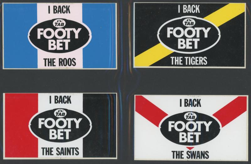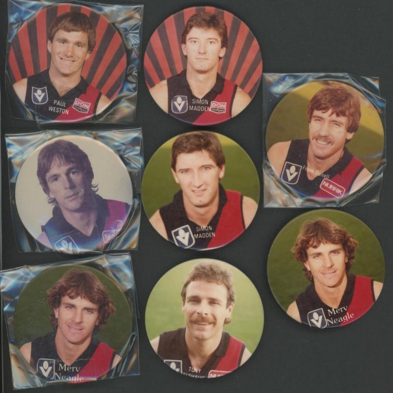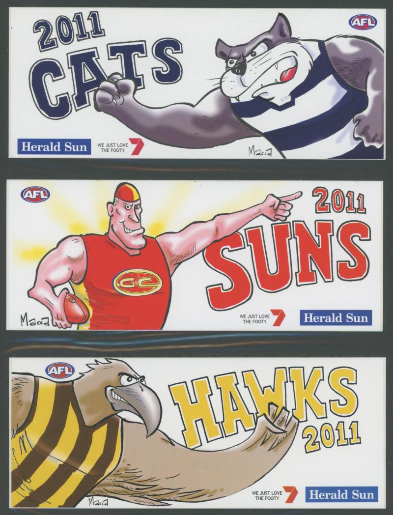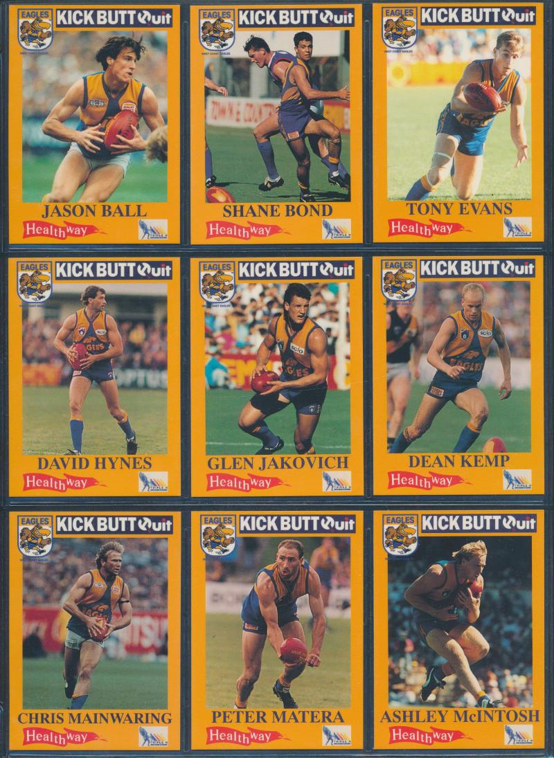 Herald-Sun 'Cartoon Stickers' [12]; 1980 Esso 'VFL Club Emblem Stickers' [12]; 1985 TAB 'I Back Stickers' [12]; 1990 Fox FM 'Fox Stickers' [14]; 1990 Quit 'AFL Captains Stickers' [15]; 1992-94 Quit 'VFA Players Stickers' [12]; 2011 Herald-Sun 'AFL