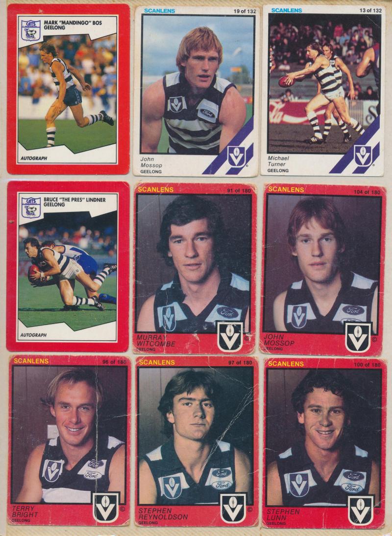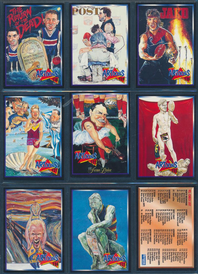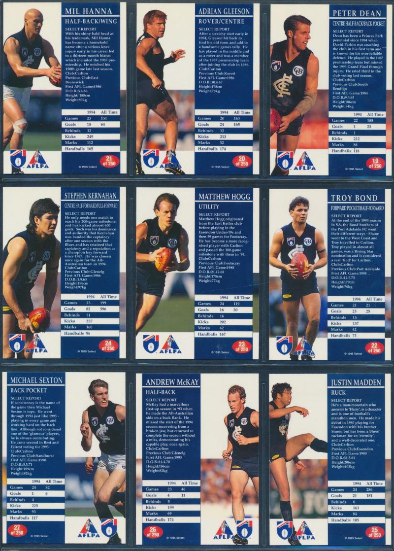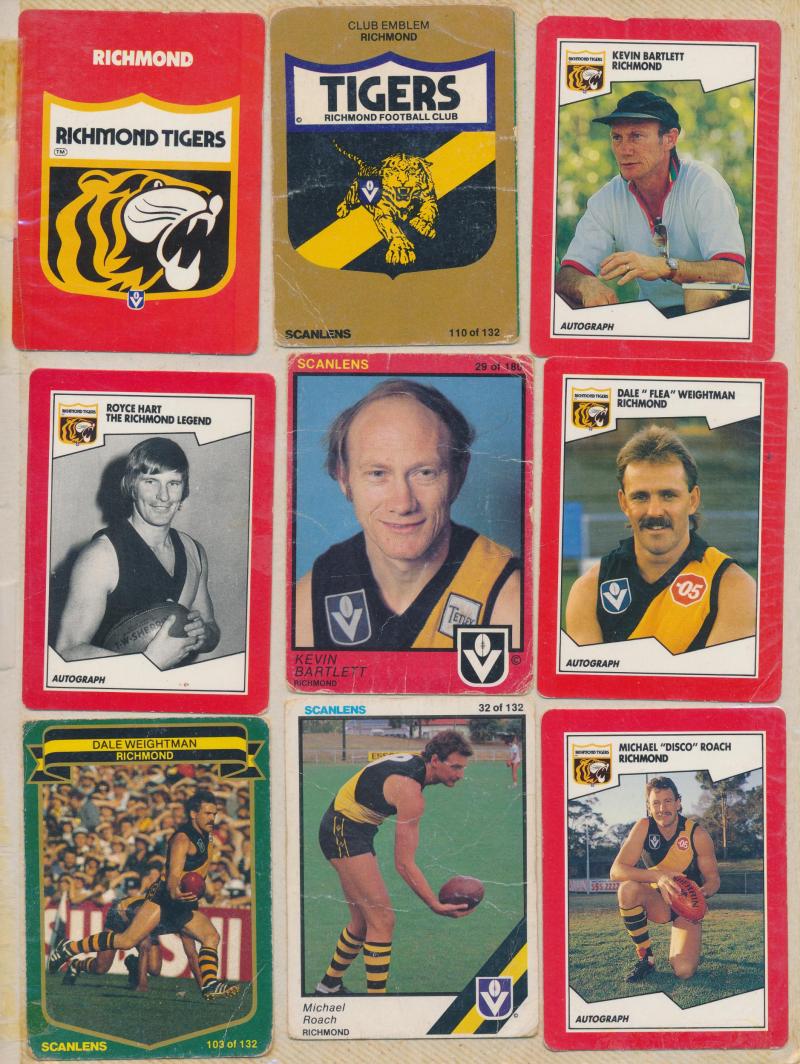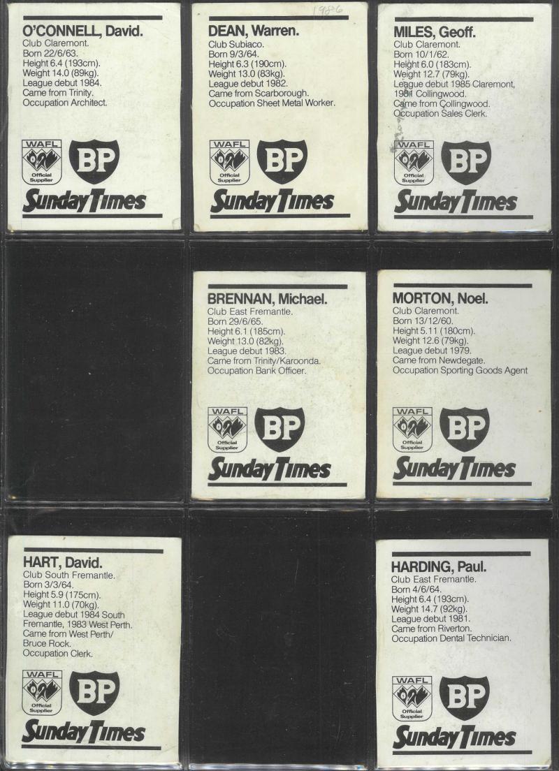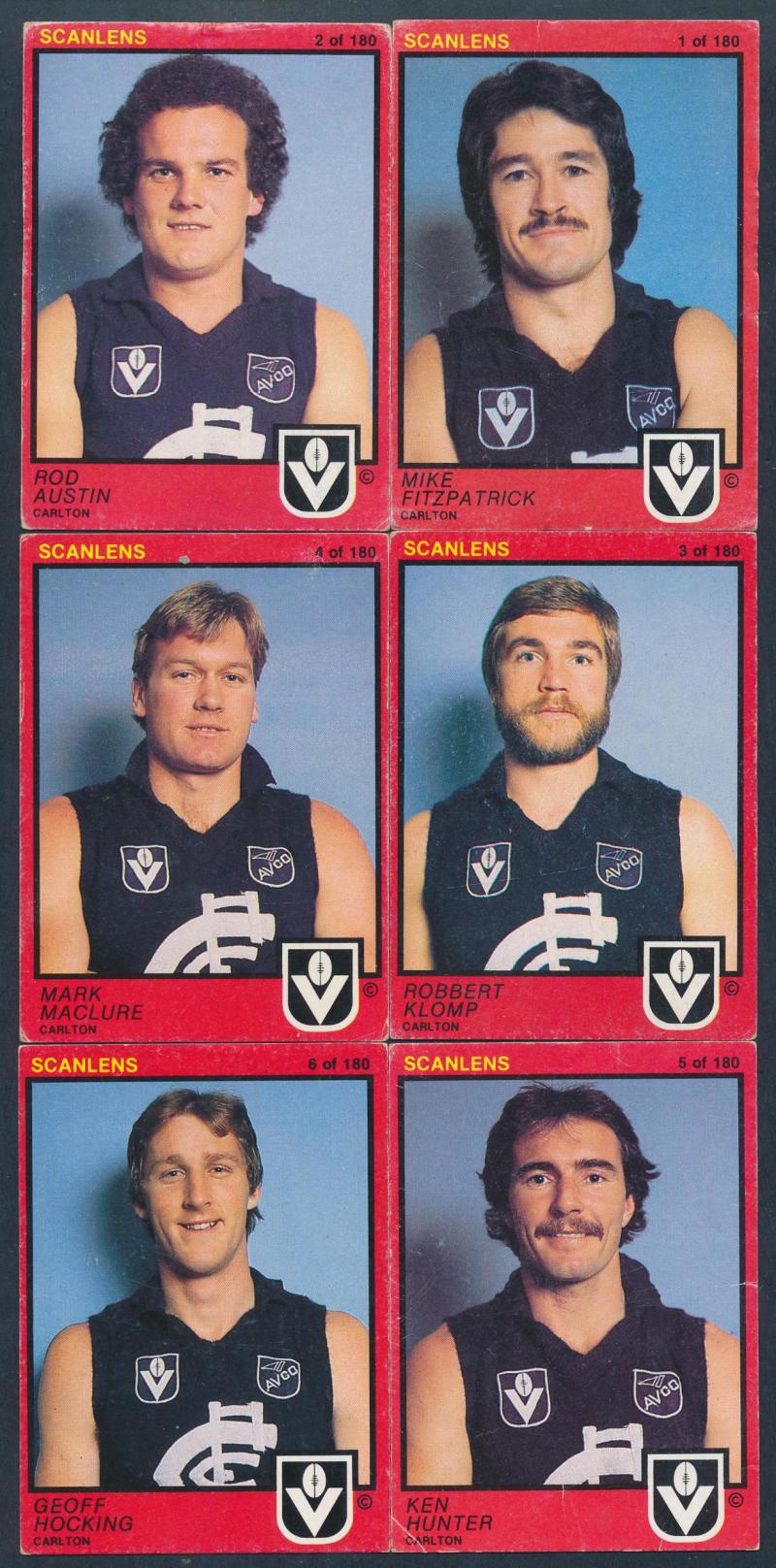 Herald-Sun 'Cartoon Stickers' [12]; 1980 Esso 'VFL Club Emblem Stickers' [12]; 1985 TAB 'I Back Stickers' [12]; 1990 Fox FM 'Fox Stickers' [14]; 1990 Quit 'AFL Captains Stickers' [15]; 1992-94 Quit 'VFA Players Stickers' [12]; 2011 Herald-Sun 'AFL