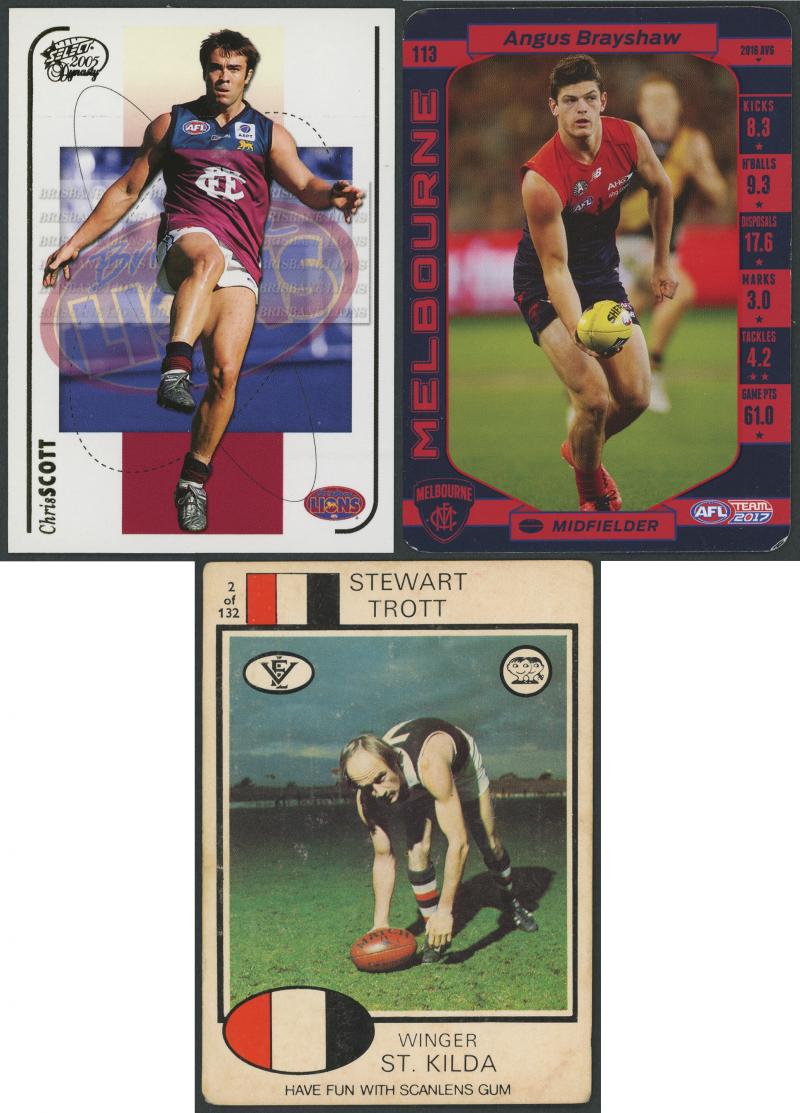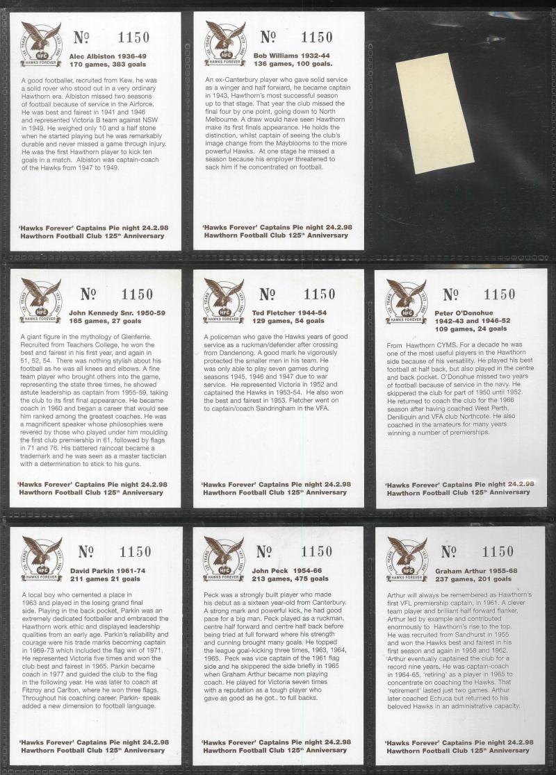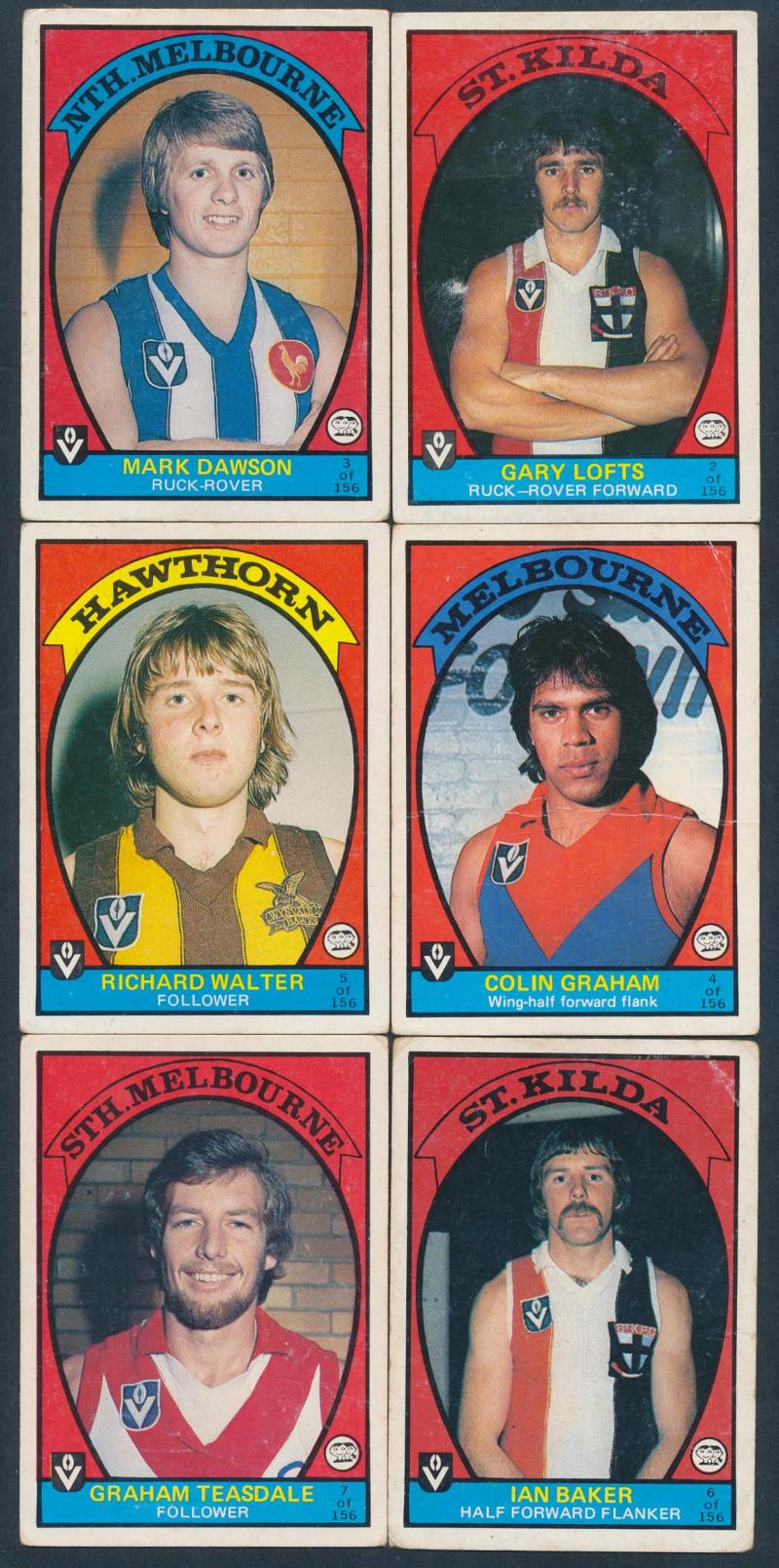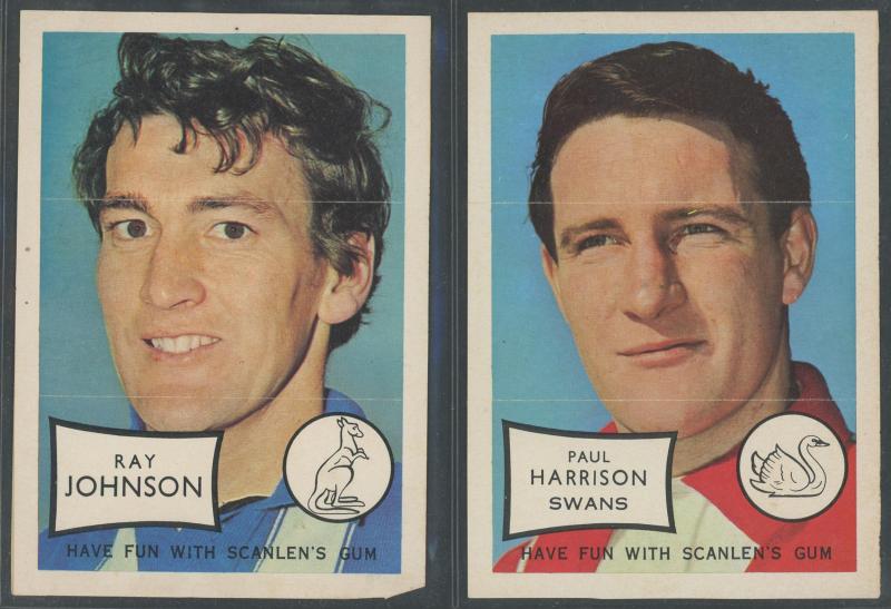 [47/64]; 1970 Scanlens mini-posters [2/12]; 1998 Hawks Forever 'Hawthorn Captains' [15]; 1998 Brusseze 'Bomber Legends' [10 + Title Card]; 1998 Brusseze 'Footscray Legends' [15 + Title Card], mainly Fine/Very Fine.